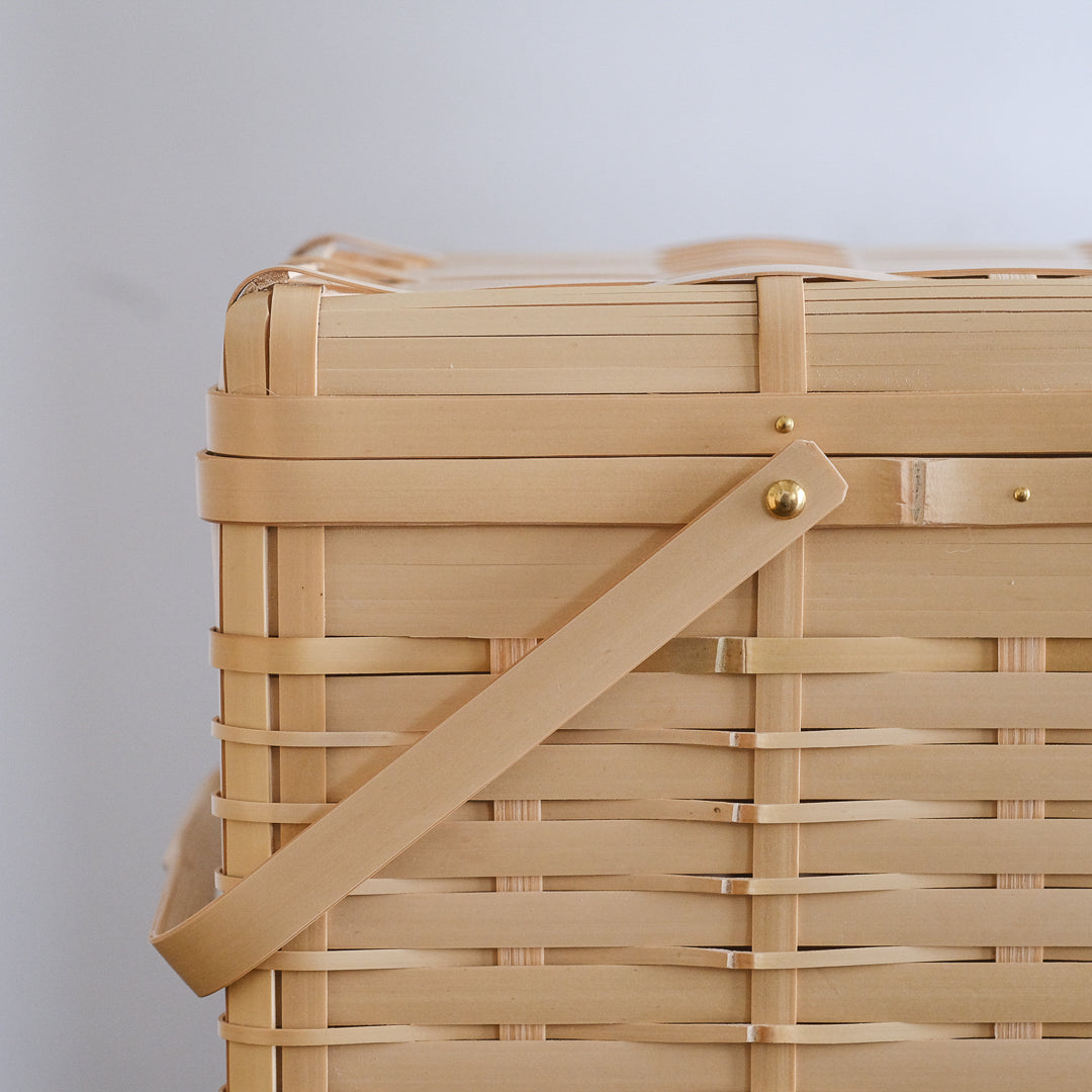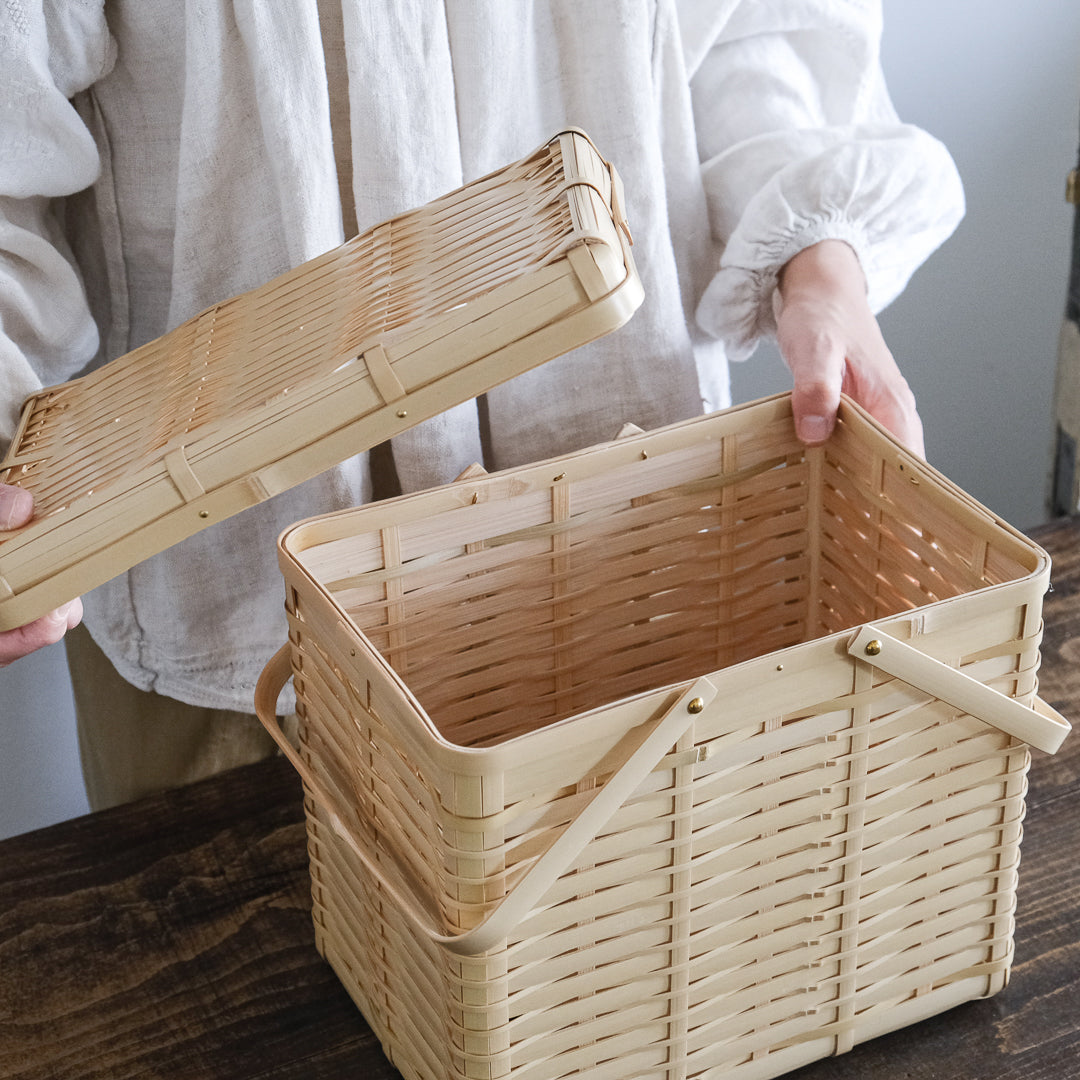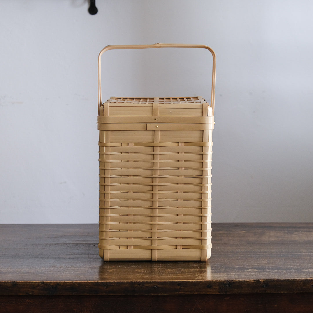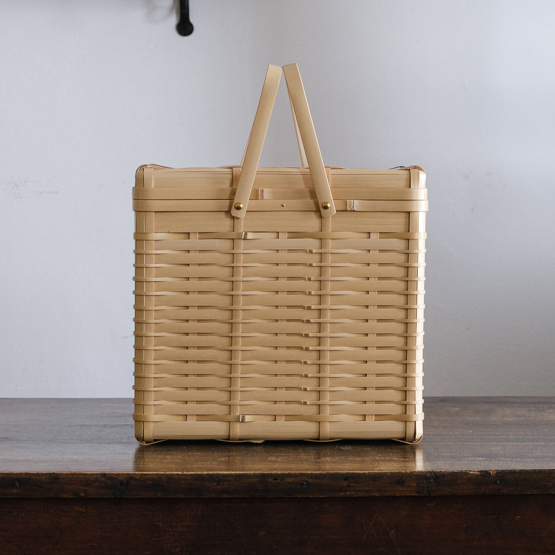 別府竹細工の手法でかごを編む、福田真理子さんによる竹かご。本を収納したり、高さのあるものを持ってピクニックへ。縦長のボックスは色々なシーンで活躍しそうです。きゅっとした編み目、角の立った美しい形は置いてあるだけでさまになります。