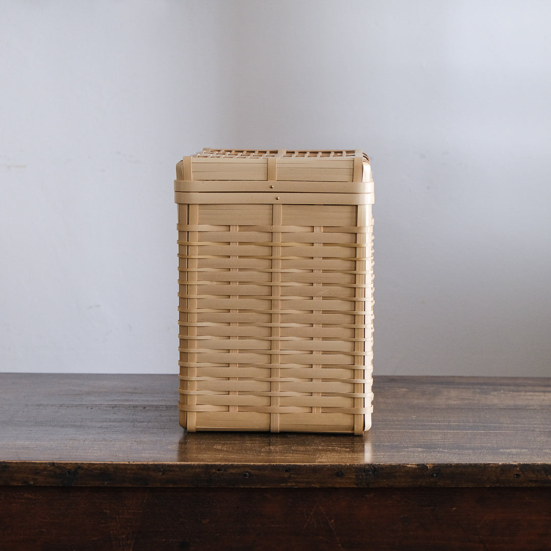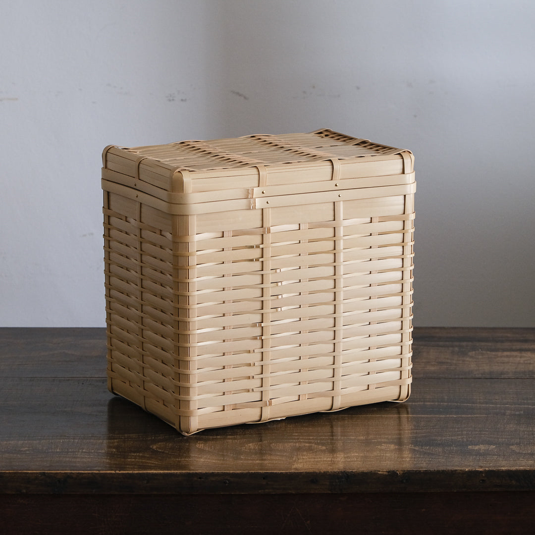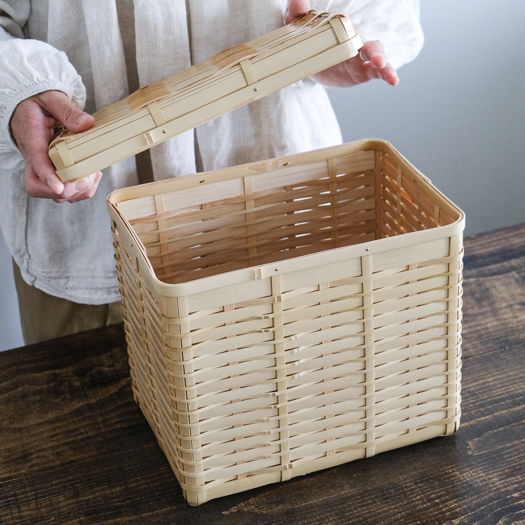 中身の見えないふたつきのかごは汎用性も高く、縦長の形は納まりもよいのでいろいろな場所で活躍しそうです。ふたもかちっときれいに閉まるので、心地よく開閉動作ができます。素材は真竹。その真竹に熱処理を施し、油や色を抜いた「白竹」を使い編まれています。白竹のみずみずしい透明感は、明るく上品な印象をもたらします。