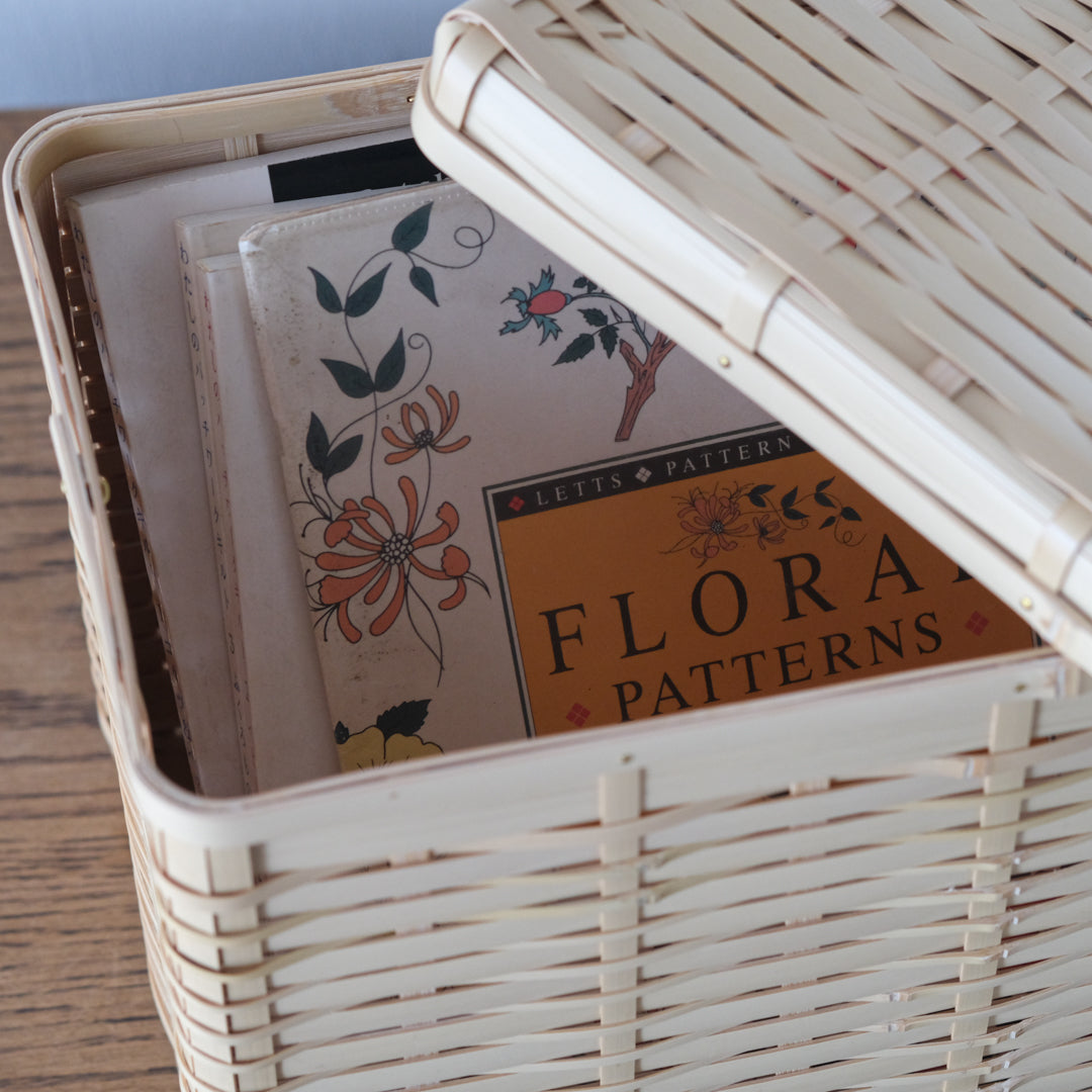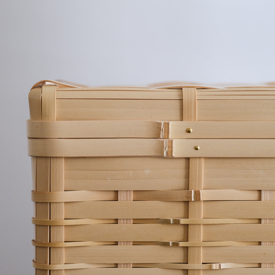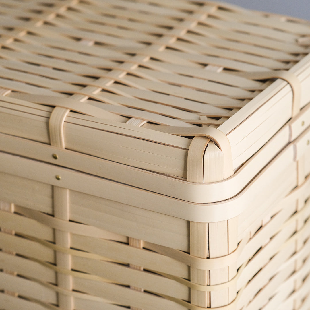 中身の見えないふたつきのかごは汎用性も高く、縦長の形は納まりもよいのでいろいろな場所で活躍しそうです。ふたもかちっときれいに閉まるので、心地よく開閉動作ができます。素材は真竹。その真竹に熱処理を施し、油や色を抜いた「白竹」を使い編まれています。白竹のみずみずしい透明感は、明るく上品な印象をもたらします。