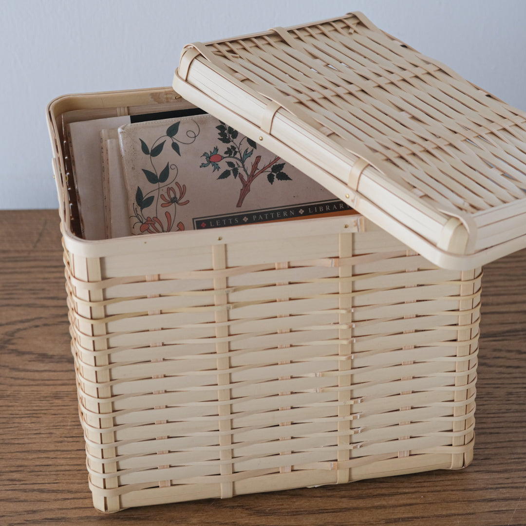縦長の端正な形をしたふたつきのかご。シンプルなつくりだからこそ際立つ、角がしっかりと立ったフォルムがいちばんの特長です。