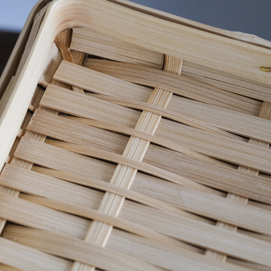 ボックスは細やかにきゅっと編まれています。竹を細く割ったひごが規則的に通る編み目はリズムがよく、シンプルでモダン。細いボーダーを連想させます。福田さんは、師匠から教わった竹割包丁という基本の包丁と手感覚でひごを整えています。そのため編み上げるときにもひごの幅が均一でないので、感覚で調整しながら高さをそろえていくそう。