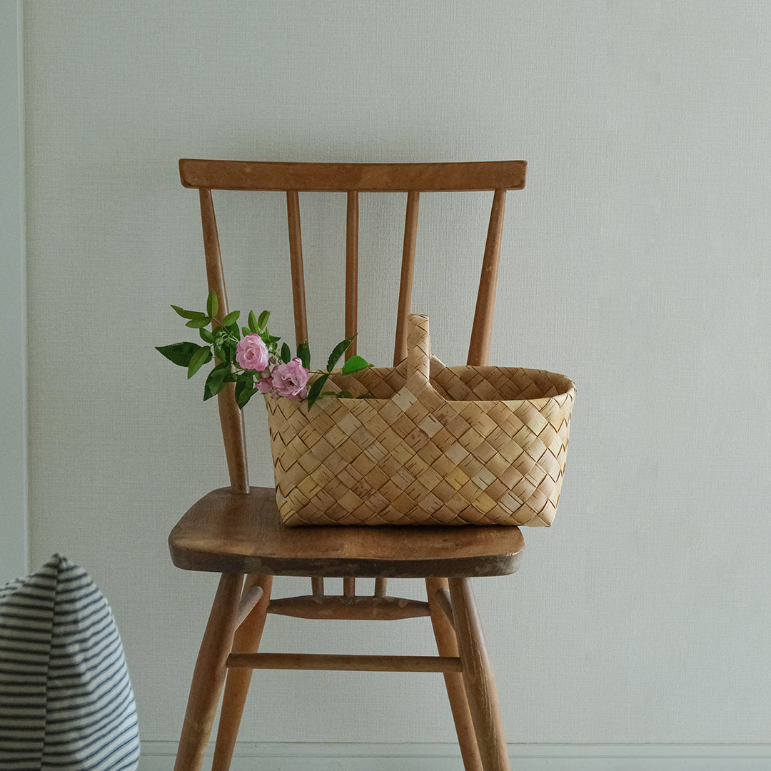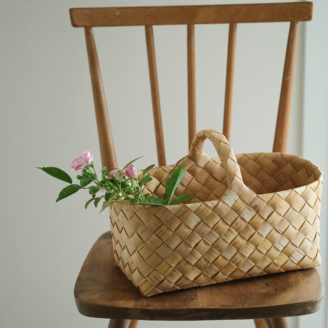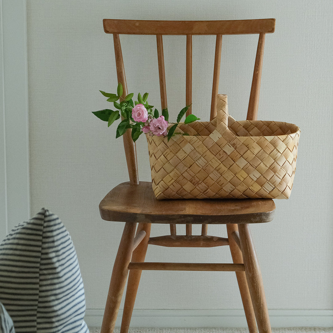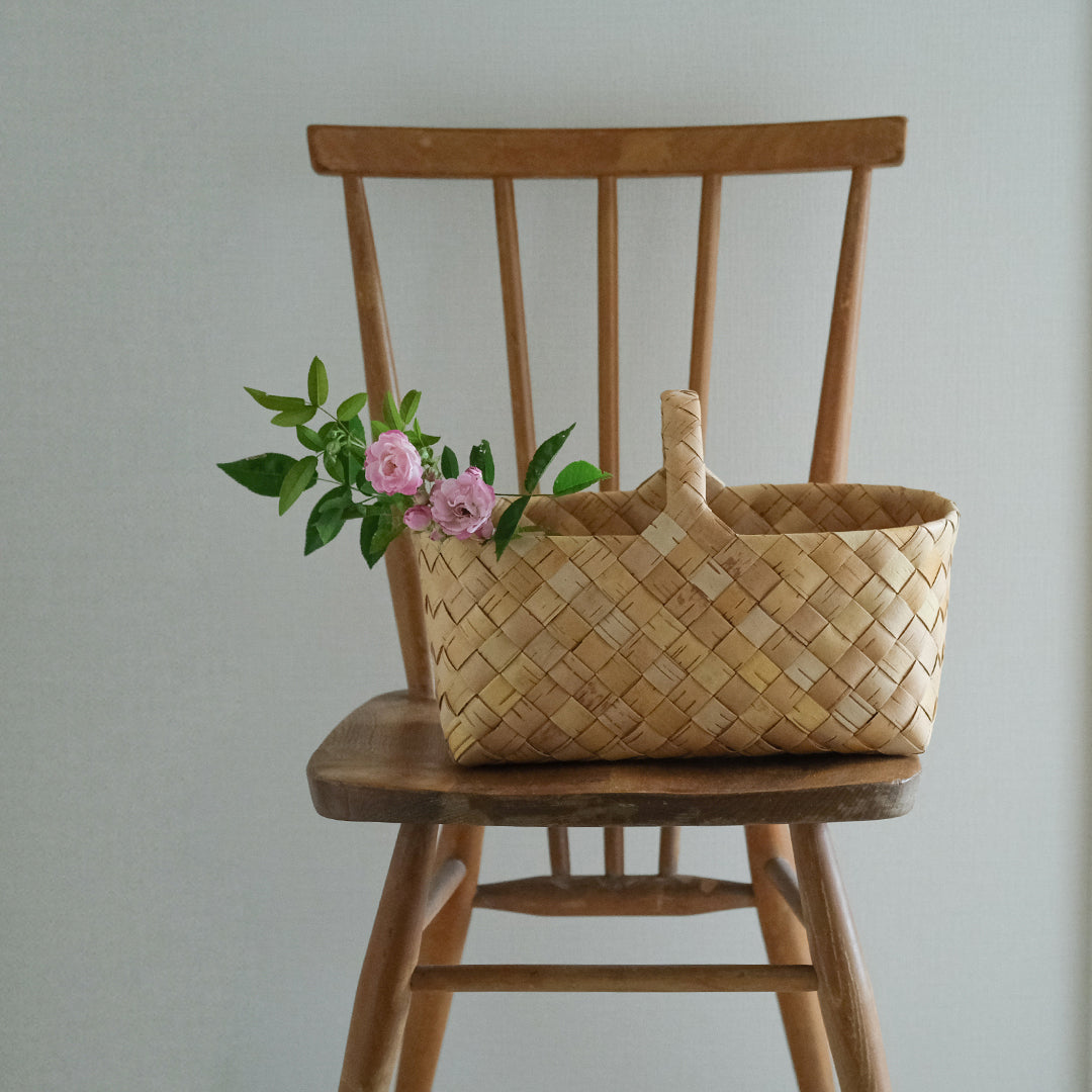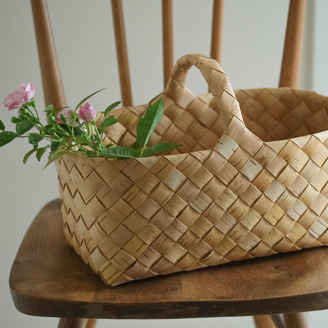 しなやかな白樺の木の皮でしっかりと編まれたかごは、時間の経過をゆっくりと感じさせ、日常の一つひとつを丁寧に大切にしたくなるようなやさしい空気をまとっています。