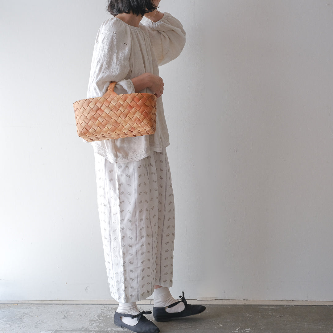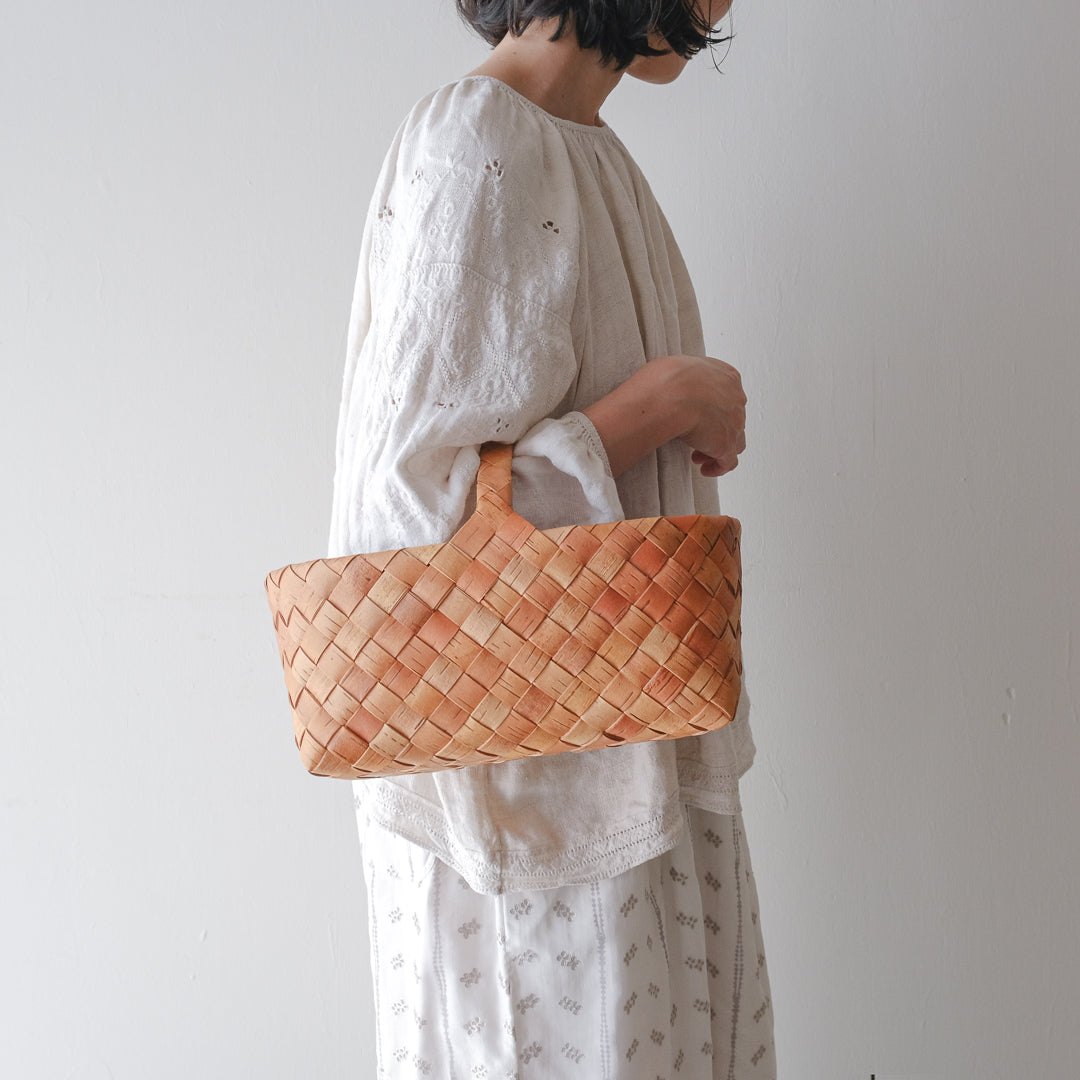 ぎゅっと編まれたFACTOREMの白樺かごは、ずっと握って持っていたいような持ち心地のよさを感じます。白樺の皮はまるでしなやかなレザーのようです。