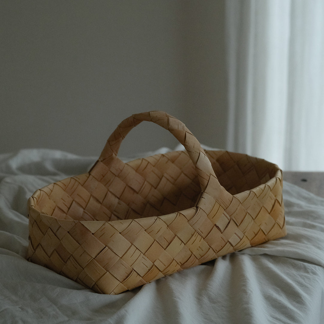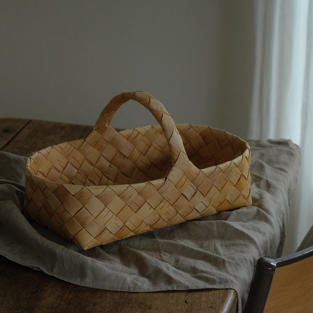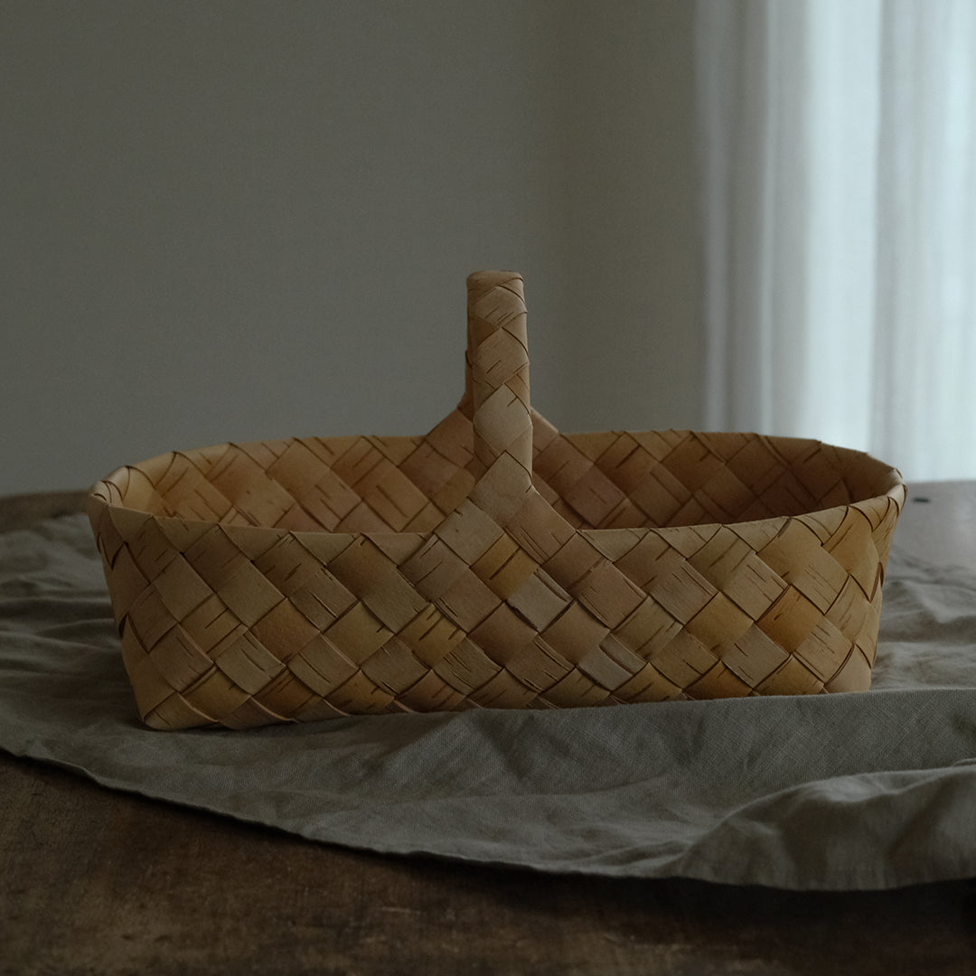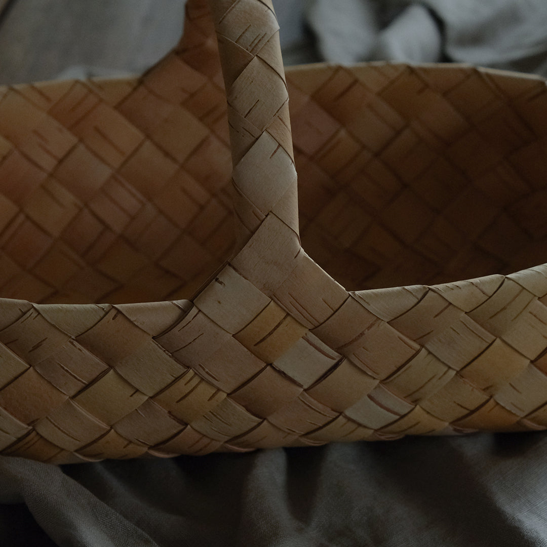 しなやかな白樺の木の皮でしっかりと編まれた白樺かごは、時間の経過をゆっくりと感じさせ、日常の一つひとつを丁寧に大切にしたくなるようなやさしい空気をまとっています。
