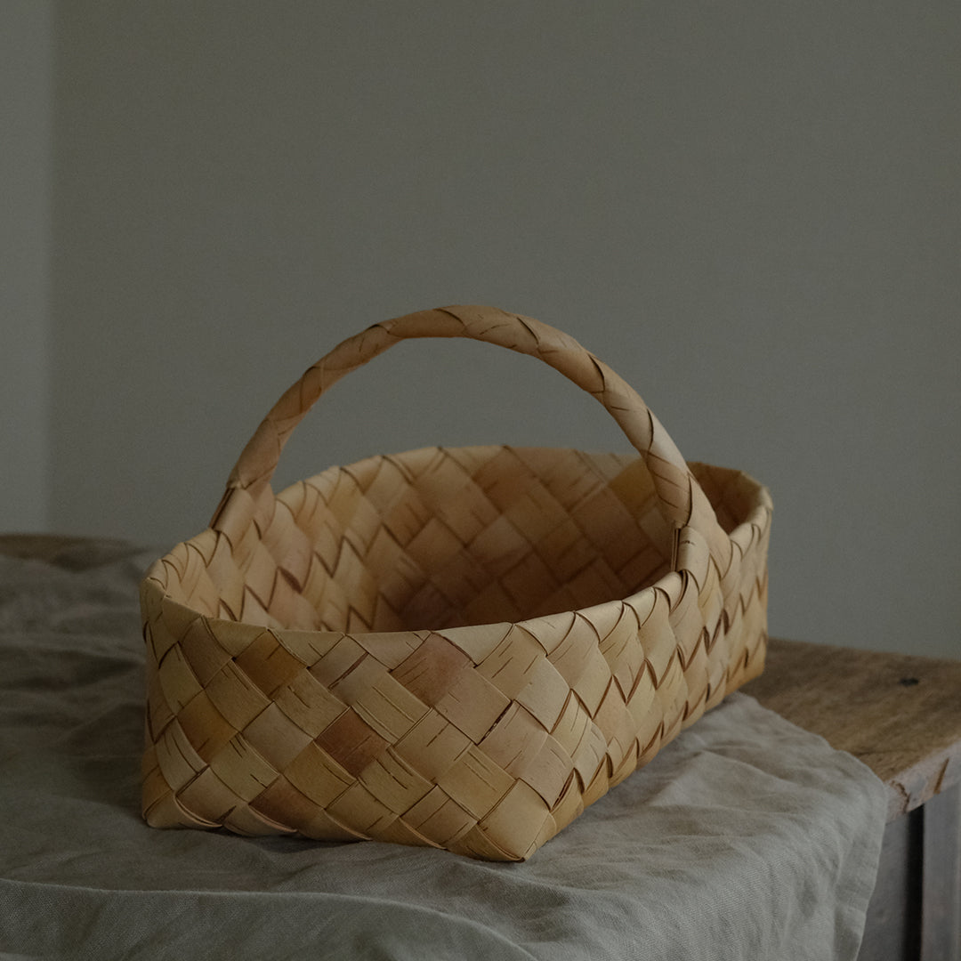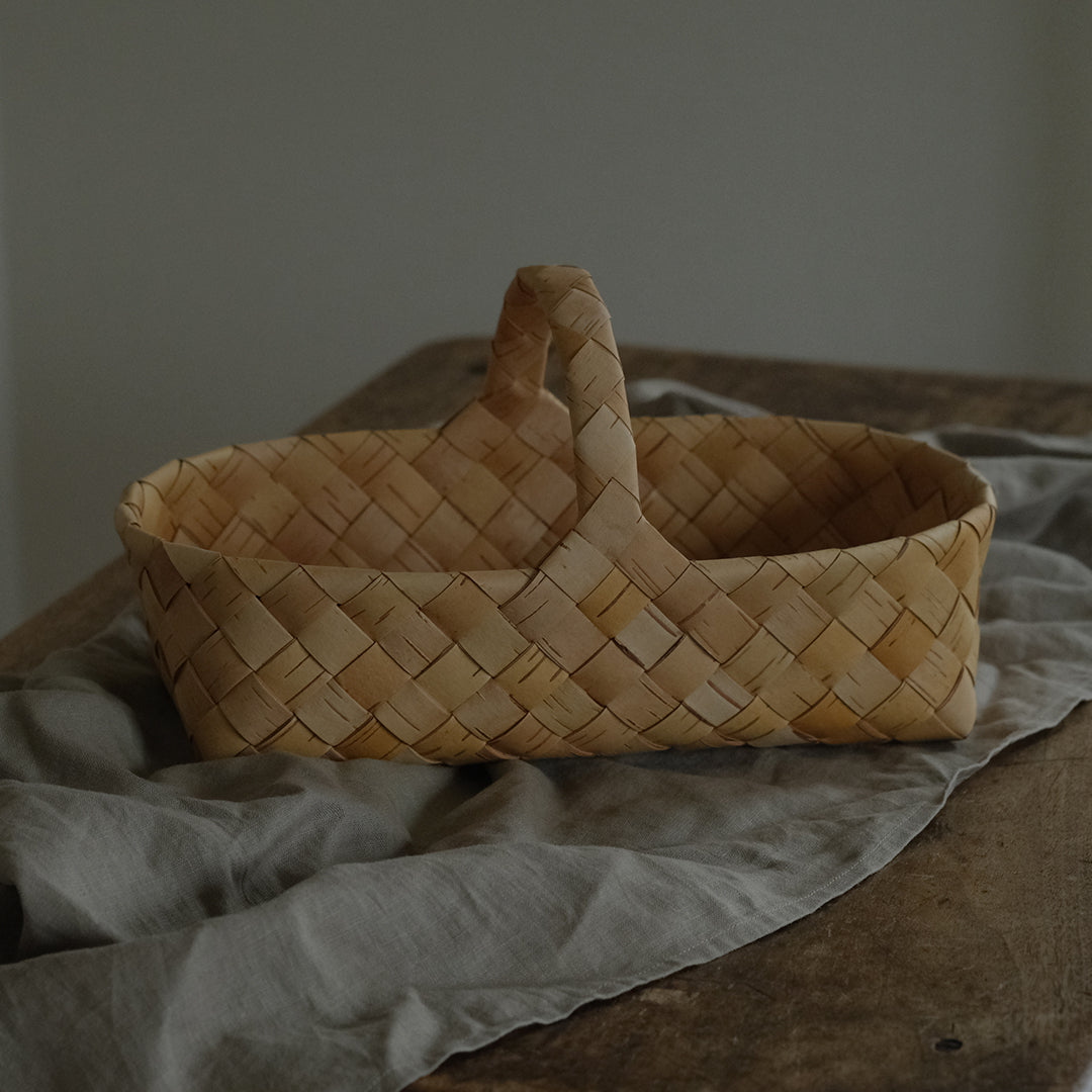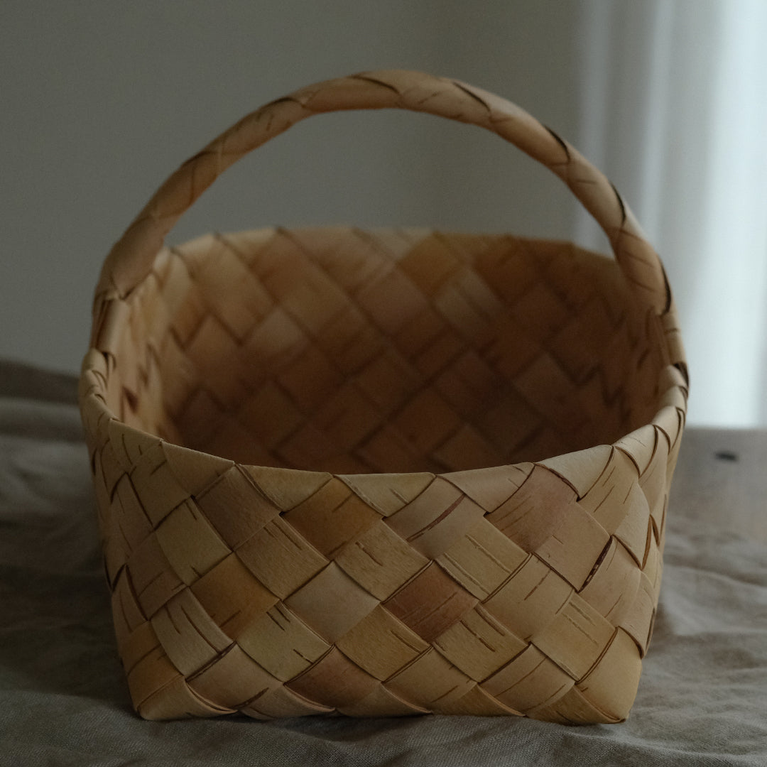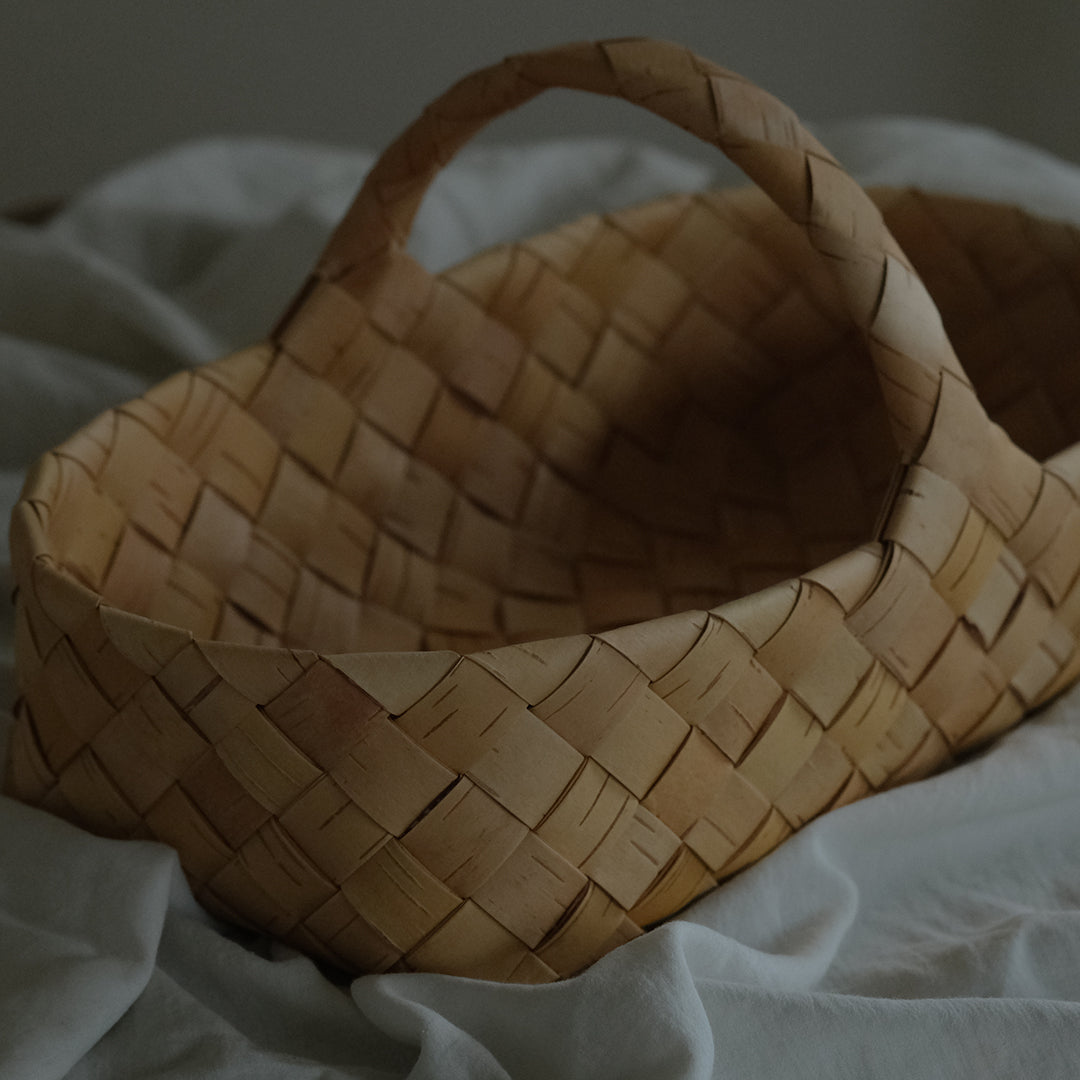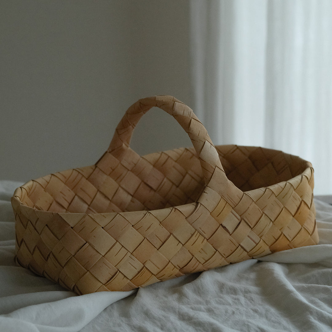しなやかな白樺の木の皮でしっかりと編まれた白樺かごは、時間の経過をゆっくりと感じさせ、日常の一つひとつを丁寧に大切にしたくなるようなやさしい空気をまとっています。