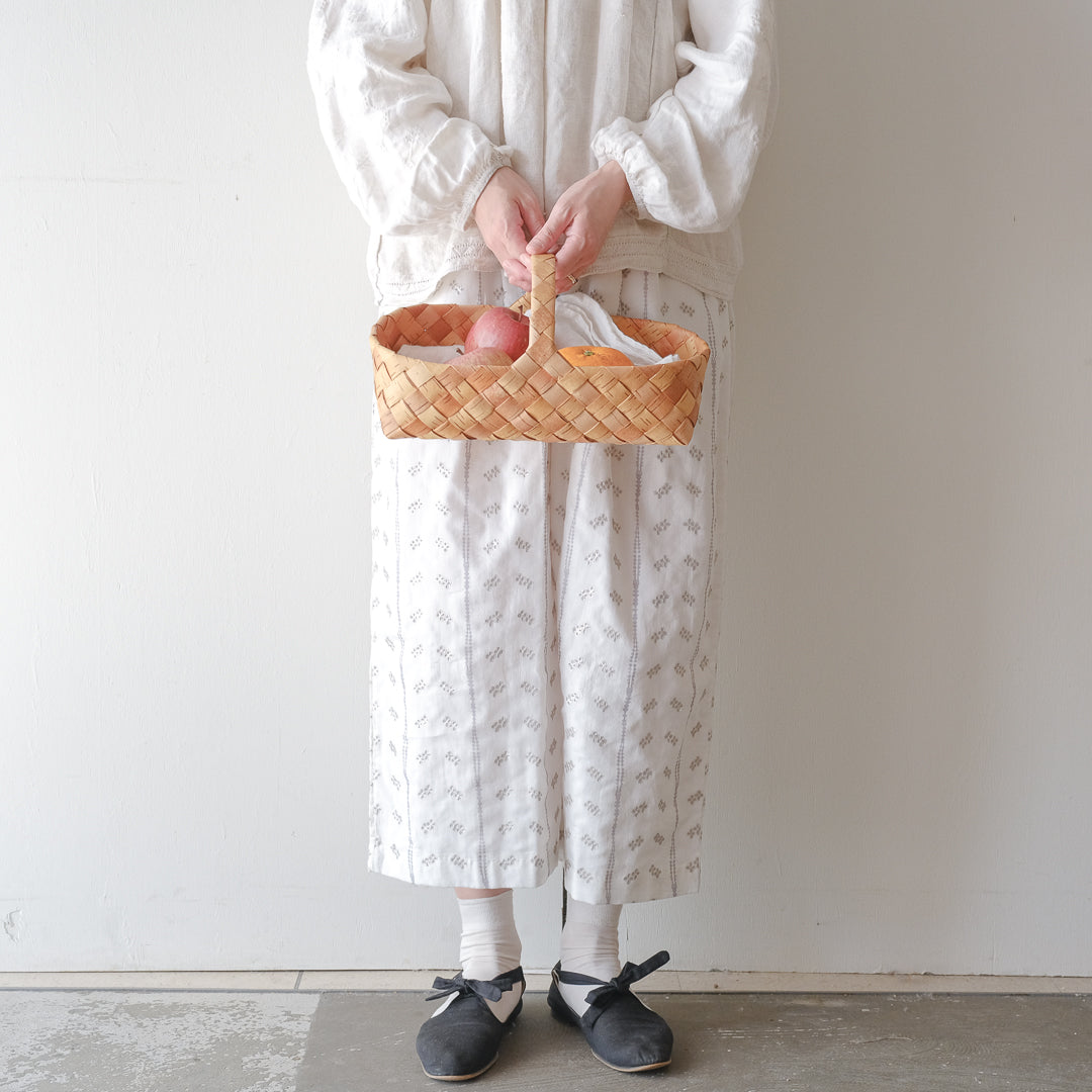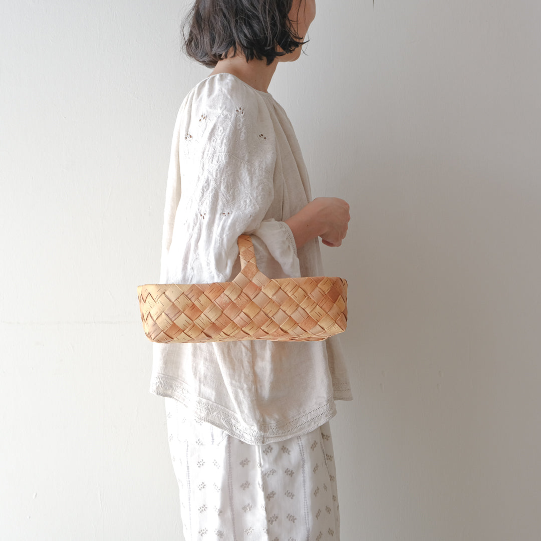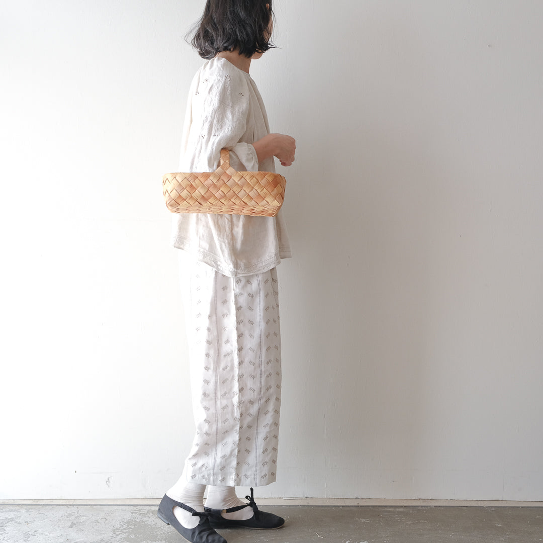 ぎゅっと編まれたFACTOREMの白樺かごは、ずっと握って持っていたいような持ち心地のよさを感じます。白樺の皮はまるでしなやかなレザーのようです。▲コーディネート/上:スタッフ私物 下:[BUNON]Embroidery Tuck Pants