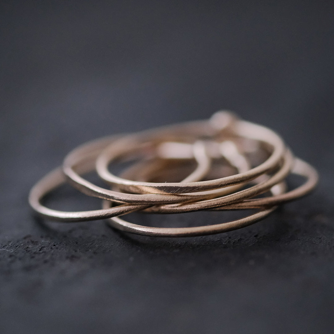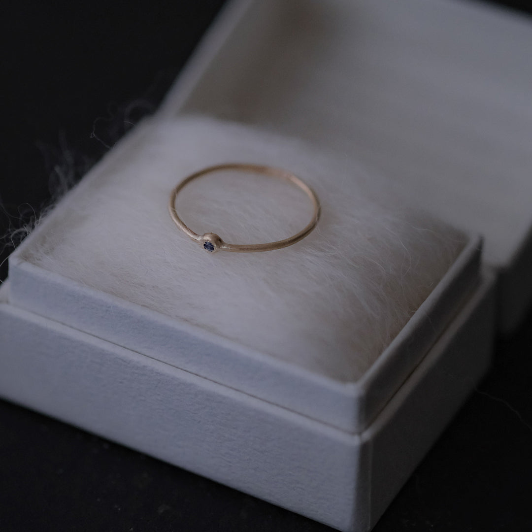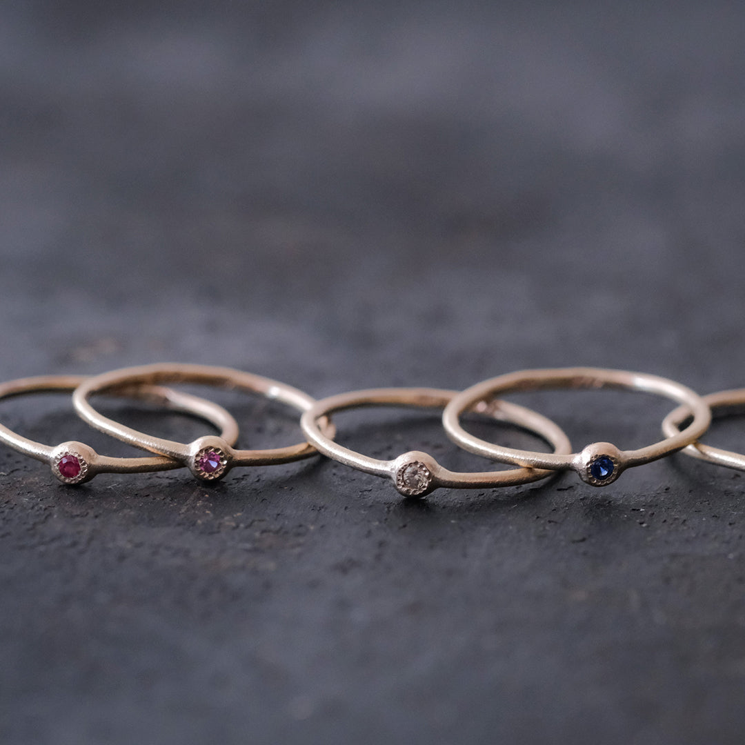 red、pink、green、blueの4色のサファイアを使ったリング。光に反射する石の美しさと手仕事のあたたかさを感じます。繊細なリングだから、重ね付けをしたりほかのアクセサリーと合わせて楽しめるのも魅力。ピンキーリングとしても使える小さめのサイズもご用意しました。すべて1点ものなので、気になる方はお早めに。