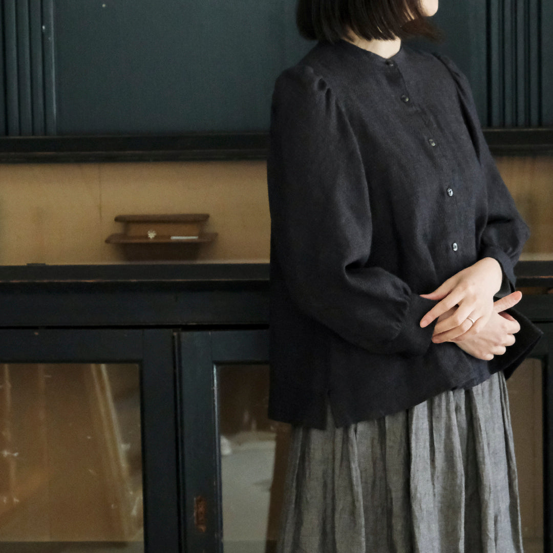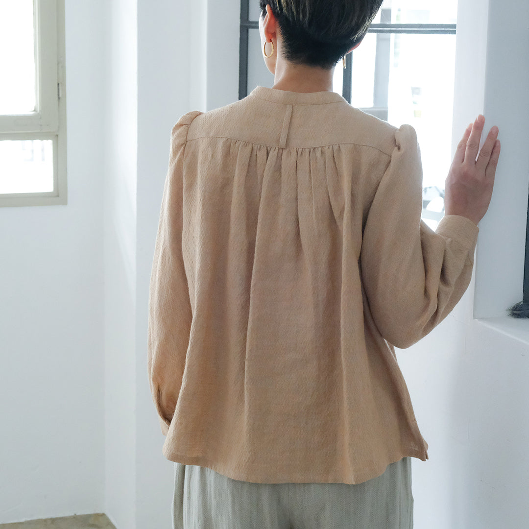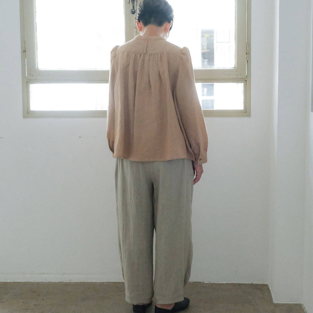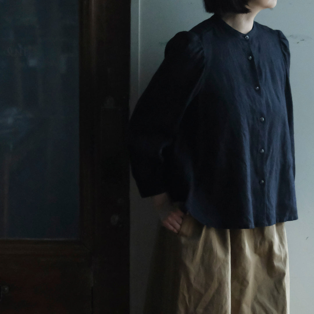 パターンはライトウェイトリネンでつくったパフスリーブシャツと同じですが、生地がしっかりした分、「Aラインのシルエット」や「袖山のフォルム」を楽しめるところも魅力です。リネン素材ですので、お手入れ後はお好みのボリューム感がつくれます。くったりさせて袖山を馴染ませることも可能です。