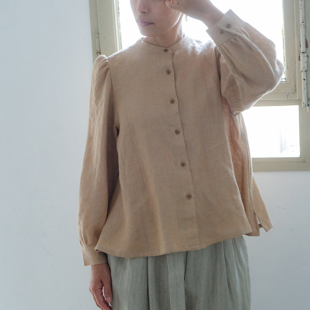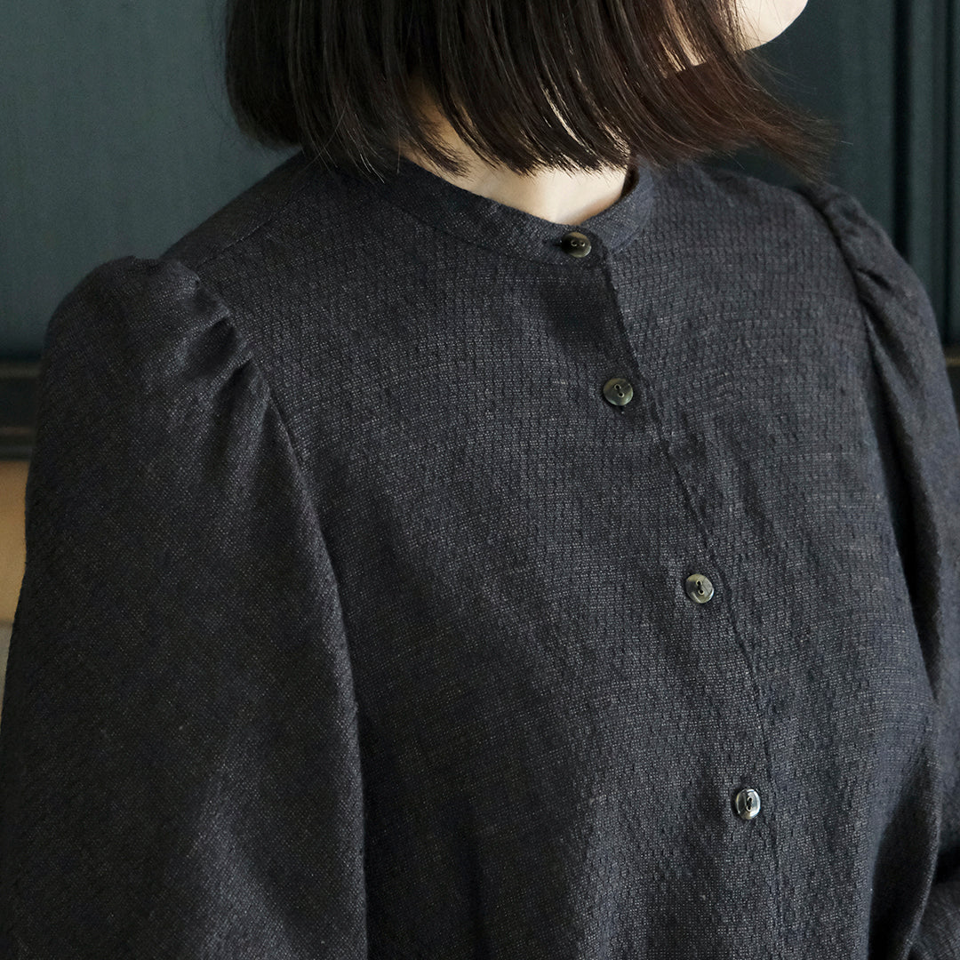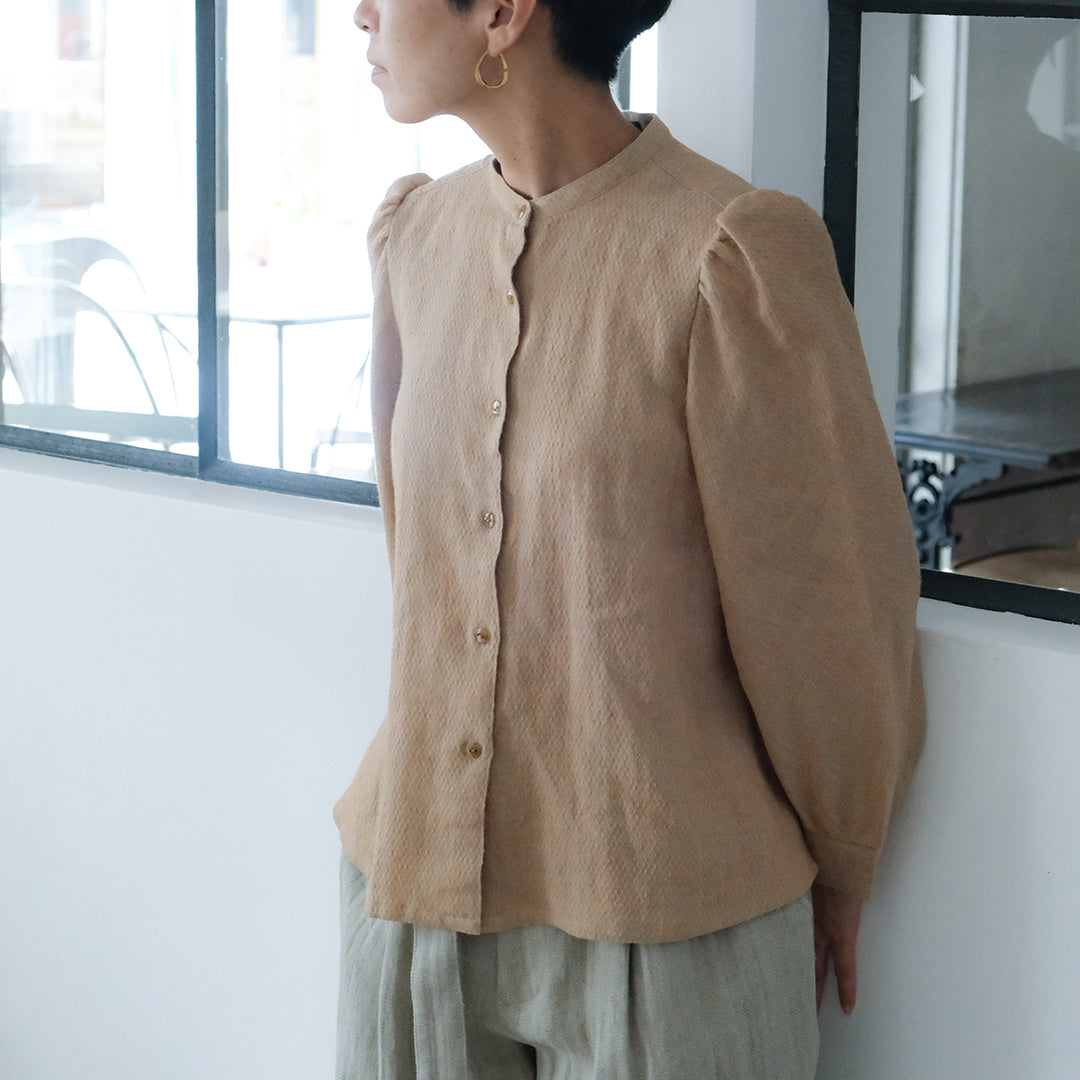 パターンはライトウェイトリネンでつくったパフスリーブシャツと同じですが、生地がしっかりした分、「Aラインのシルエット」や「袖山のフォルム」を楽しめるところも魅力です。リネン素材ですので、お手入れ後はお好みのボリューム感がつくれます。くったりさせて袖山を馴染ませることも可能です。