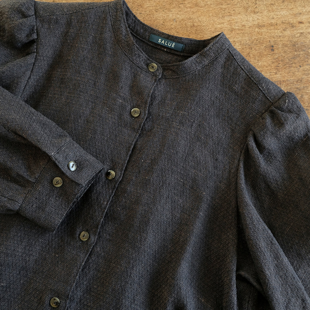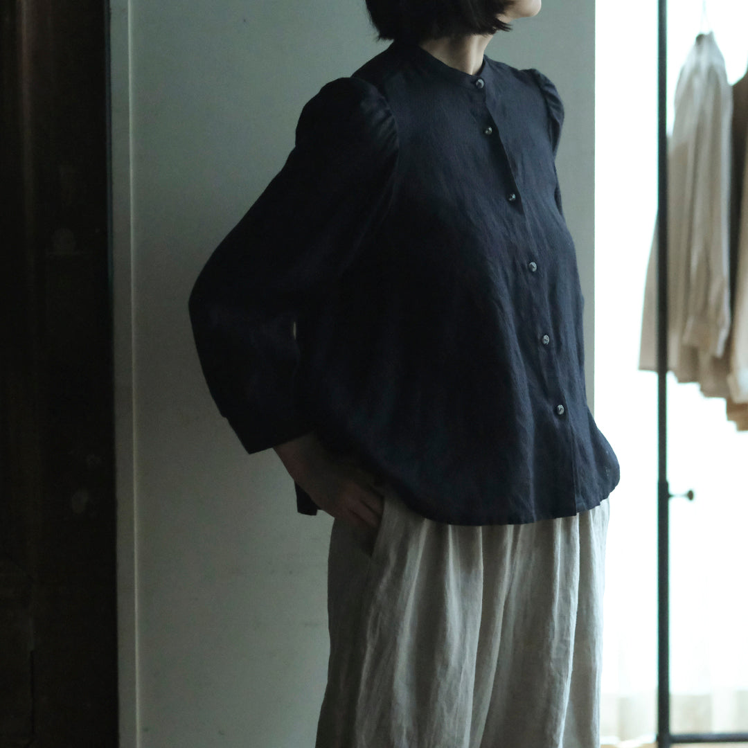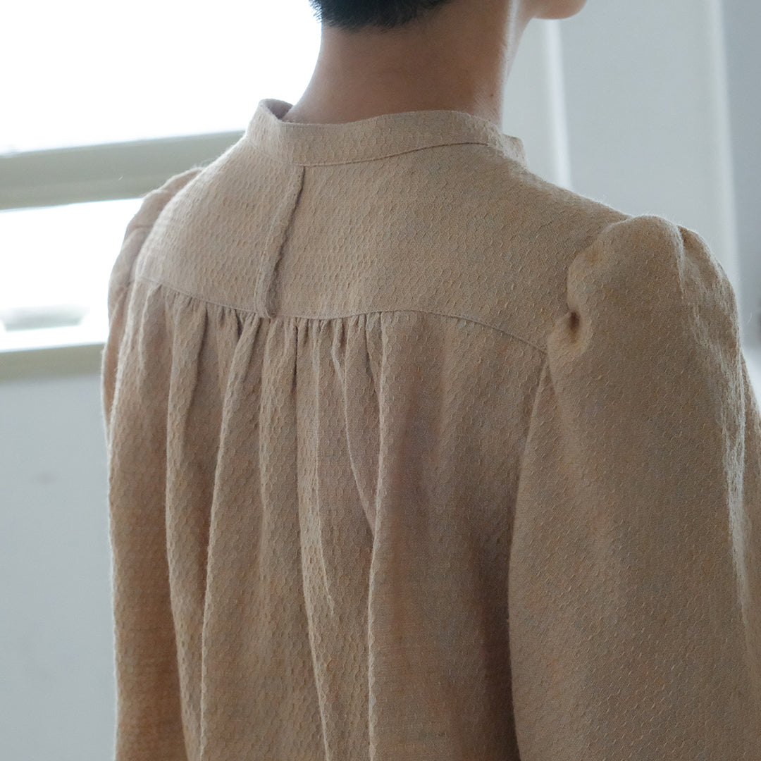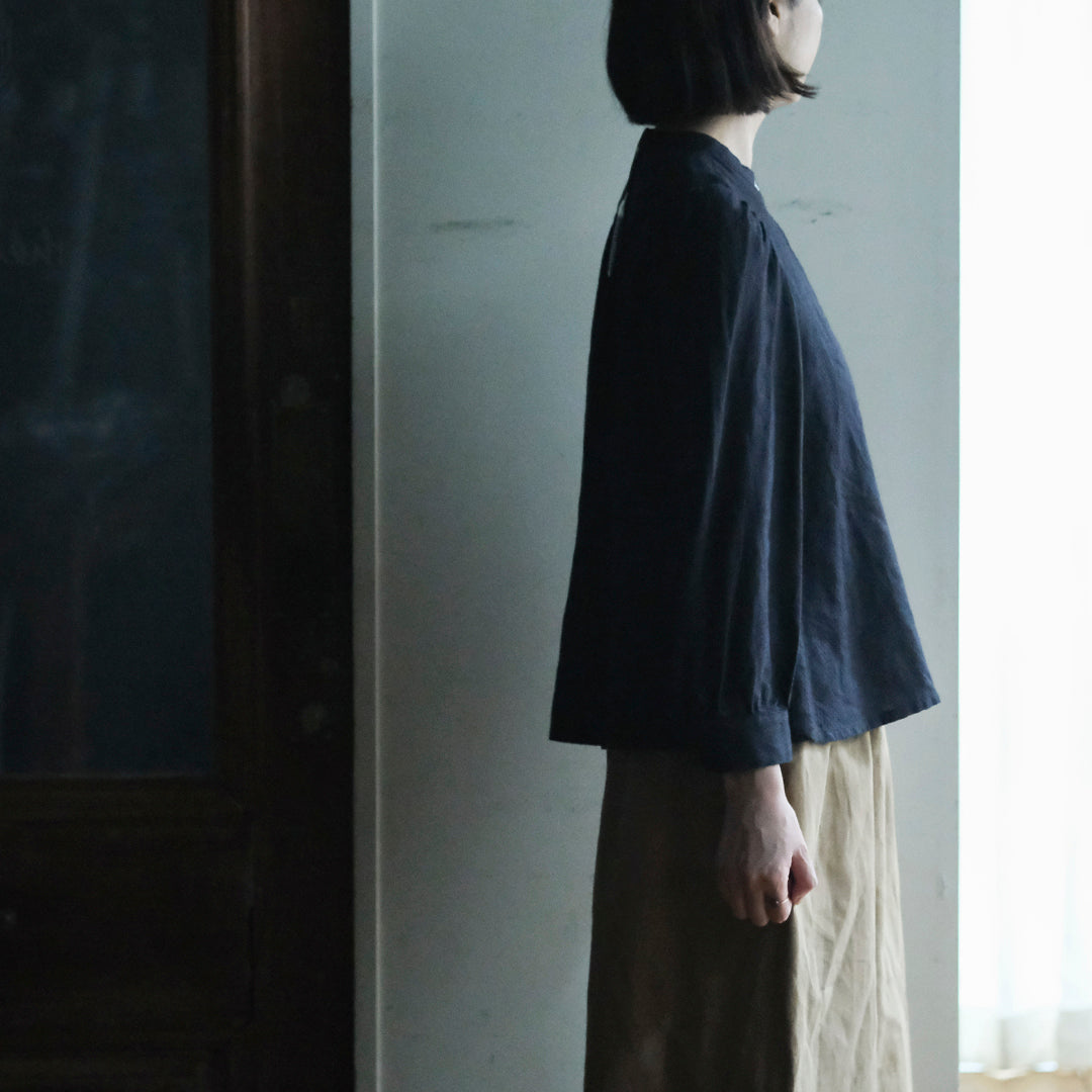 パターンはライトウェイトリネンでつくったパフスリーブシャツと同じですが、生地がしっかりした分、「Aラインのシルエット」や「袖山のフォルム」を楽しめるところも魅力です。リネン素材ですので、お手入れ後はお好みのボリューム感がつくれます。くったりさせて袖山を馴染ませることも可能です。