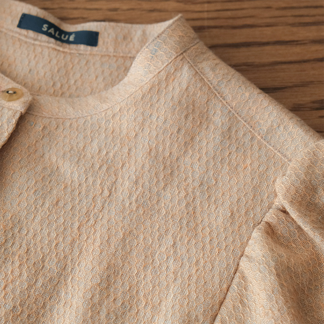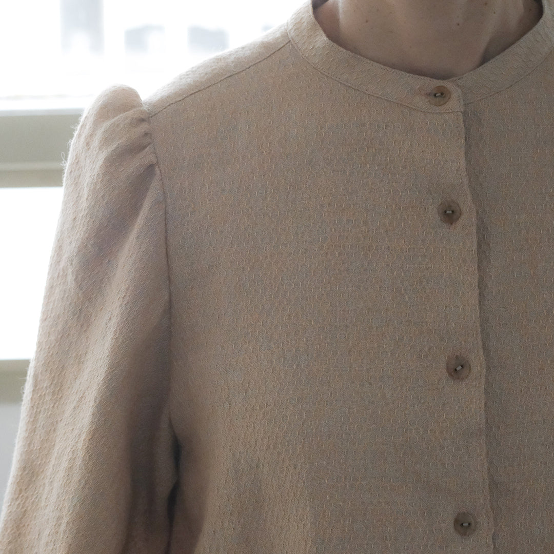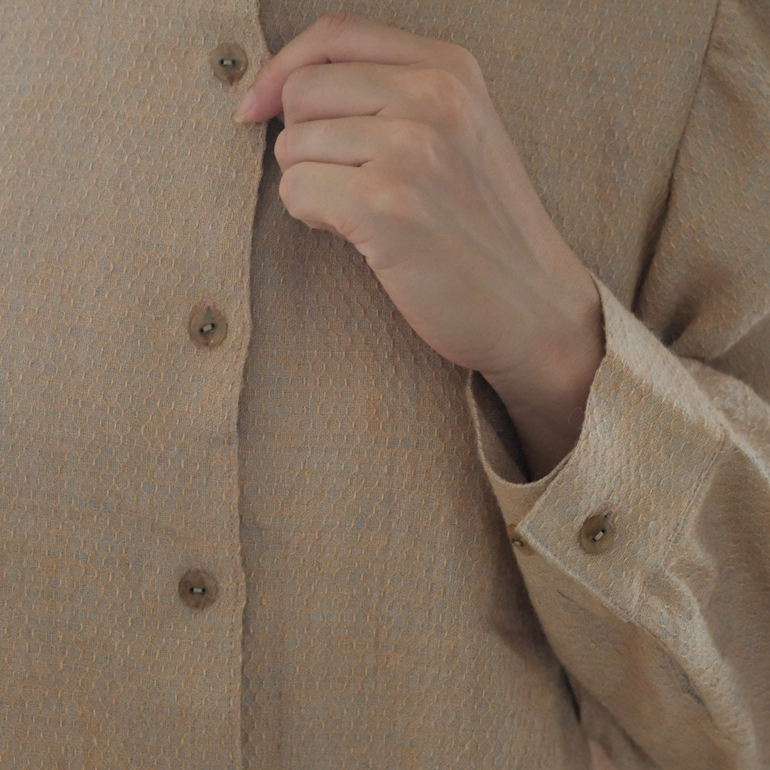 定番のパフスリーブシャツを、印象的なジャカード生地でつくりました。どなたにも取り入れやすいハニカム模様が、装いに特別な表情を添えます。