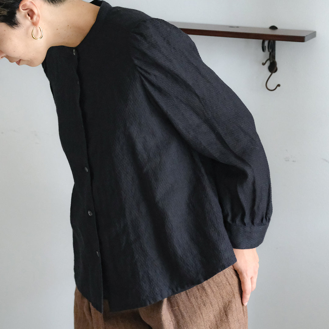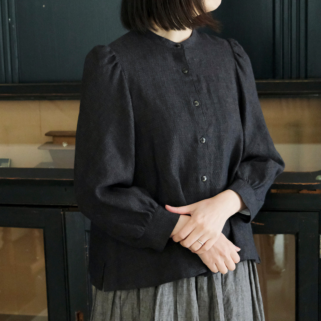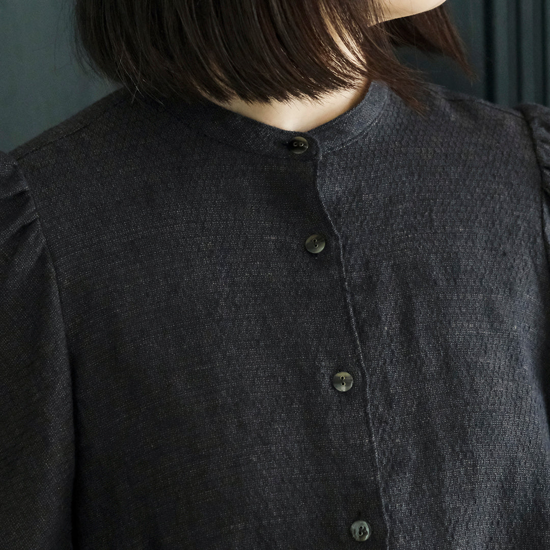 大人の女性に似合う控えめなかわいらしさで人気のパフスリーブシャツを、オリジナルのウールリネンのジャカード生地で仕立てました。▲ブラック×ダークブラウン、モデル身長168cm