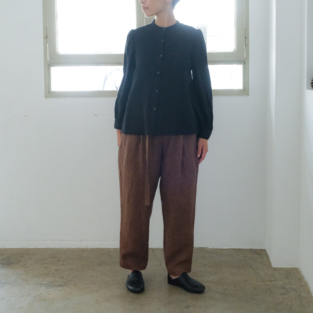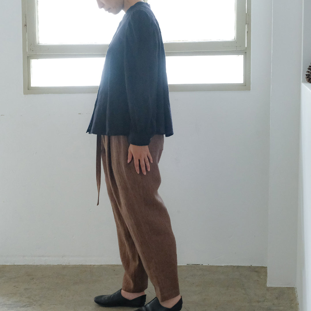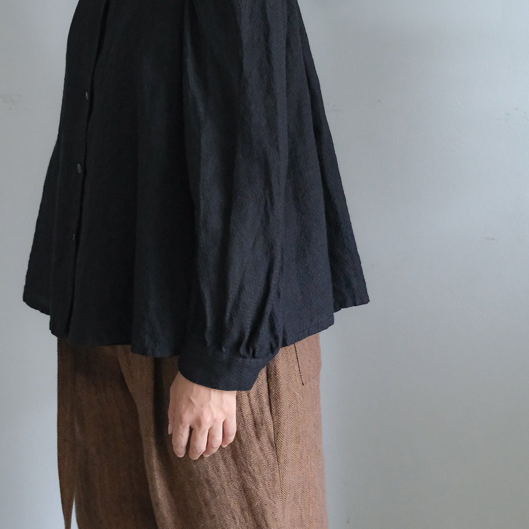 合わせるものを選ばない使い勝手のよさのあるブラック。立体感のあるジャカード織は単なるブラックとは違い、豊かな表情があります。リトアニアンリネンイージーパンツと合わると、大人っぽいナチュラルな着こなしに。