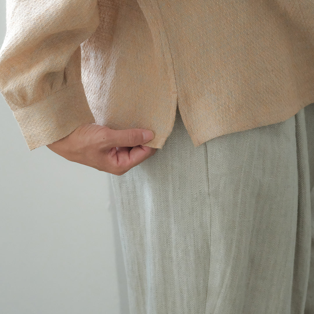 ウールの混率は15%。立体感がある分ライトウェイトリネンよりしっかりしていますが、通気性と保温性を兼ね備えているため、季節を問わず使えます。