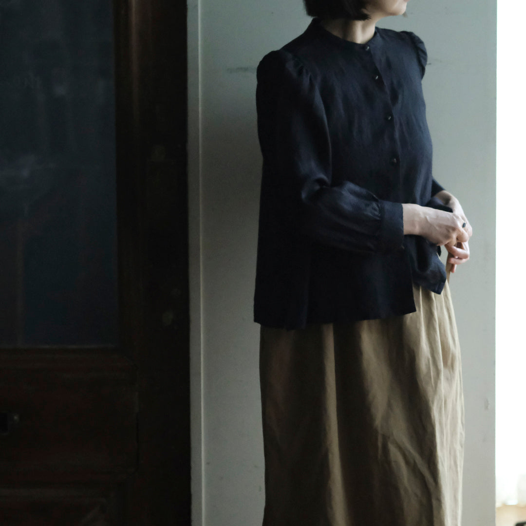 バンドカラーの襟とほどよいパフスリーブは、カーディガンやジャケットなどとのレイヤードの邪魔にならず、さまざまな機会で使えるよう考えられました。▲ブラックにワンサイドスリットロングスカート ベージュブラウンに合わせて