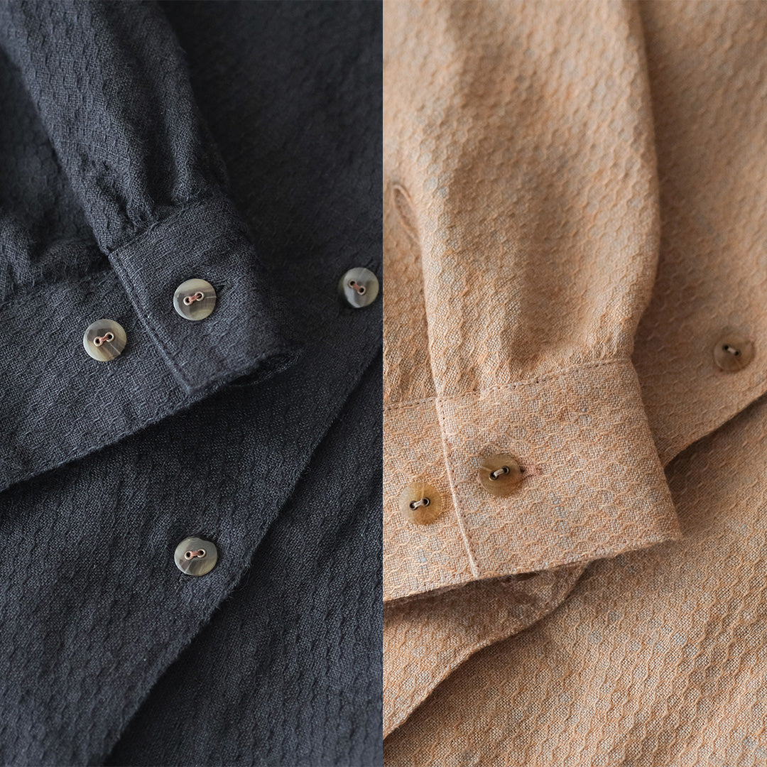 生地色に馴染みやすい透明感のあるボタンは、ほどよい存在感がありながら、ハニカム模様の可愛さに落ち着きを与えています。▲ブラック×ダークブラウンにも茶系のボタンを
