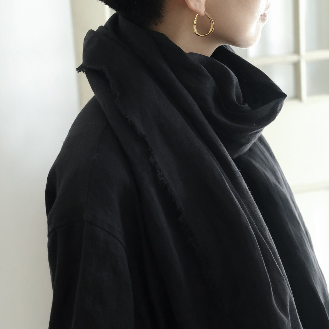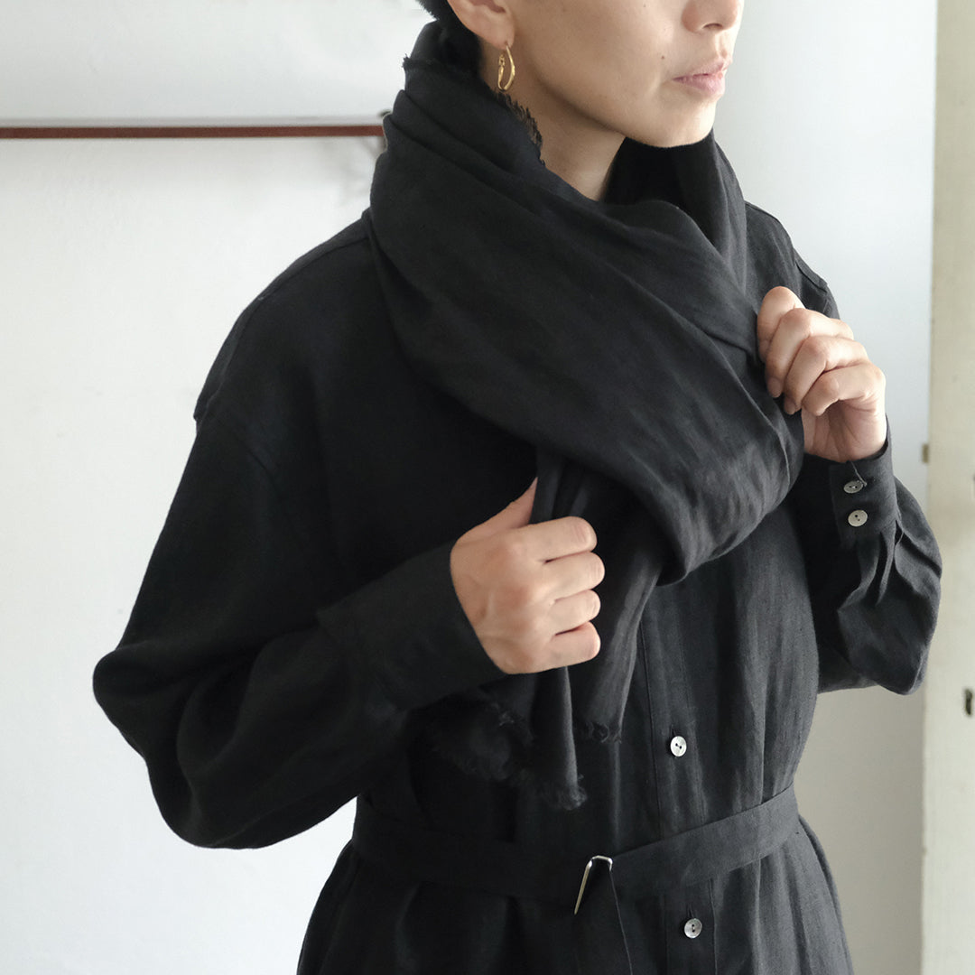 SALUÉのシャツやブラウスで使用している 「ライトウェイトリネン」を使用したストール。さらっとした質感・エアリーな着用感が特長で、上質で個性的なリトアニアリネンは、合わせるものを選びません。