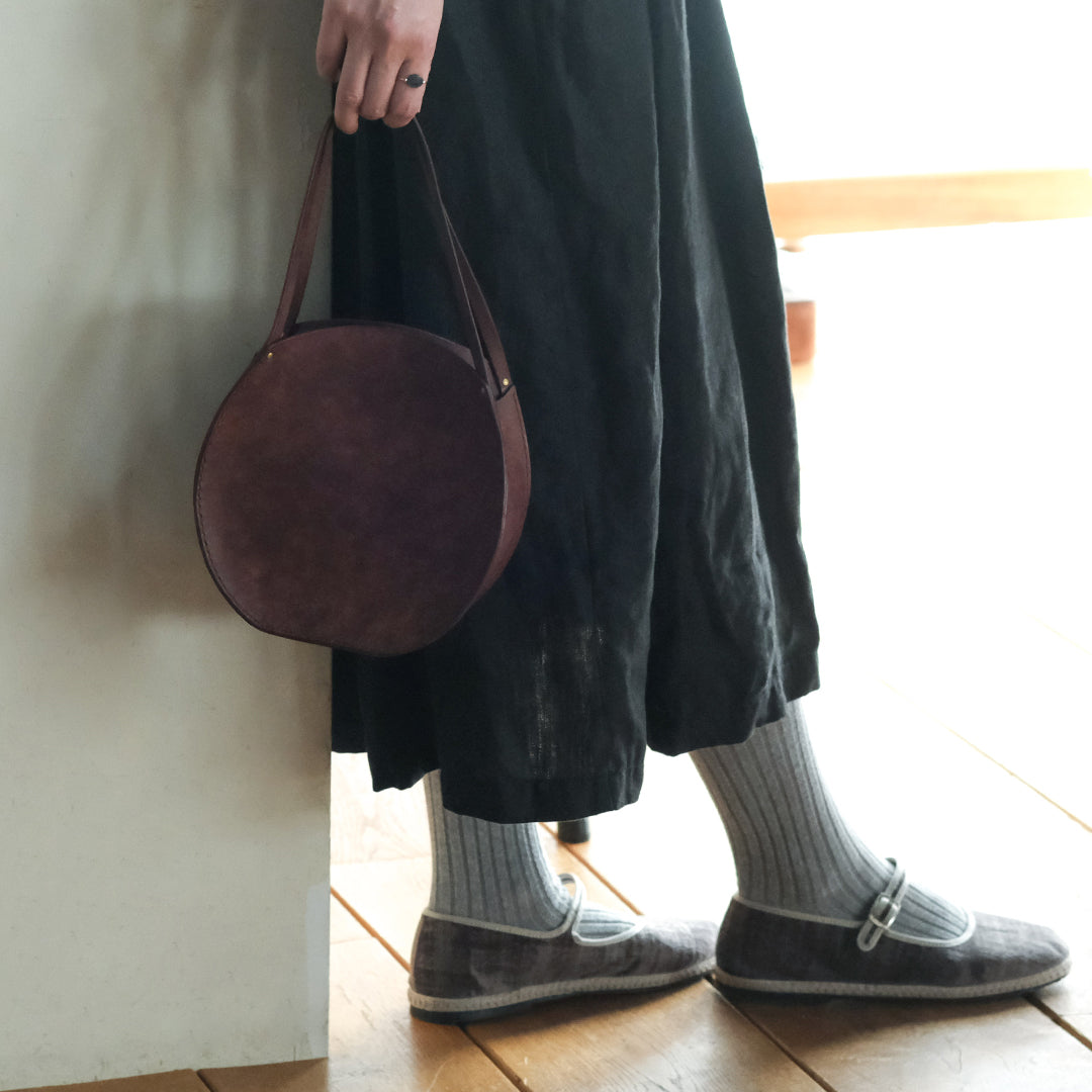 JOURNEYがつくるバッグの中で一番個性的なかたちをしているのが、ころんとまるいmrハンドバッグ。荷物を入れても型崩れしにくいので、普段のお出かけだけでなく、少しきれい目なハンドバッグを選びたい日にも活躍します。