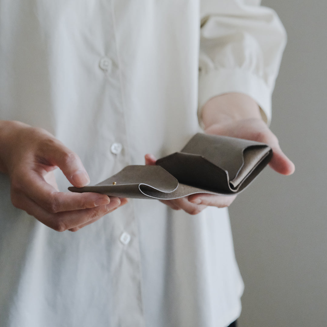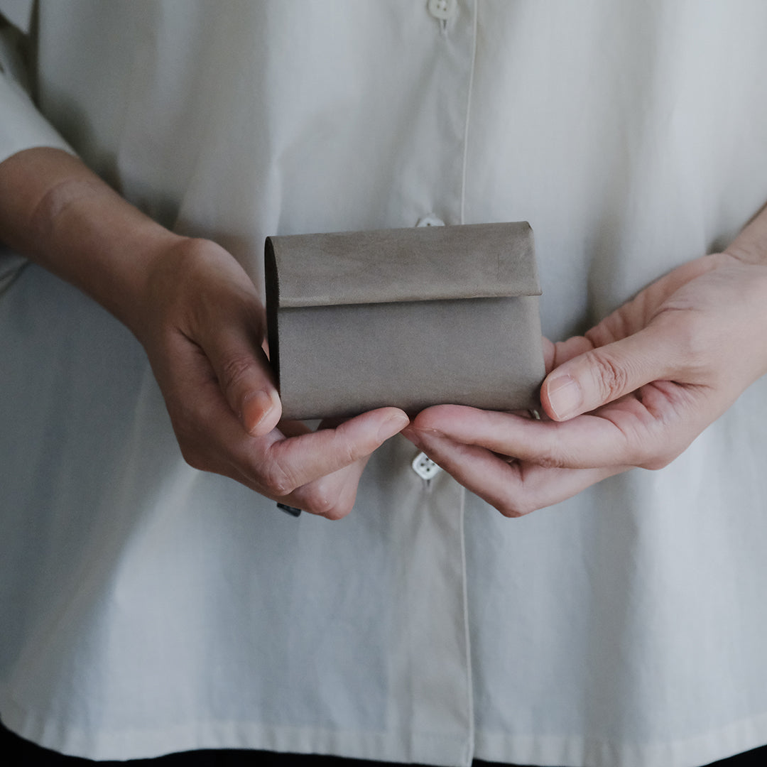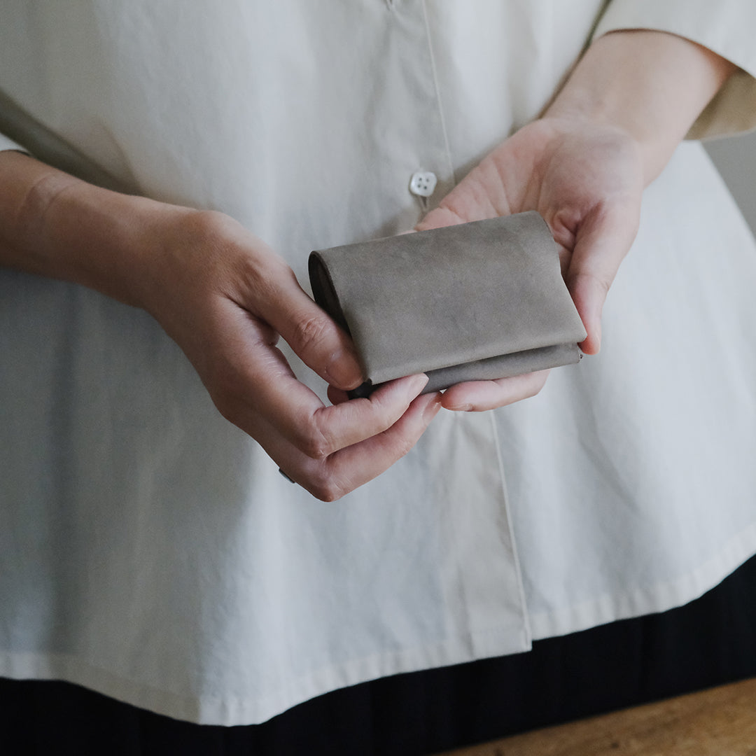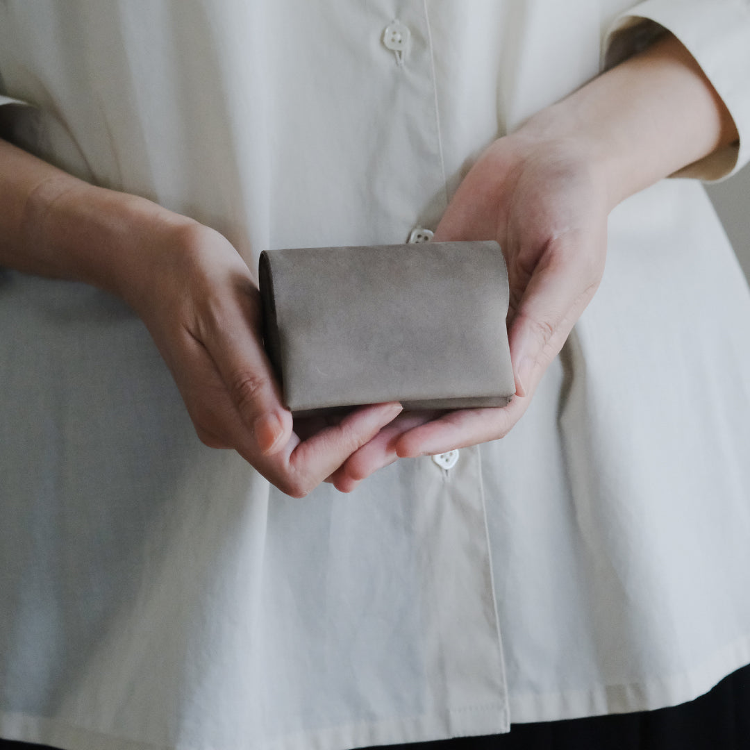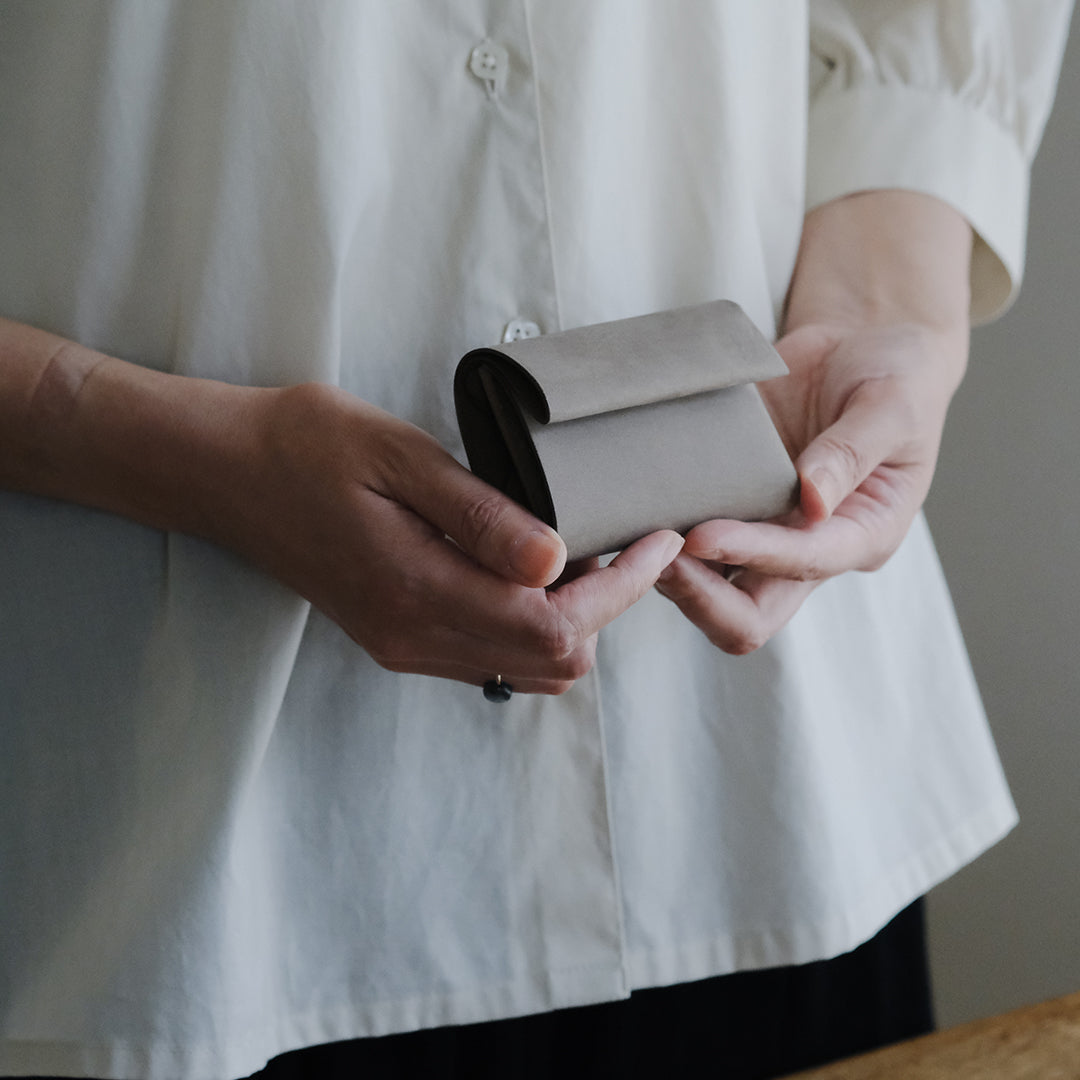 小さな鞄だけでなく、衣服のポケットにも入ってしまうサイズ感。普段ほとんど現金を使わず財布をできるだけミニマムにしたい方に、嬉しいコンパクトさです。デザインはボタンやファスナーがなく、とてもミニマル。和紙のようなマットな質感の革は、使い込むうちに艶が増していき、しっとりとした風合いに育ちます。