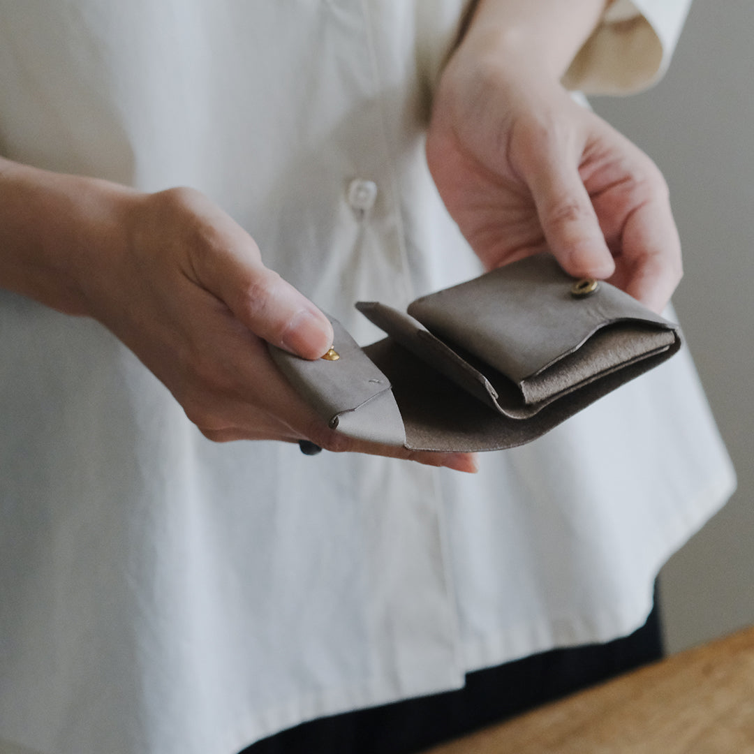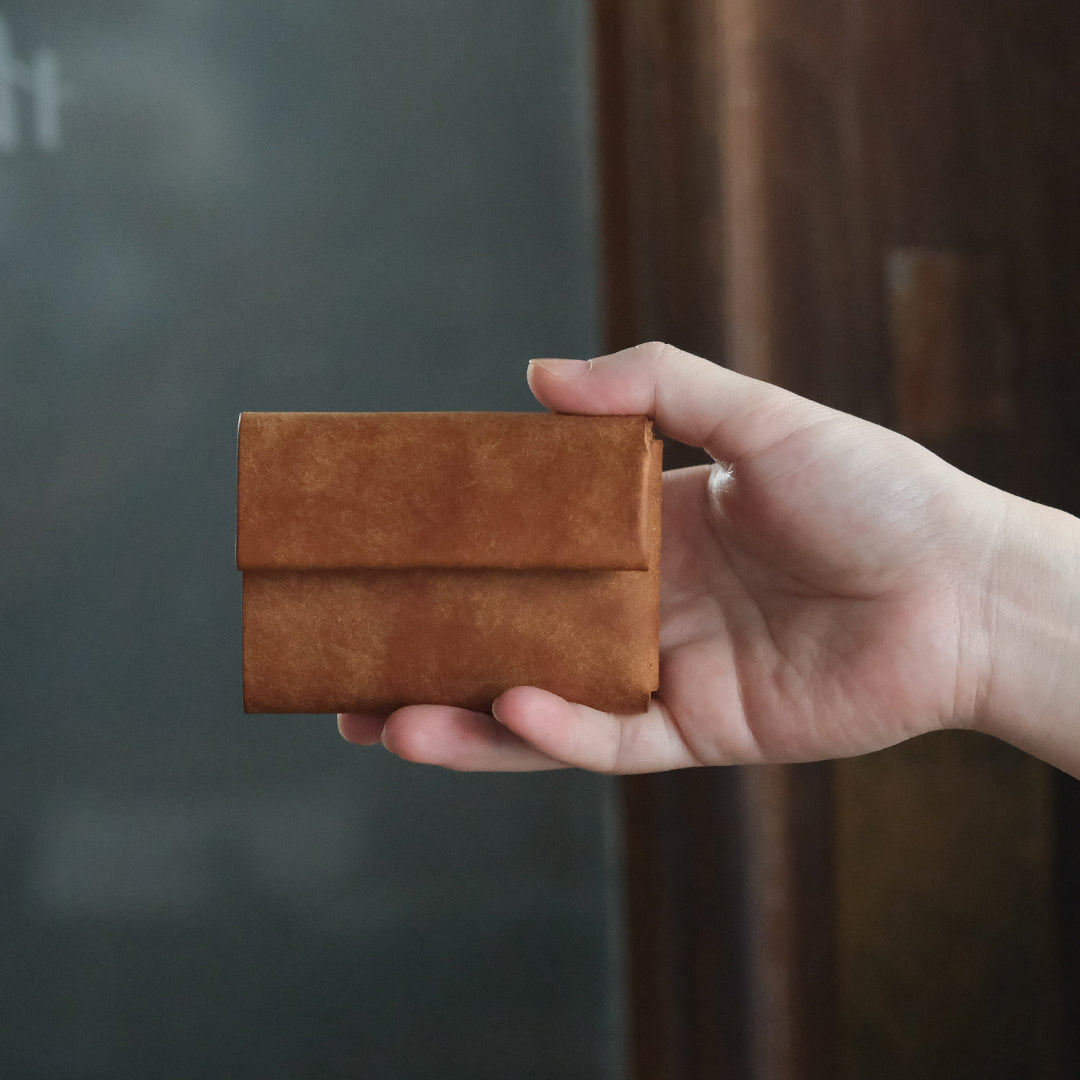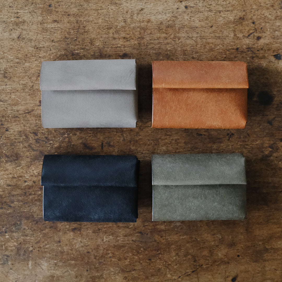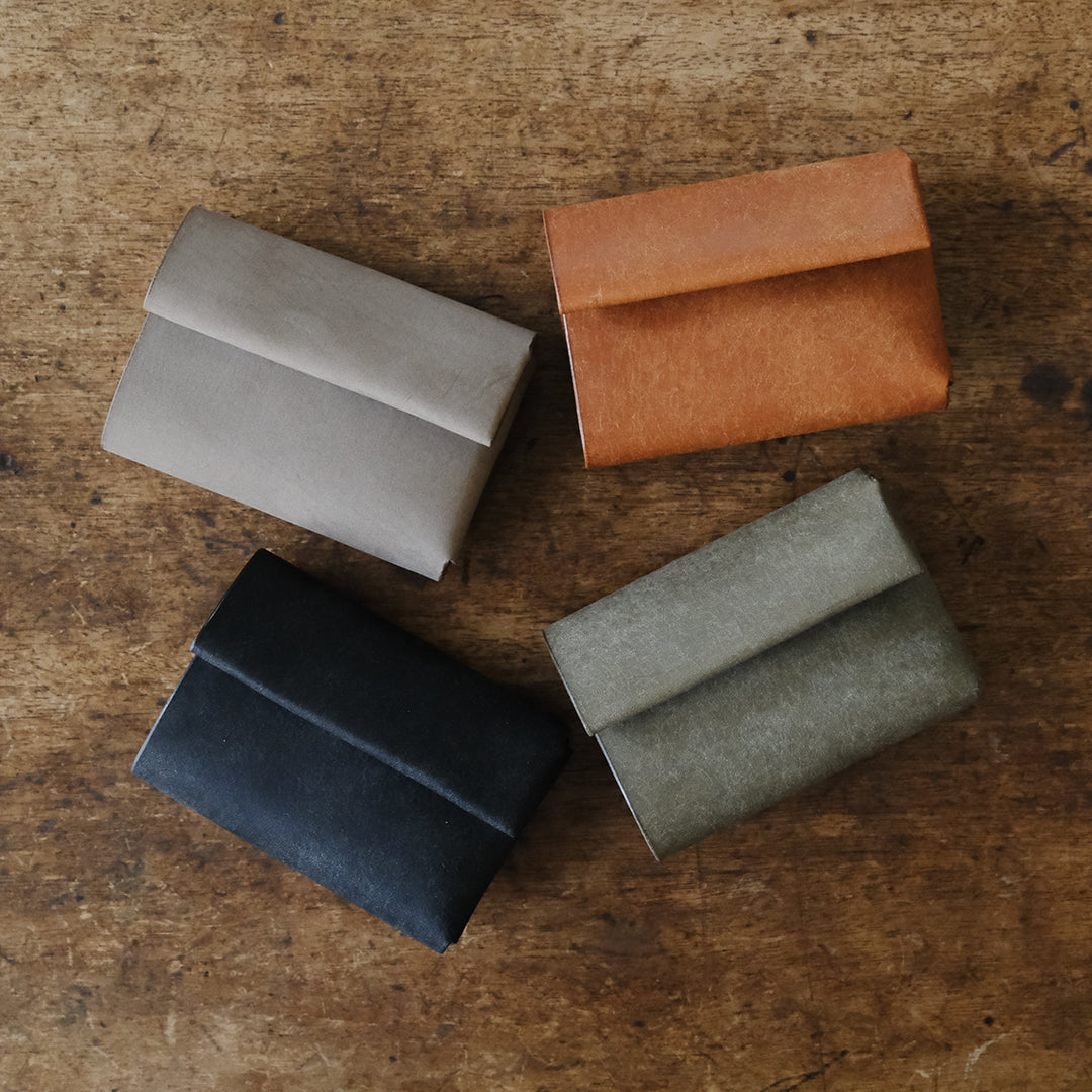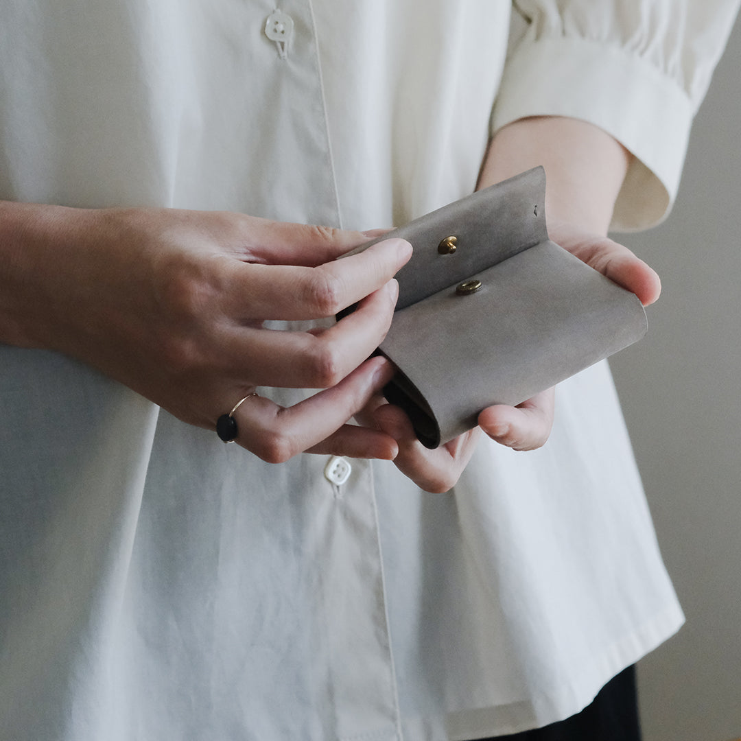 小さな鞄だけでなく、衣服のポケットにも入ってしまうサイズ感。普段ほとんど現金を使わず財布をできるだけミニマムにしたい方に、嬉しいコンパクトさです。デザインはボタンやファスナーがなく、とてもミニマル。和紙のようなマットな質感の革は、使い込むうちに艶が増していき、しっとりとした風合いに育ちます。
