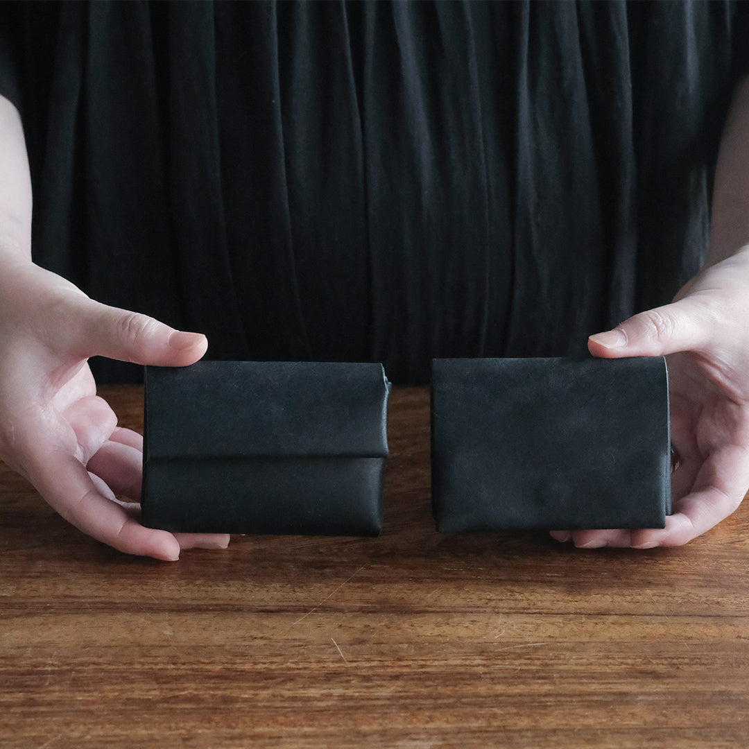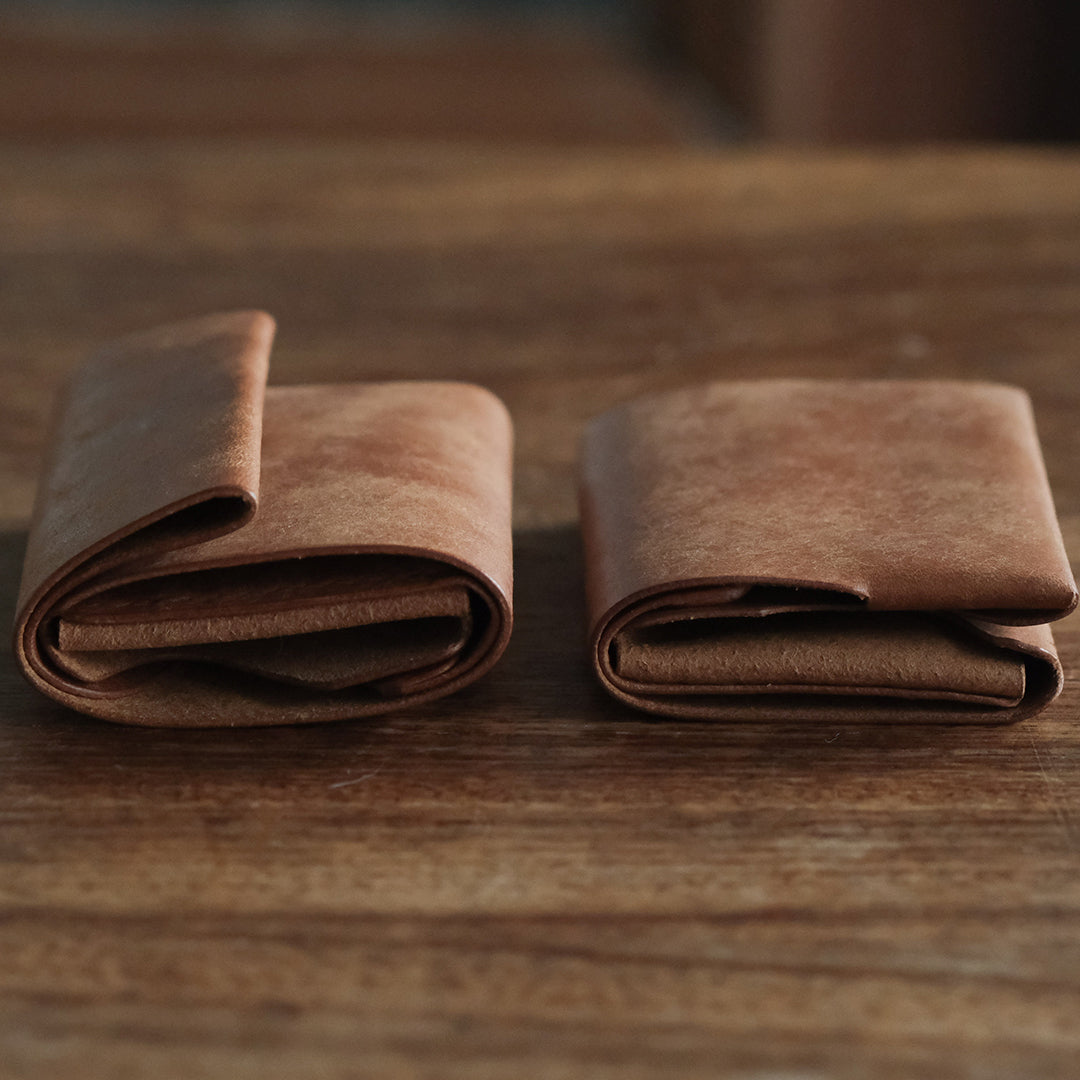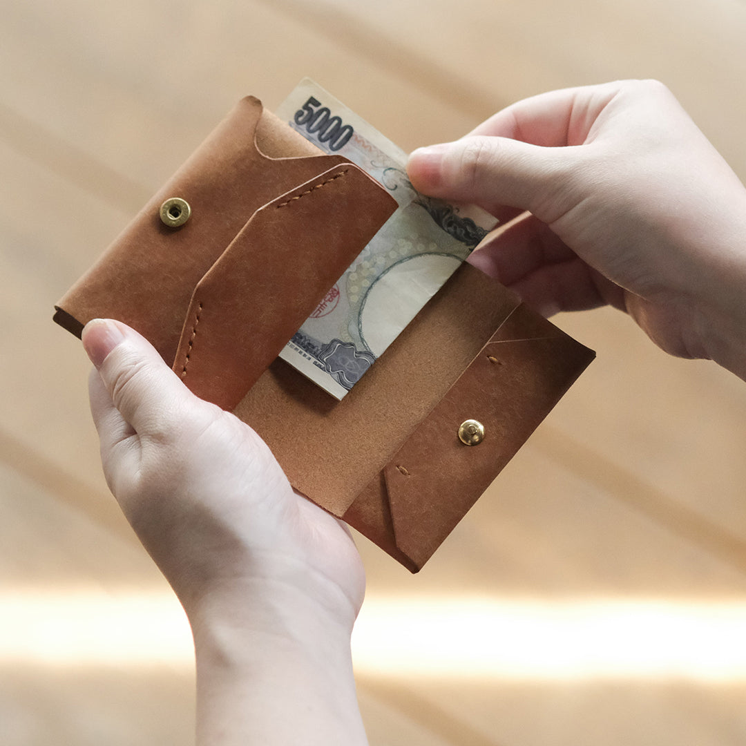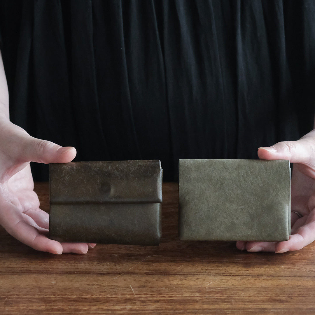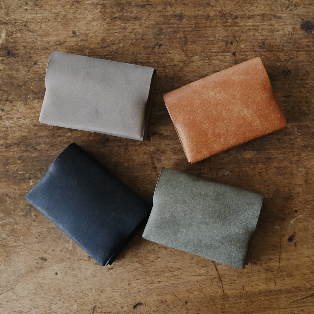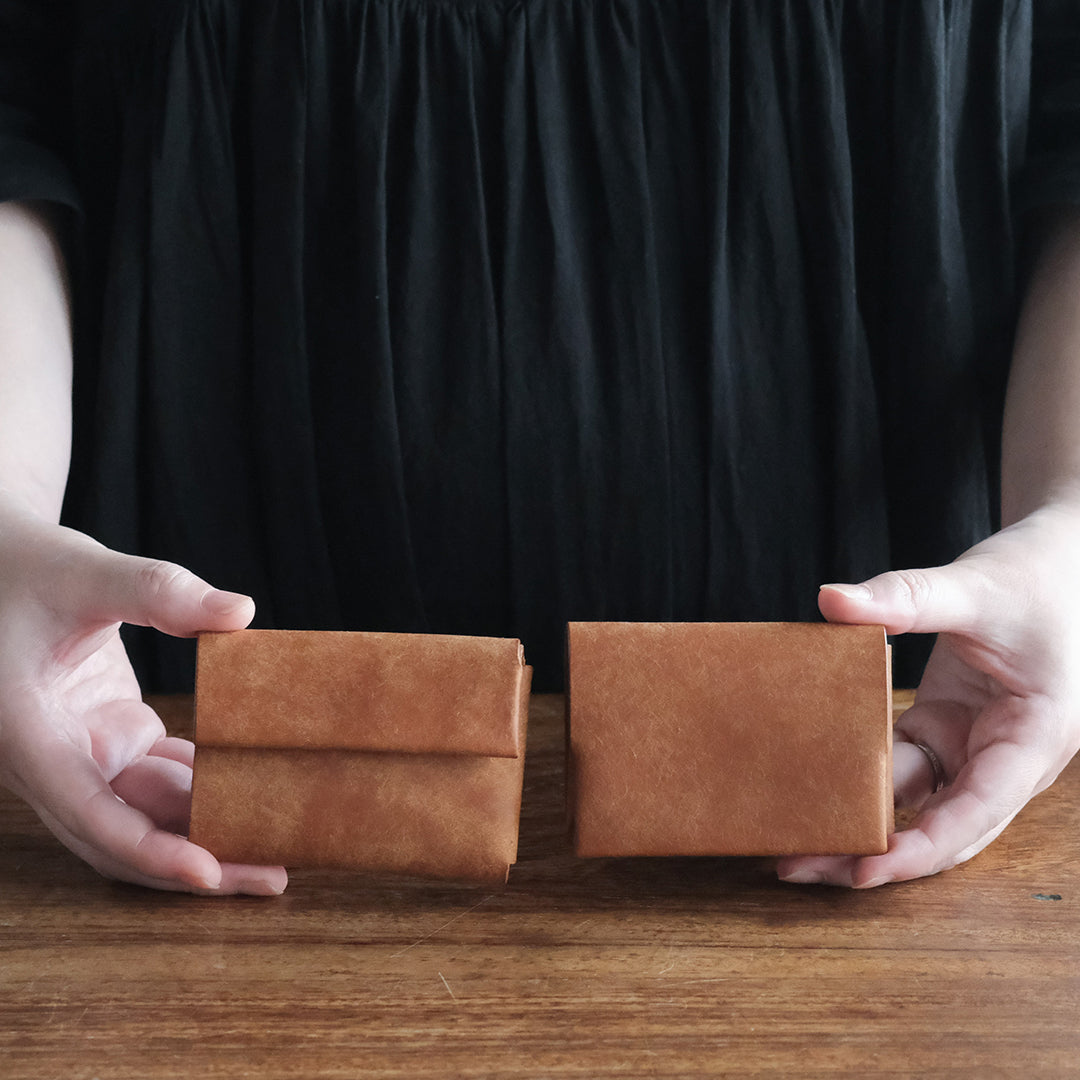 小さな鞄だけでなく、衣服のポケットにも入ってしまうサイズ感。普段ほとんど現金を使わず財布をできるだけミニマムにしたい方に、嬉しいコンパクトさです。デザインはボタンやファスナーがなく、とてもミニマル。和紙のようなマットな質感の革は、使い込むうちに艶が増していき、しっとりとした風合いに育ちます。