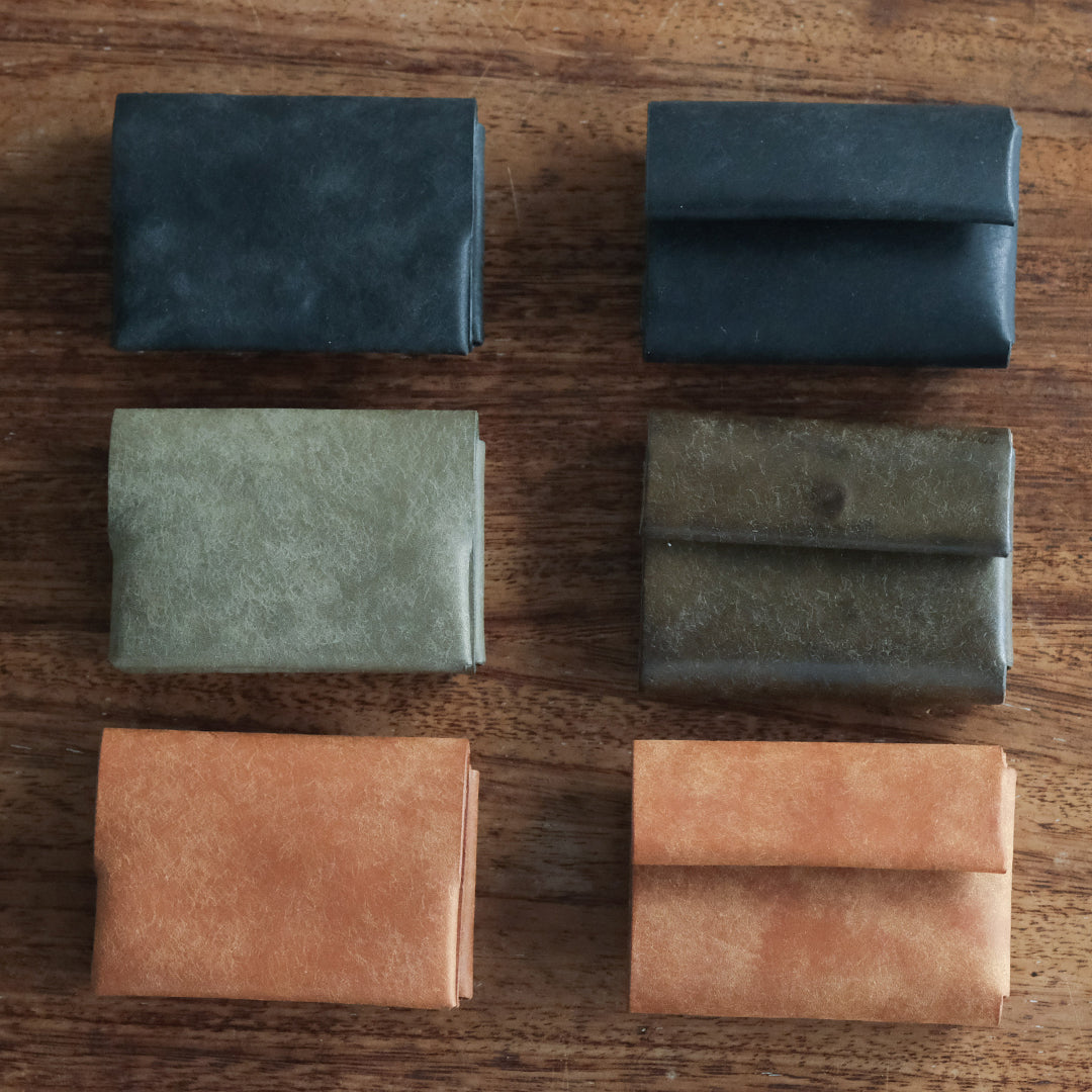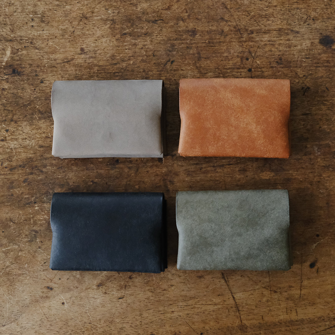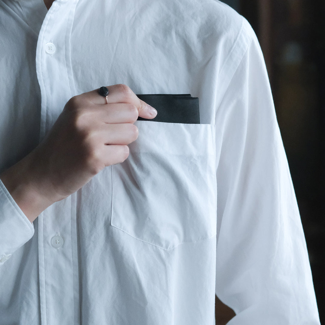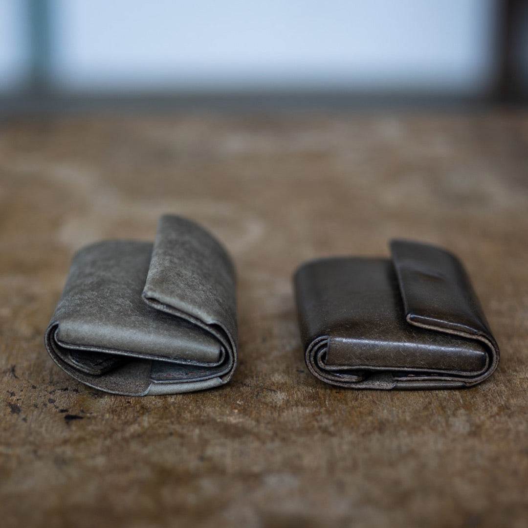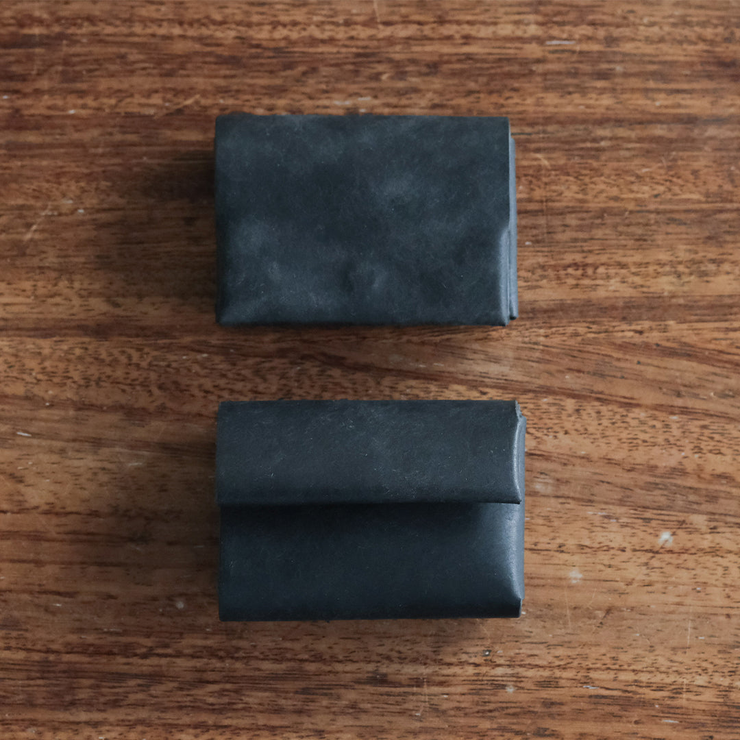 小さな鞄だけでなく、衣服のポケットにも入ってしまうサイズ感。普段ほとんど現金を使わず財布をできるだけミニマムにしたい方に、嬉しいコンパクトさです。デザインはボタンやファスナーがなく、とてもミニマル。和紙のようなマットな質感の革は、使い込むうちに艶が増していき、しっとりとした風合いに育ちます。