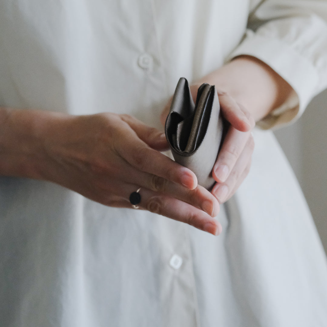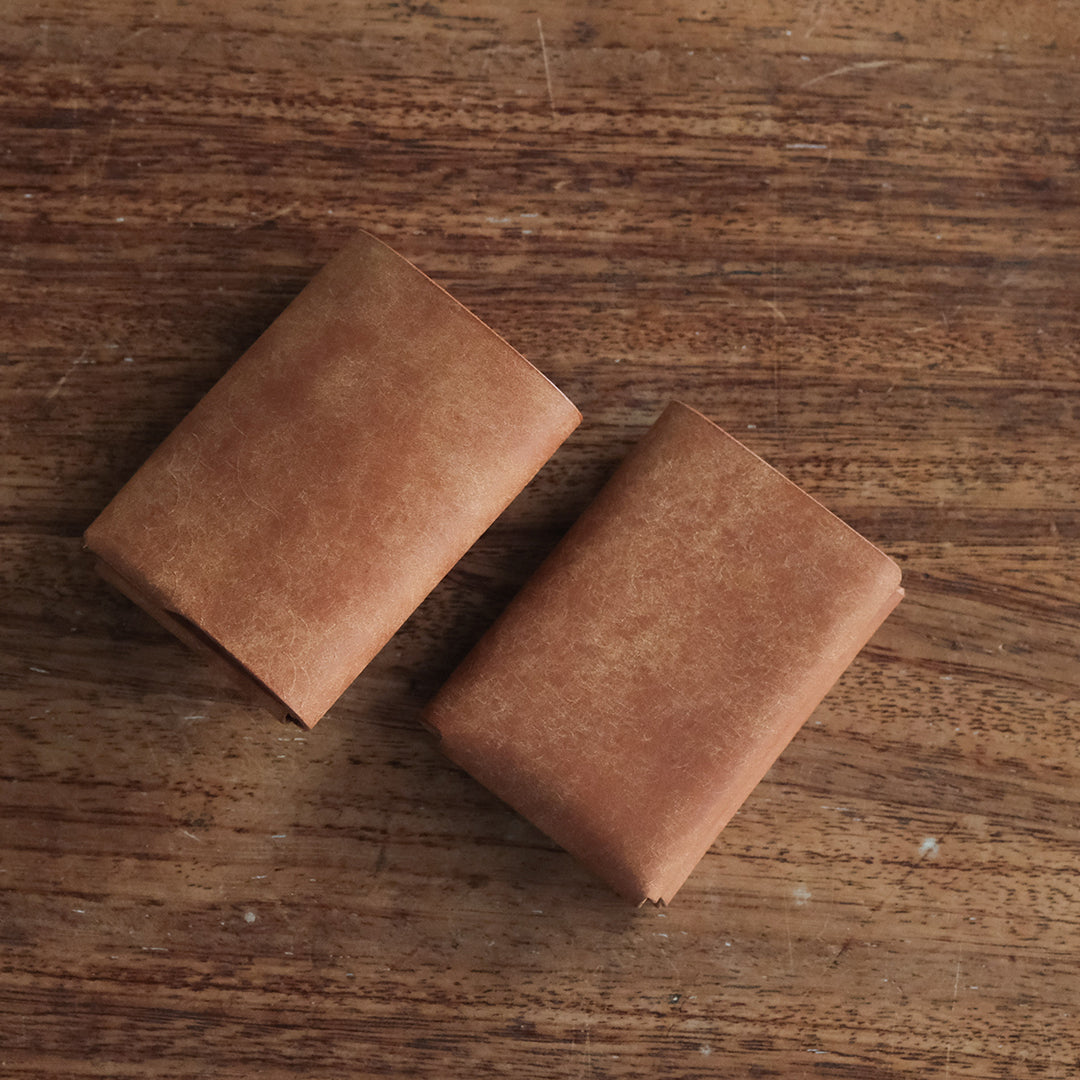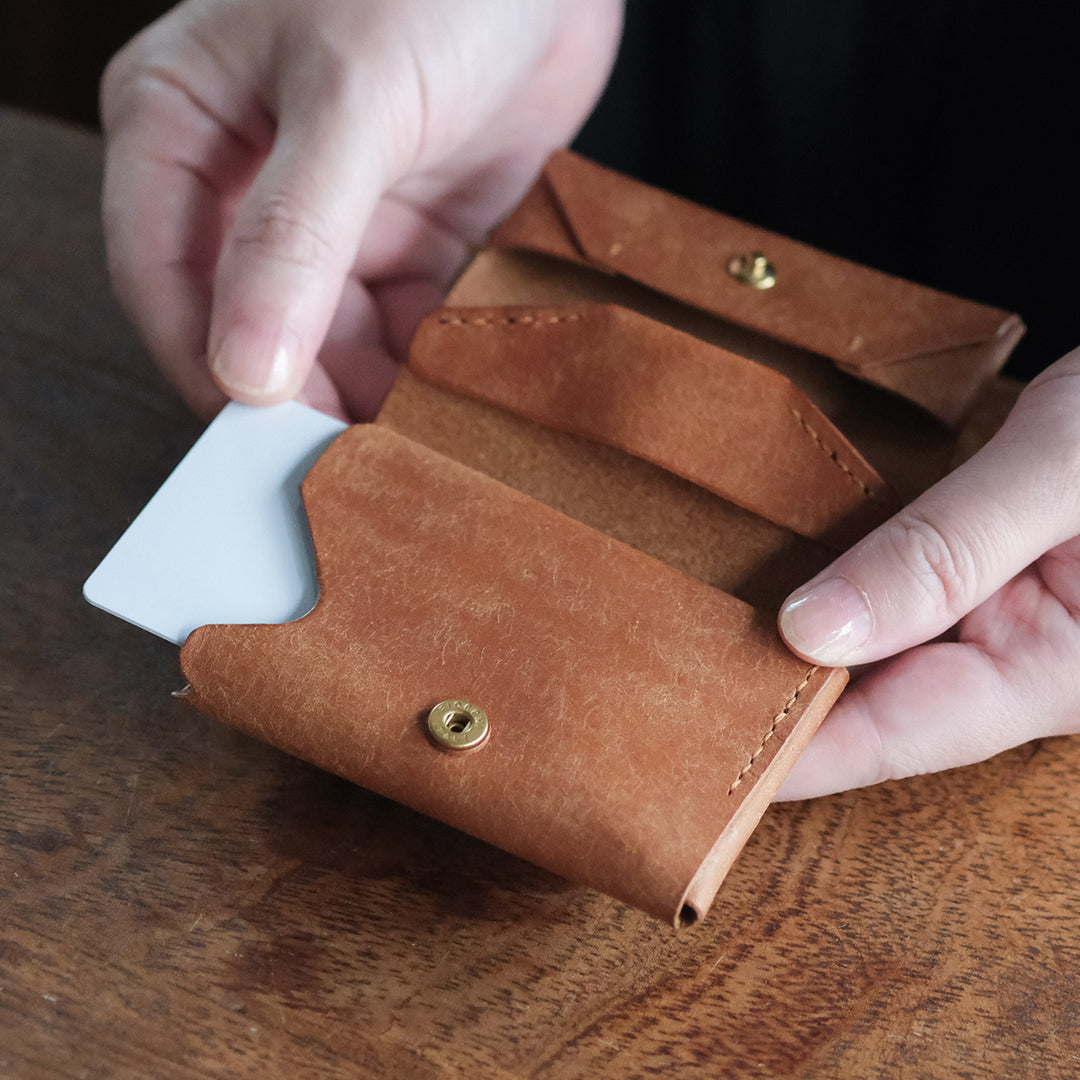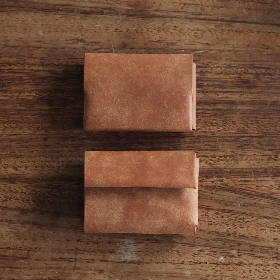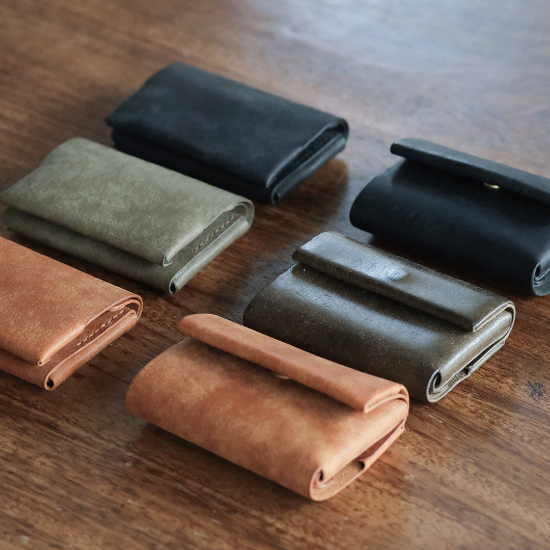 小さな鞄だけでなく、衣服のポケットにも入ってしまうサイズ感。普段ほとんど現金を使わず財布をできるだけミニマムにしたい方に、嬉しいコンパクトさです。デザインはボタンやファスナーがなく、とてもミニマル。和紙のようなマットな質感の革は、使い込むうちに艶が増していき、しっとりとした風合いに育ちます。