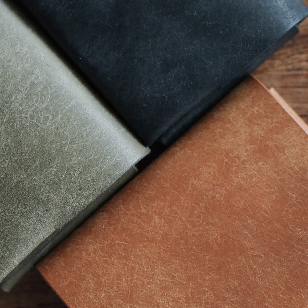 キャメル、グレーカーキ、ブラックの3色はイタリア・トスカーナのタンナー、バダラッシ社のバケッタ製法でつくられたプエブロと呼ばれるレザーを使用しています。