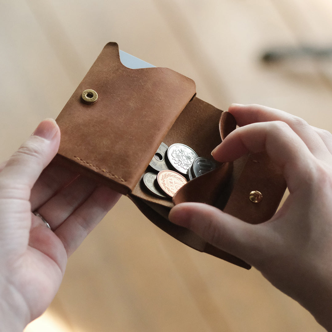受けを指で起こして手前に傾け、小銭をスライドさせて使います。革のハリと柔らかさを生かした受けに小銭が収まり、つまんで取りやすくなっています。
