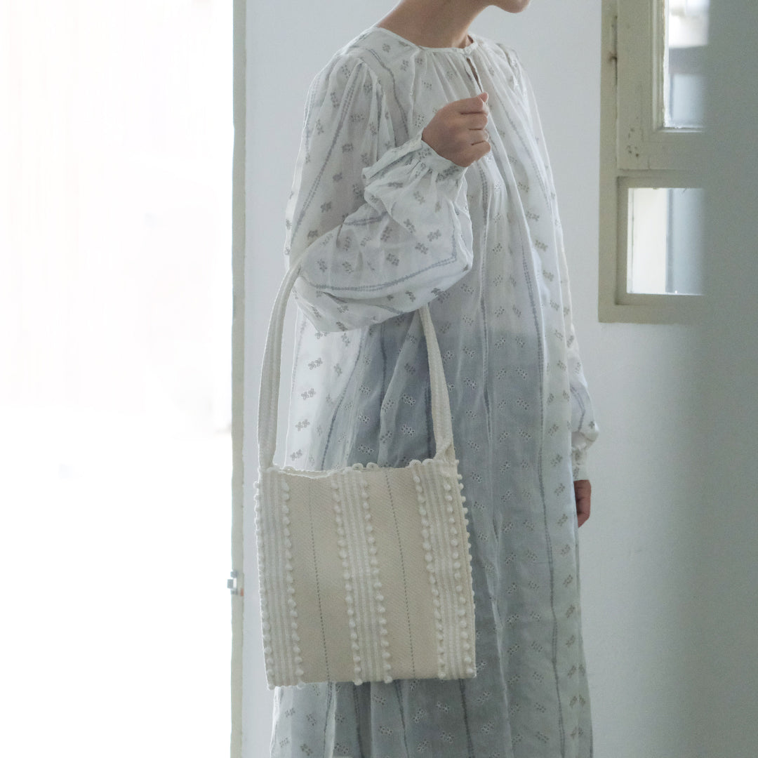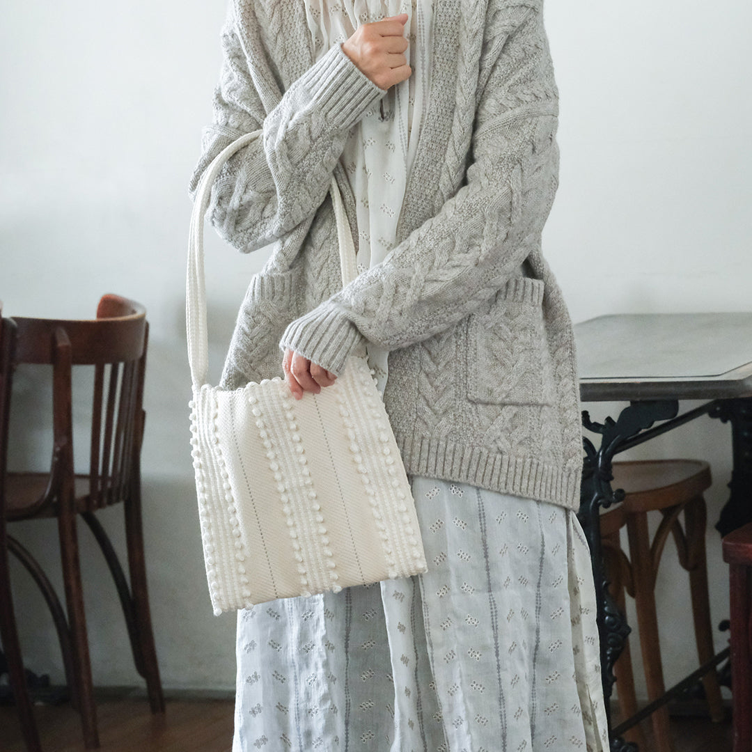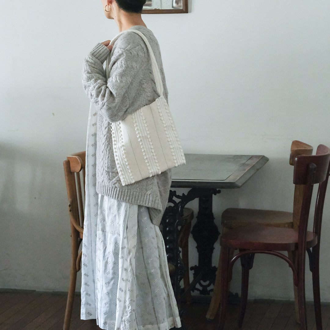レザーバッグの重厚感はいらないけれど、ただの布バッグでは少し物足りない、そんな大人の気持ちに寄り添うような存在です。▲クリーム×クリーム ニット:[FREEMAN--B]パターンニッティングバルキーカーディガン ワンピース:[BUNON]Embroidery Gather Dress