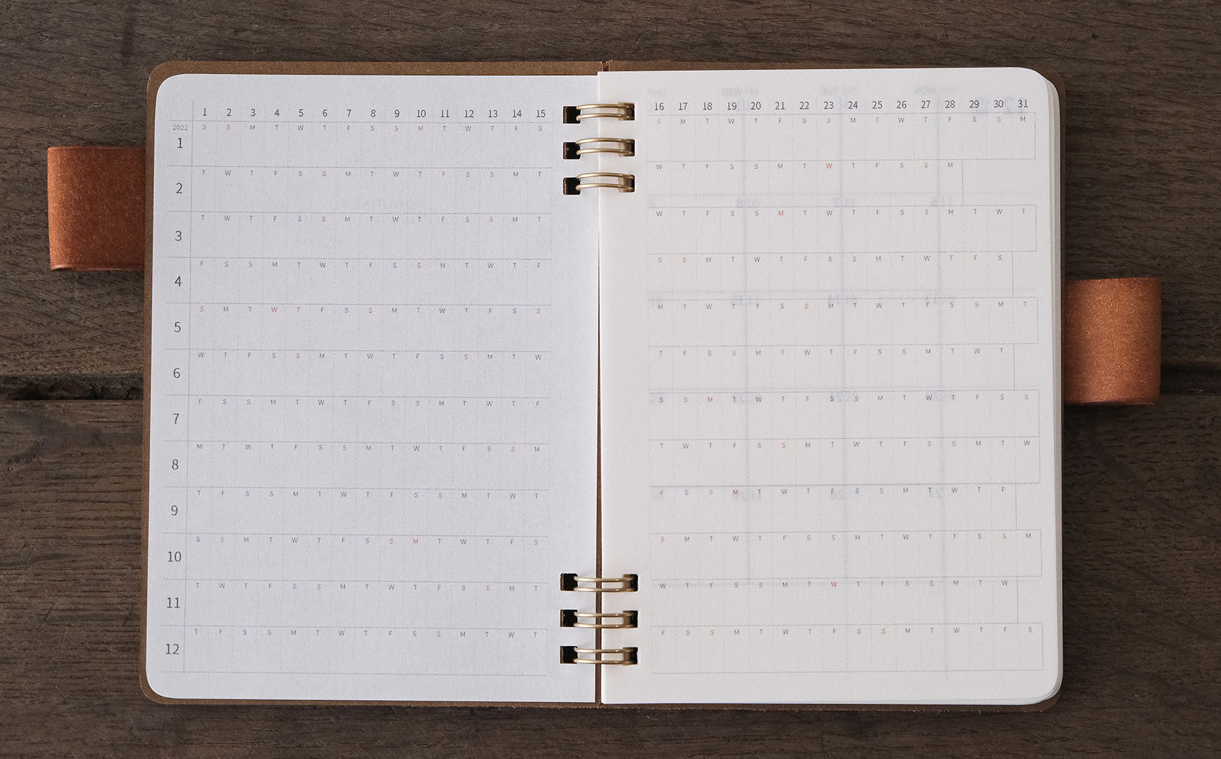 革の手帳をお送りいただくと、リメイク後、来年用の中紙をセットしてお送りします。手帳のカレンダータイプは月間のみか月間+週間を、フリーページは無地か方眼をご希望の中身をお選びください。