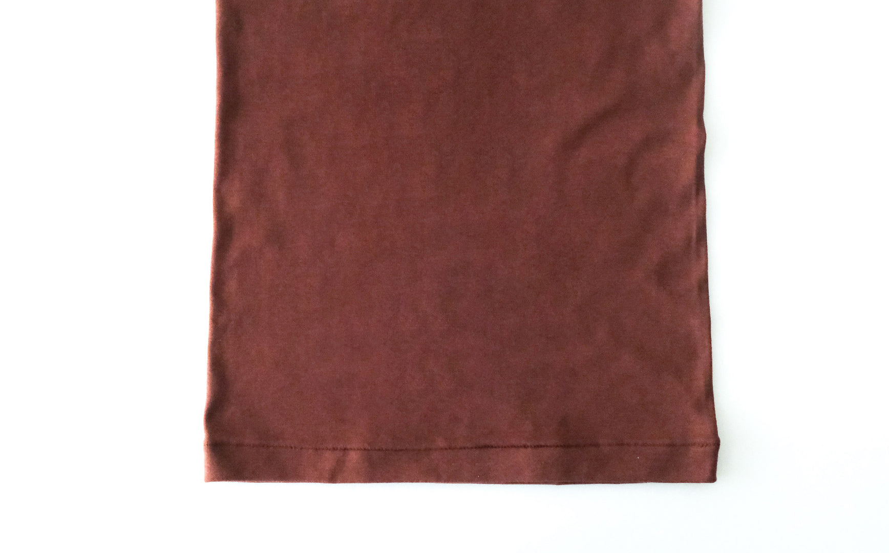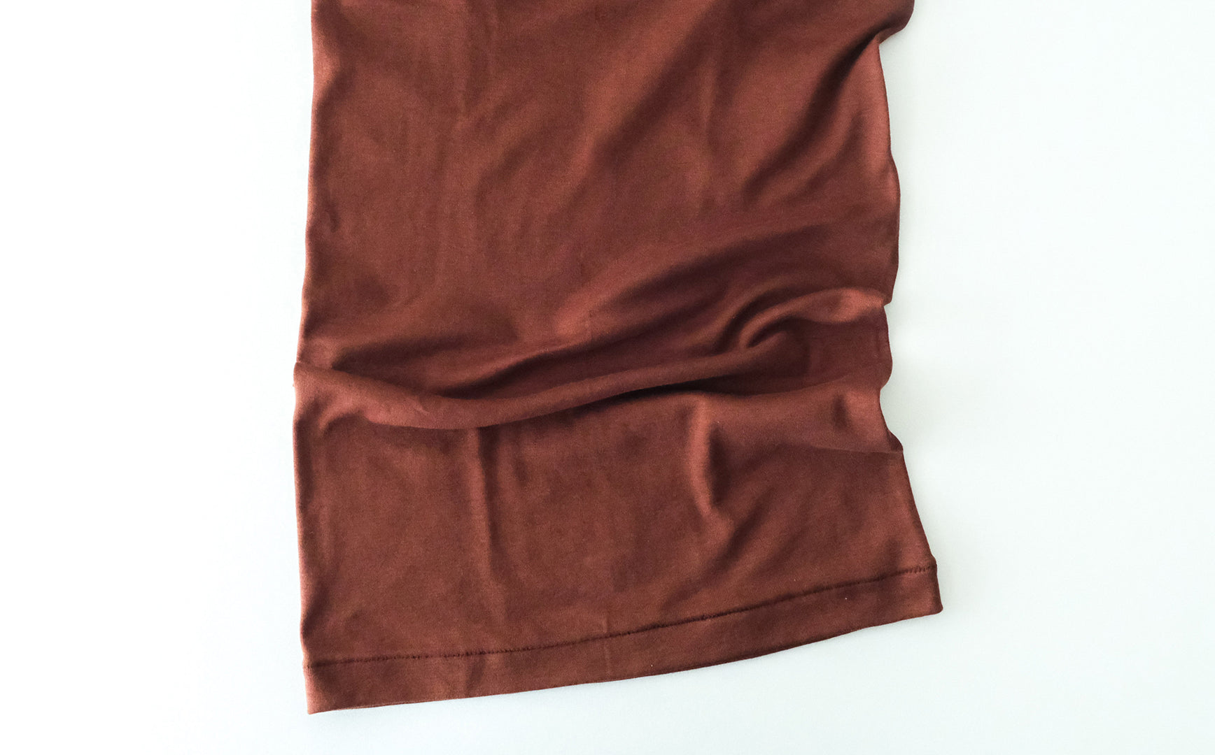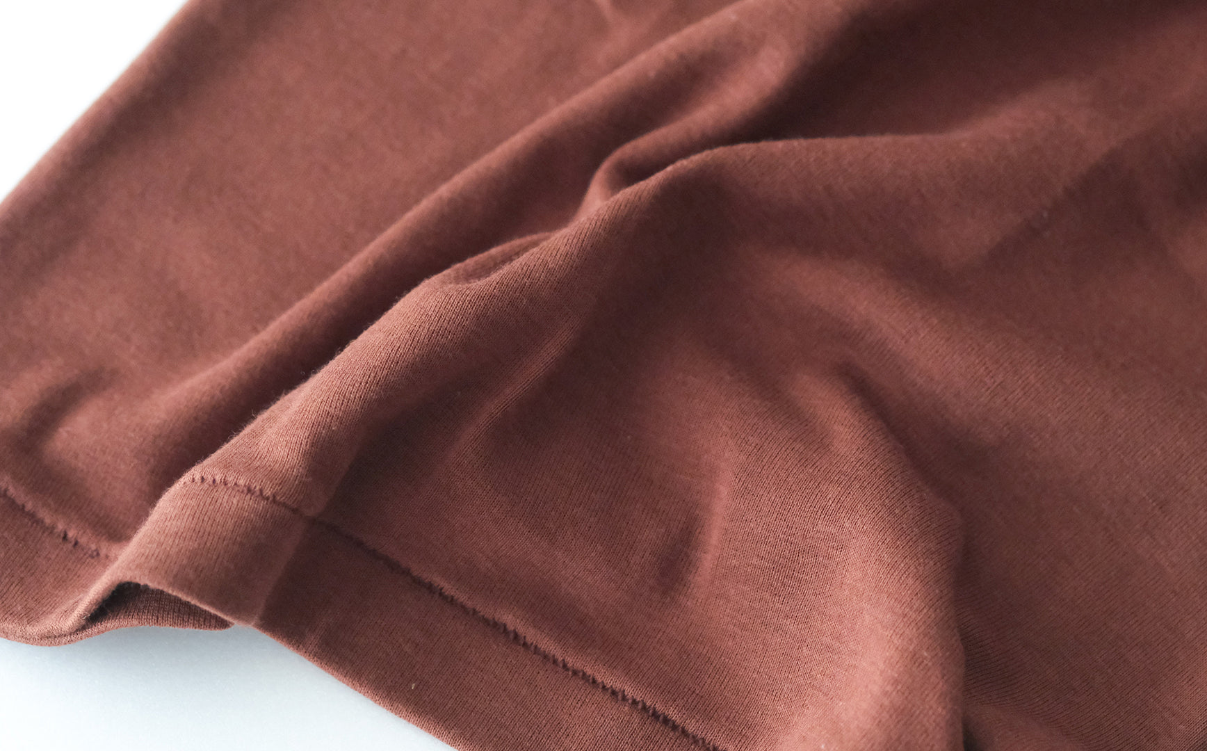 表の生地も裏の胸の部分も、脇に縫い目のない丸編みで編まれています。縫い代のあたりが無いので、心地よい着心地です。