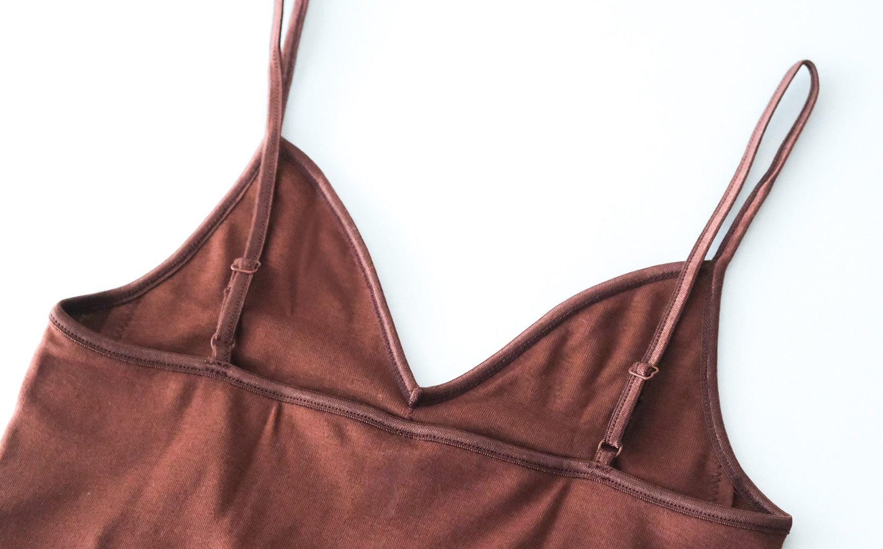 胸下にはゴムが入っていますが、締め付けはとてもやさしく、リラックスして着用いただけます。パッドは丸いかたちで、取り外しできます。