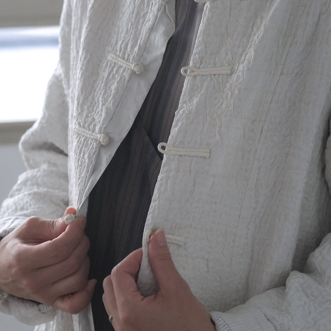 ひそかに立ち上がるハイネック、突き合わせに配された紐の留め具など、どこか伝統衣装を彷彿とさせる凛としたディテール。