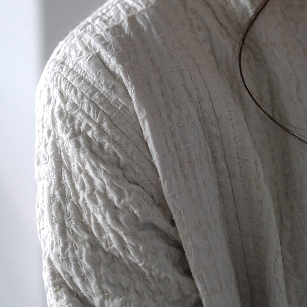 全面に施された刺し子がこのコートの大きな魅力。貴重な手仕事のあたたかみを感じる特別な生地で仕立てられています。