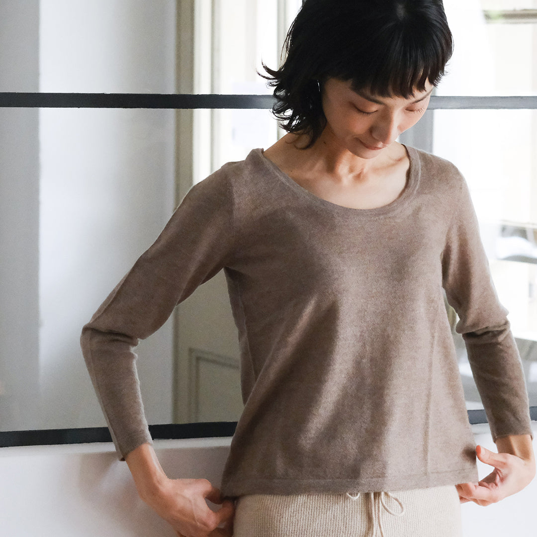 前後共にラウンドした美しいネックラインが特長。インナーとしておつくりしていますが、そのままデニムなどと合わせてラフに着こなすこともできます。