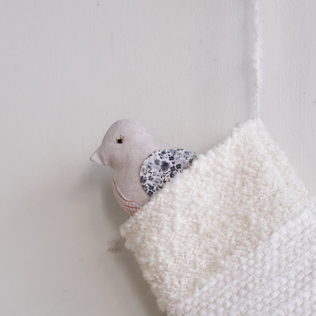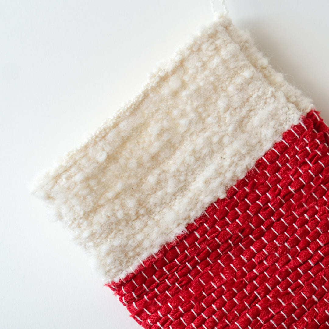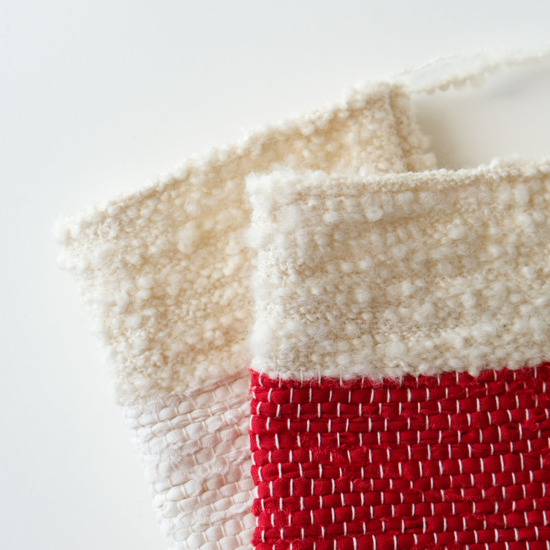 本体部分は細く裂いたコットン布を、上部分のポコポコした部分はウール糸で織られています。表情の違いが可愛らしく、手仕事ならではのぬくもりを感じます。
