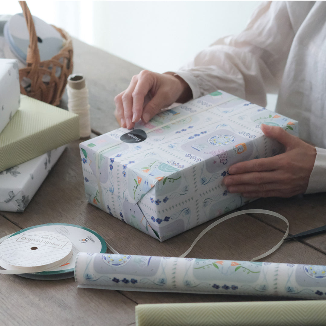 作家 藤井麻利絵さんの描いたグーズベリーがモチーフの包装紙。まあるい実と小さな葉が可愛らしいグーズベリーは、あえて少し珍しい植物を選んでいます。美しく繊細な植物の絵を通して、植物の新たな魅力を知る機会になったら……という想いを込めています。