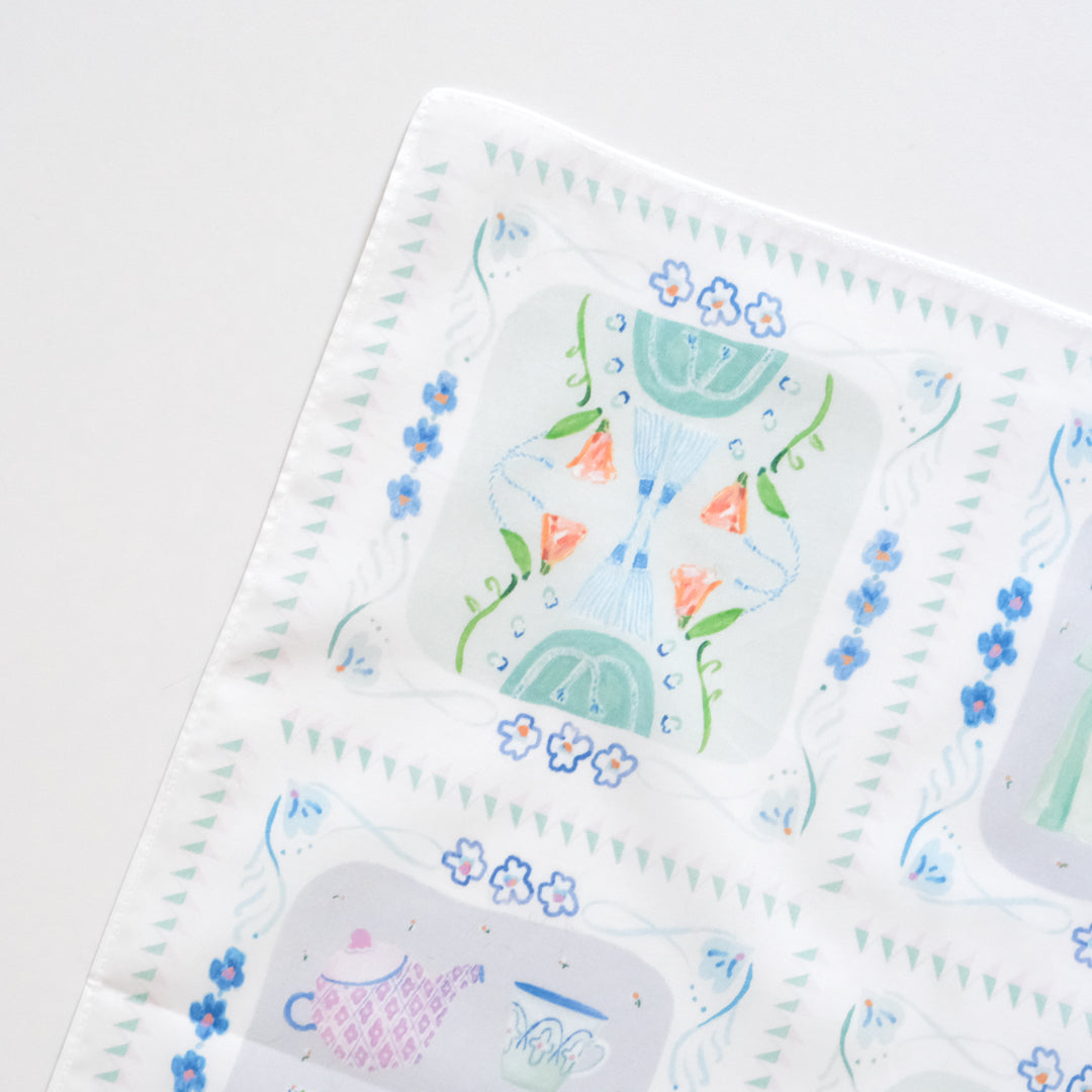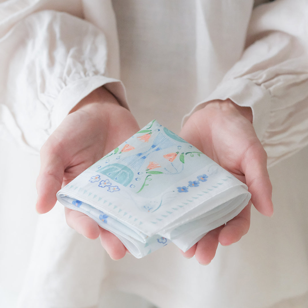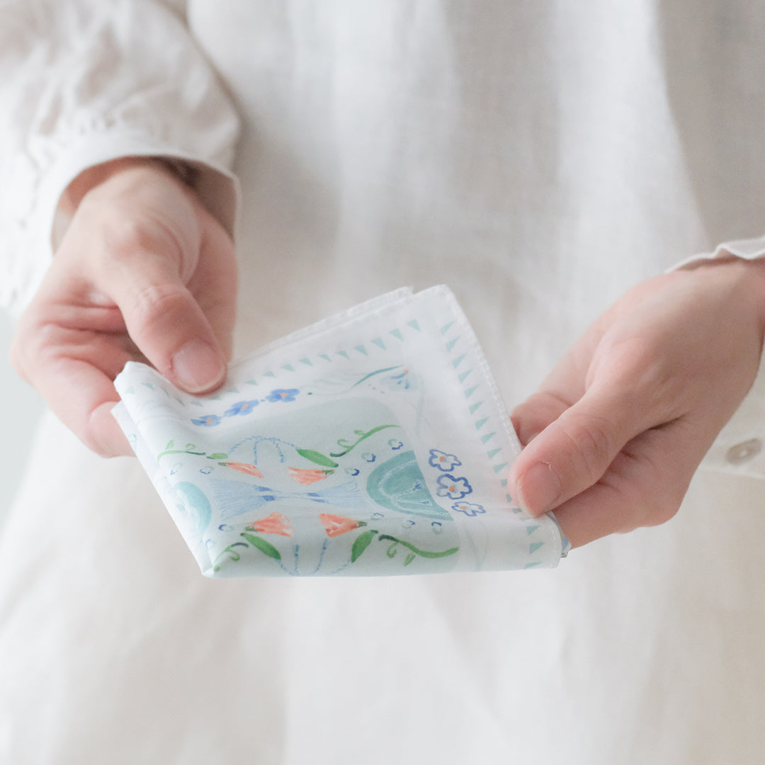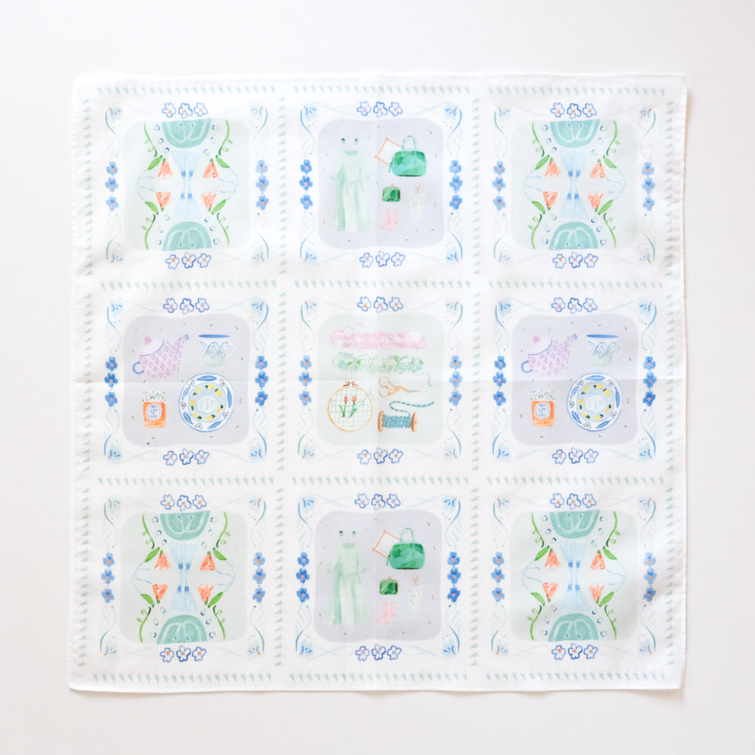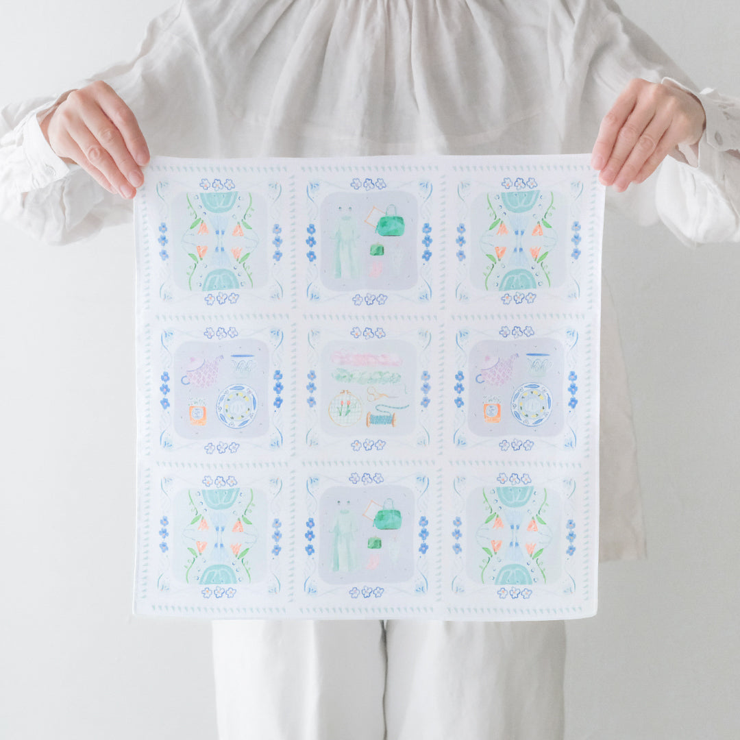 ハンカチとしてはもちろん、目隠しにしたり、お弁当を包んだり、スカーフのように鞄に巻き付けたり。淡く華やか色使いのイラストは、日常の中でふと目に入るとふわっとした高揚感に包まれます。