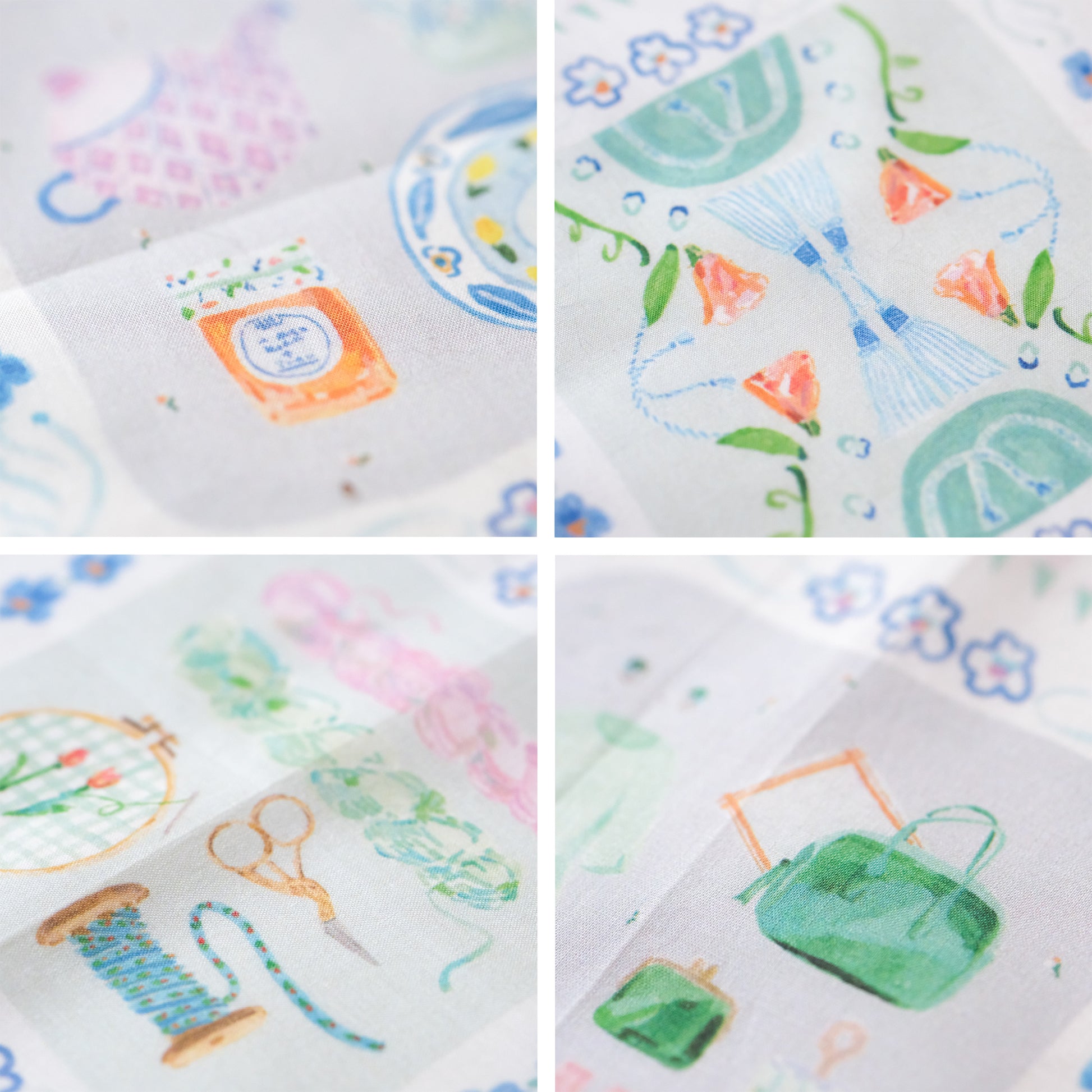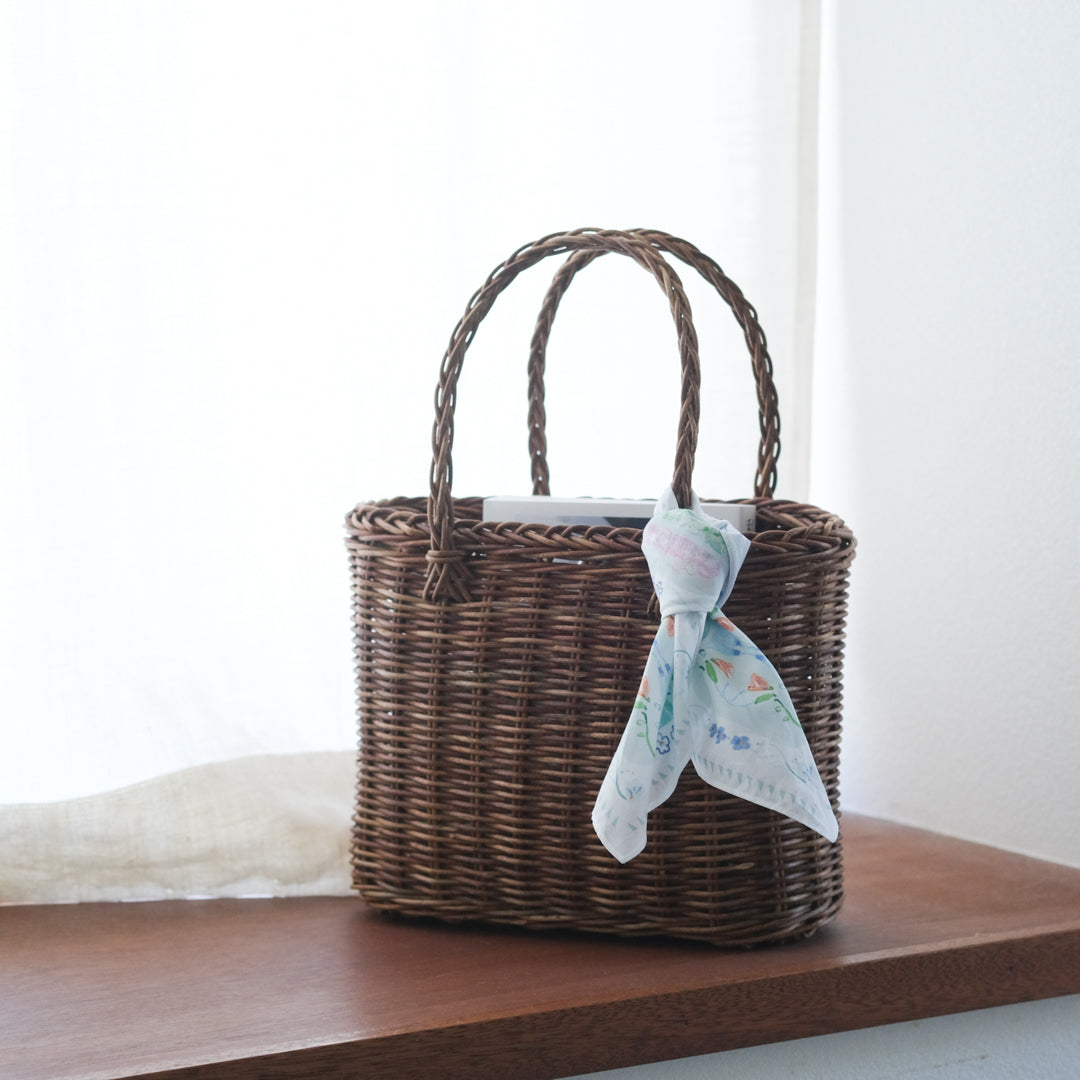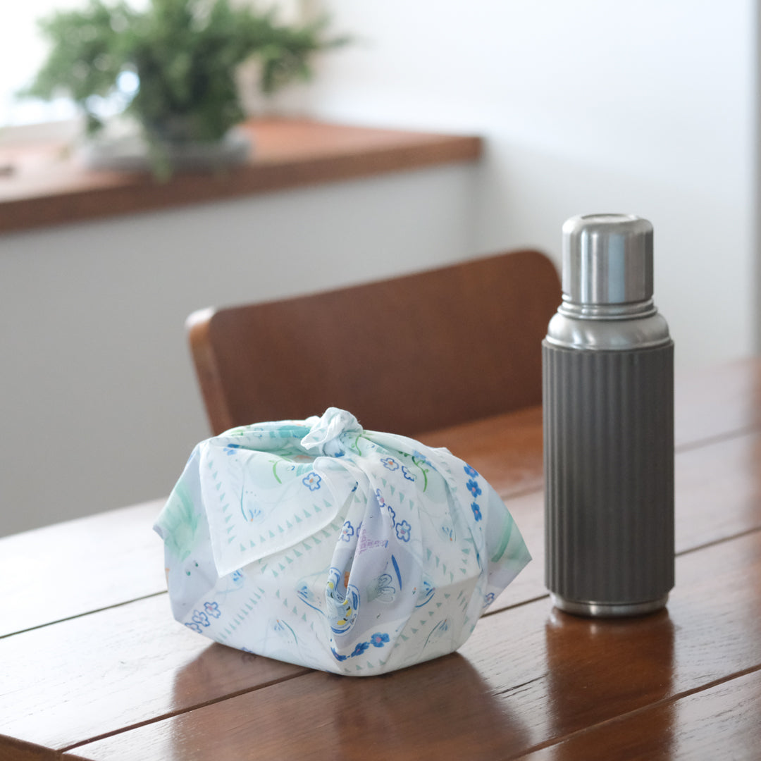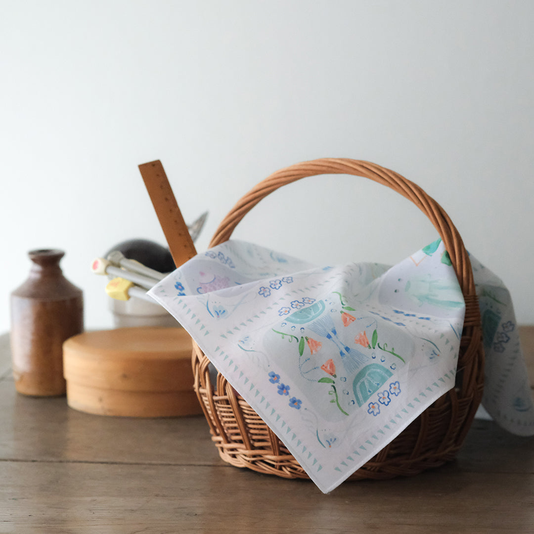 ハンカチとしてはもちろん、目隠しにしたり、お弁当を包んだり、スカーフのように鞄に巻き付けたり。淡く華やか色使いのイラストは、日常の中でふと目に入るとふわっとした高揚感に包まれます。