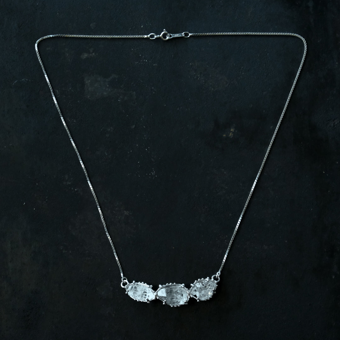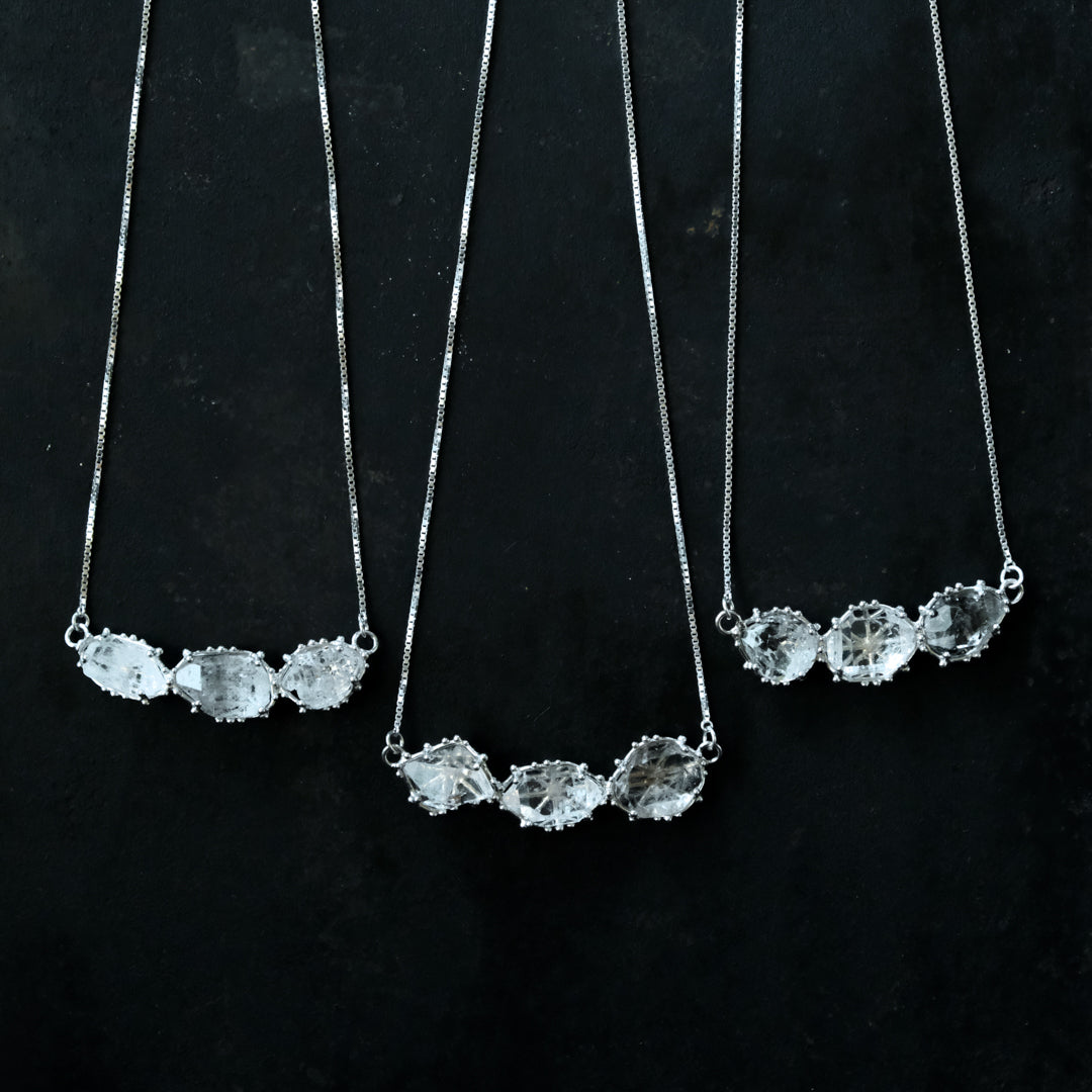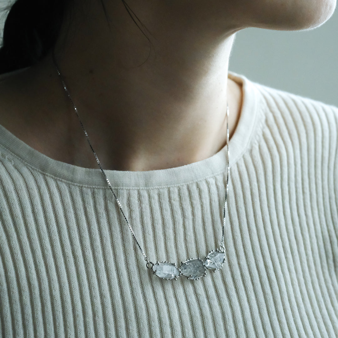 3粒の原石水晶をシルバーで包み込んだ首飾り。石一つ一つの個性を見極めながらアクセサリーに仕立てます。光の加減で変わる煌きが胸元を華やかに演出。デザインは同じでも石のかたちが異なりますので、お好みのものをお選びください。