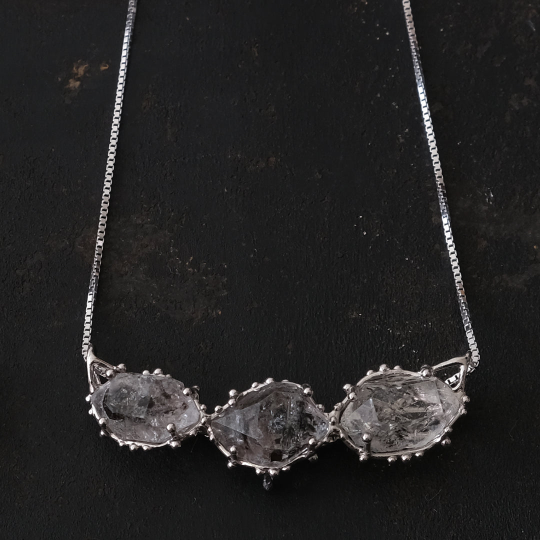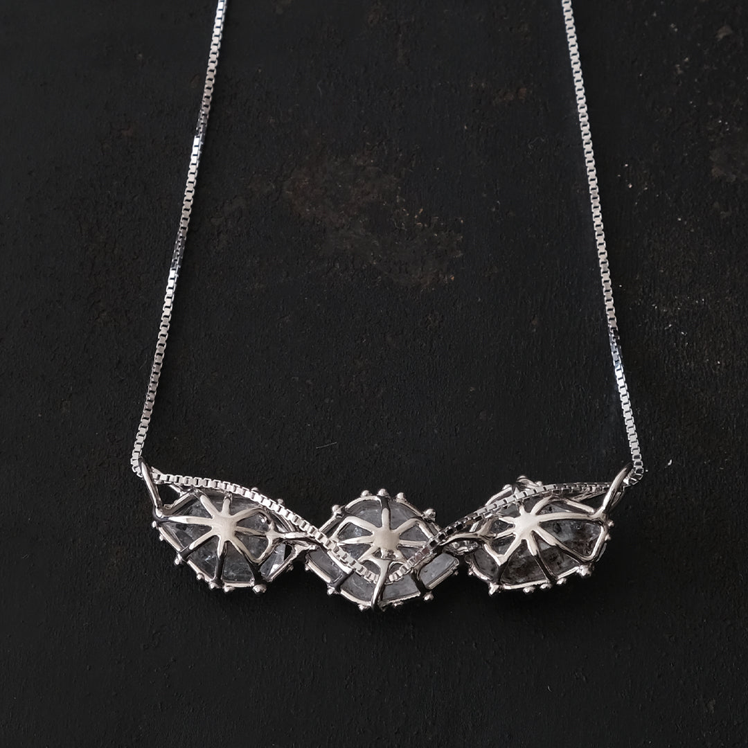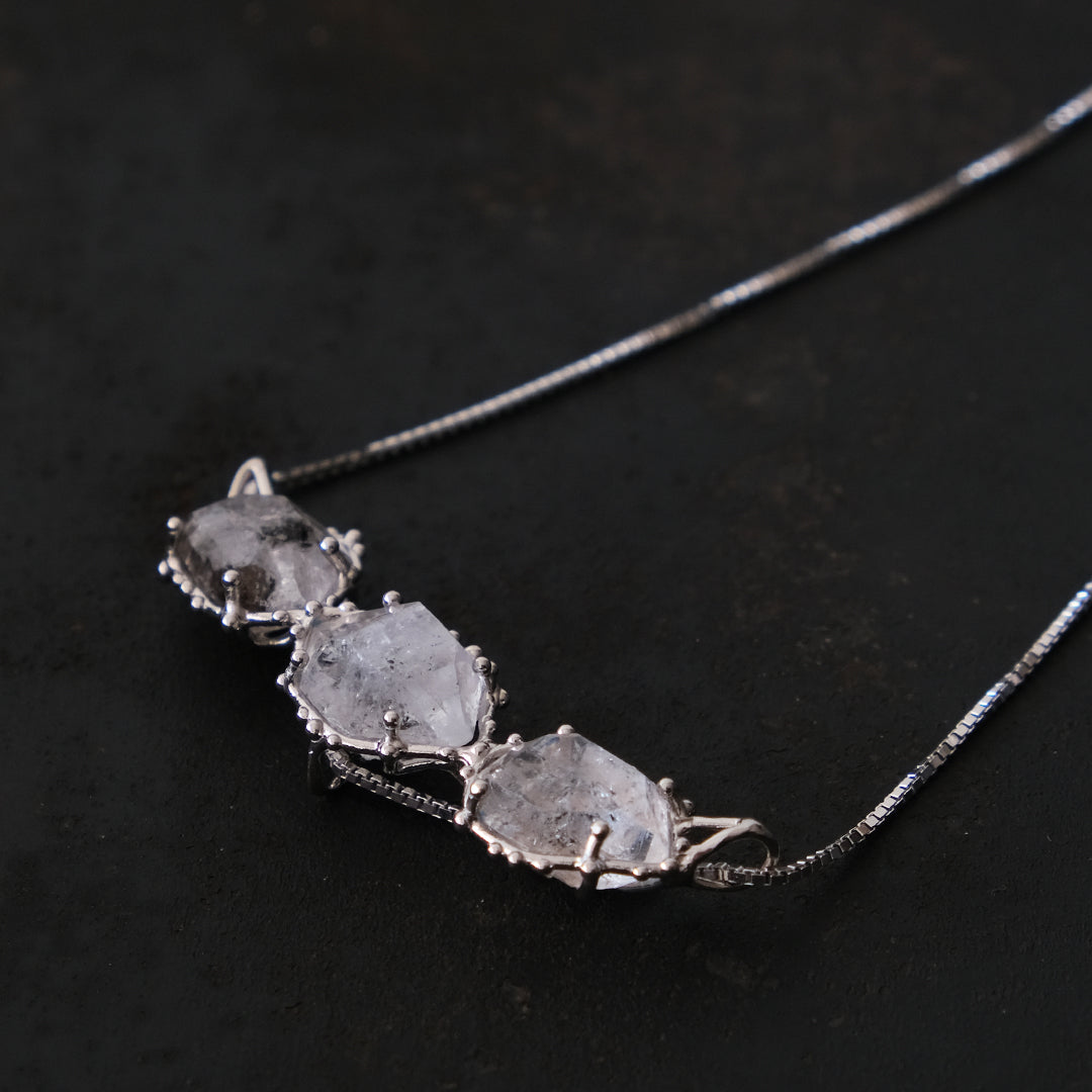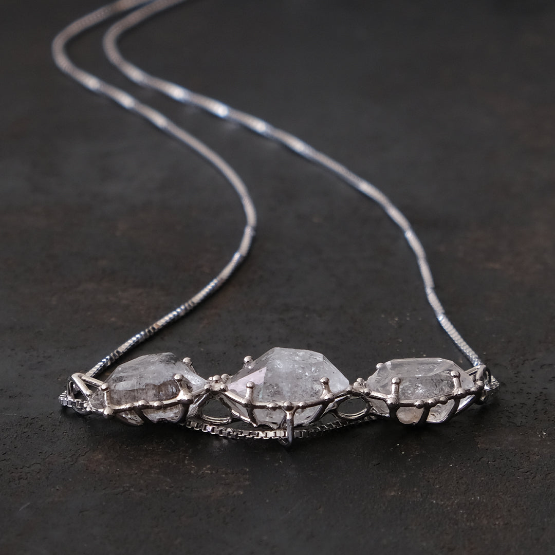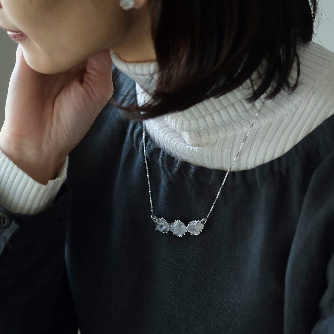 3粒の原石水晶をシルバーで包み込んだ首飾り。石一つ一つの個性を見極めながらアクセサリーに仕立てます。