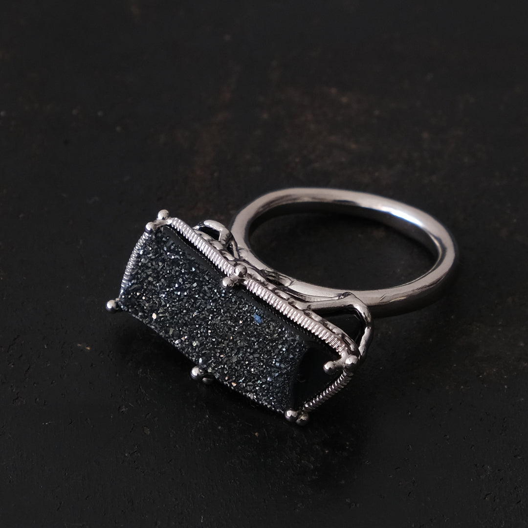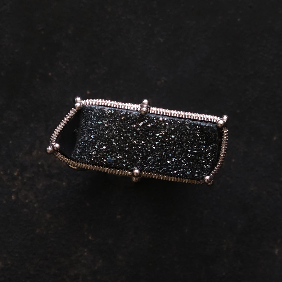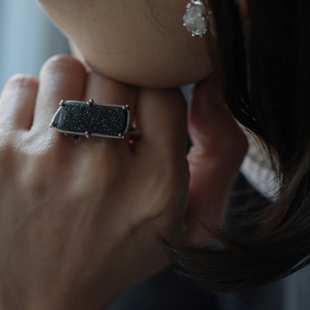 石の上に結晶した水晶が輝く、オニキスジオードのリング。スクエアの石を横位置に配し、シルバーの石座で包んだリングです。