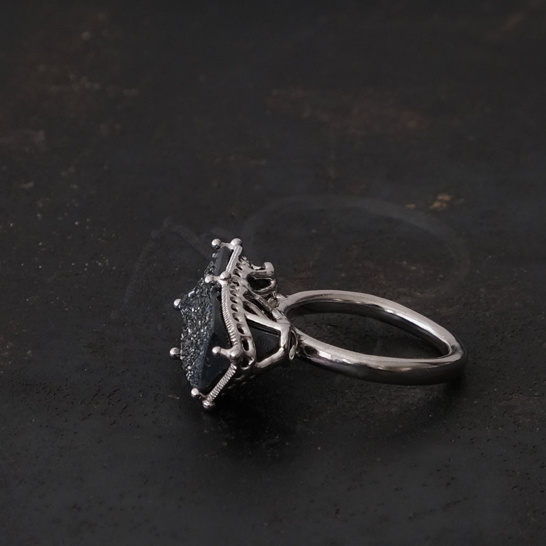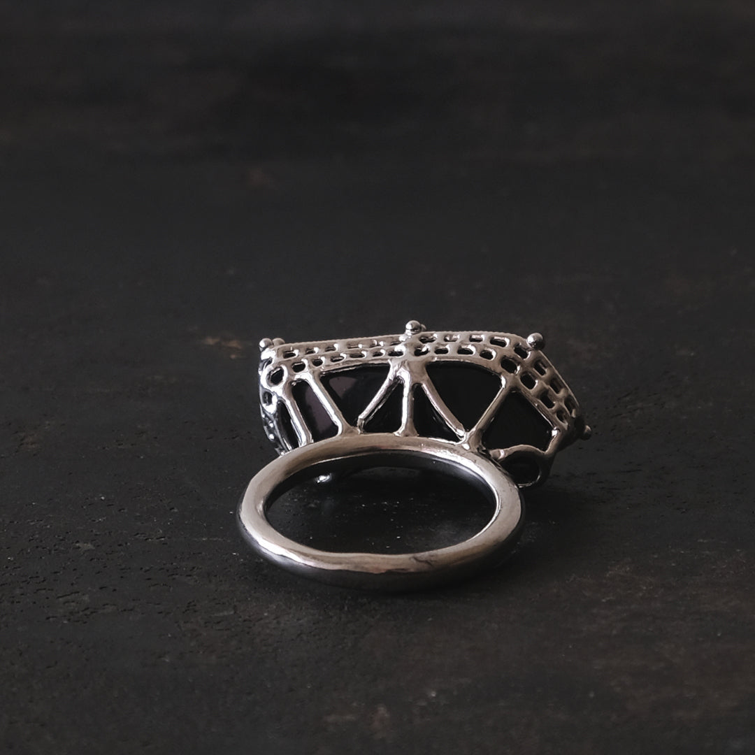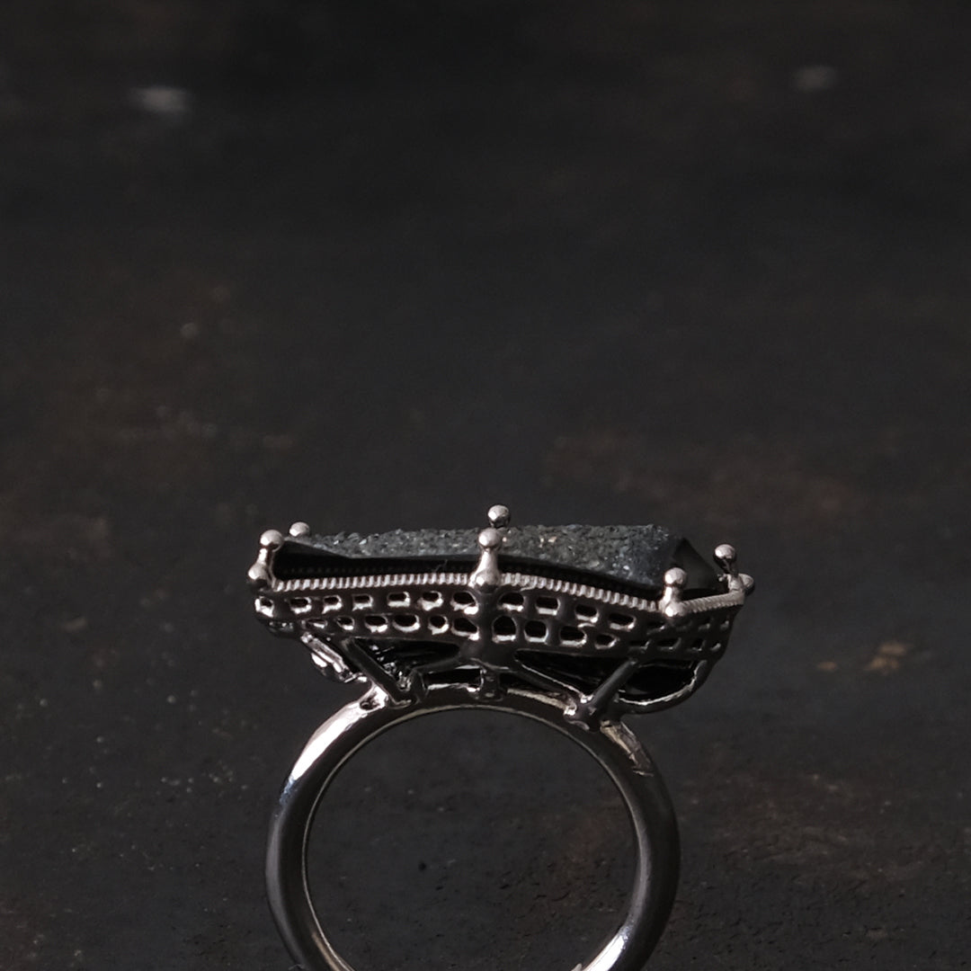 石の上に結晶した水晶が輝く、オニキスジオードのリング。スクエアの石を横位置に配し、シルバーの石座で包んだリングです。