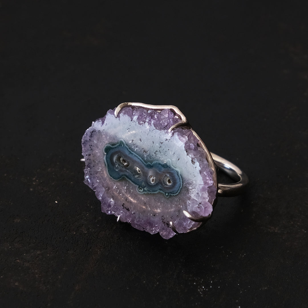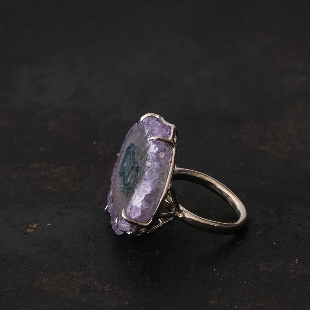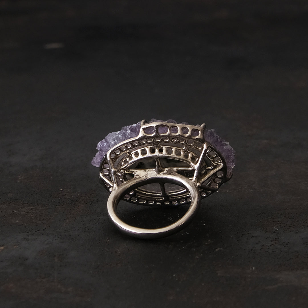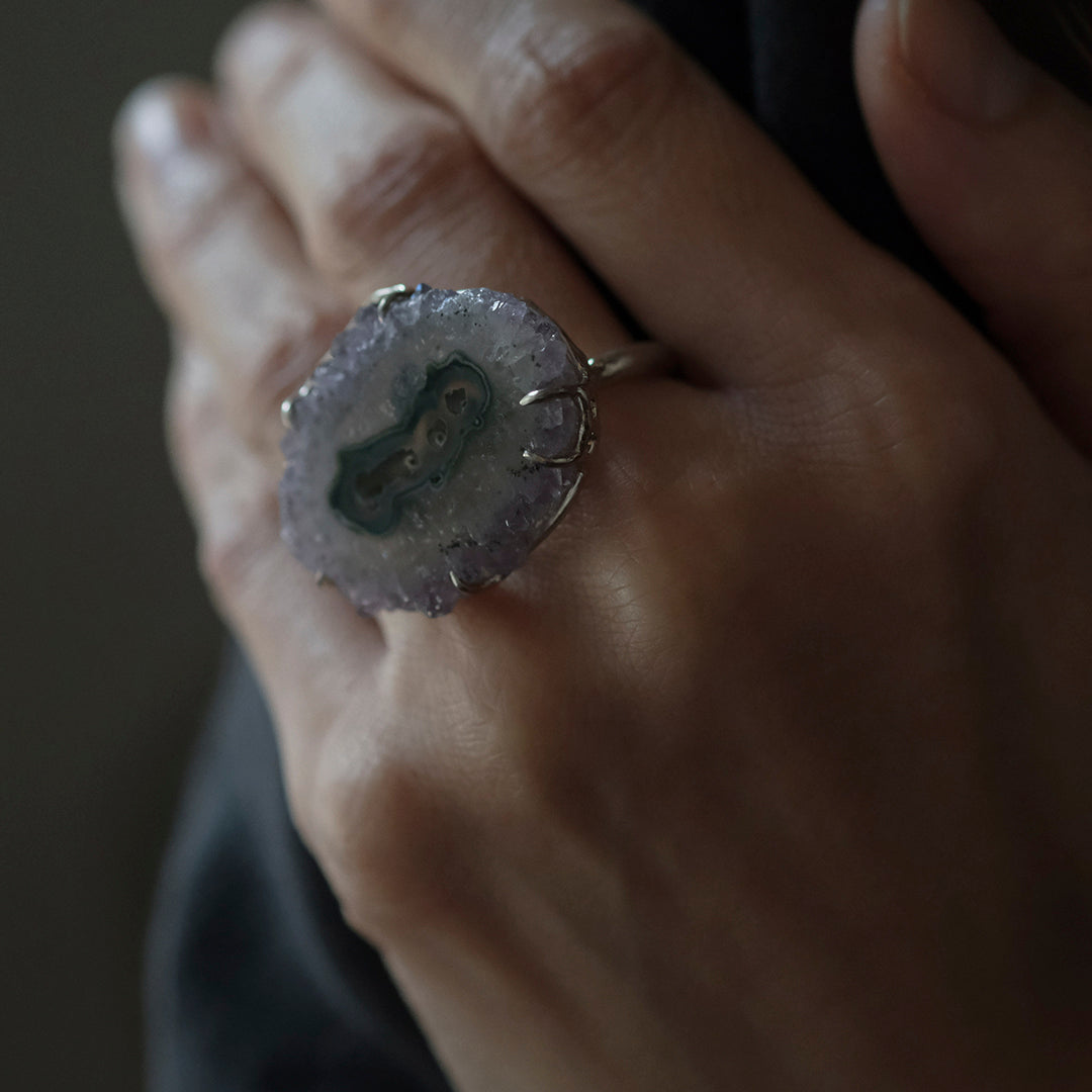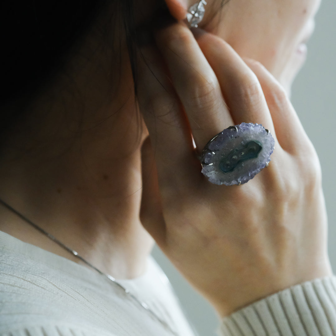 花弁のような結晶と紫のグラデーションが美しい「フラワーアメシスト」のリング。