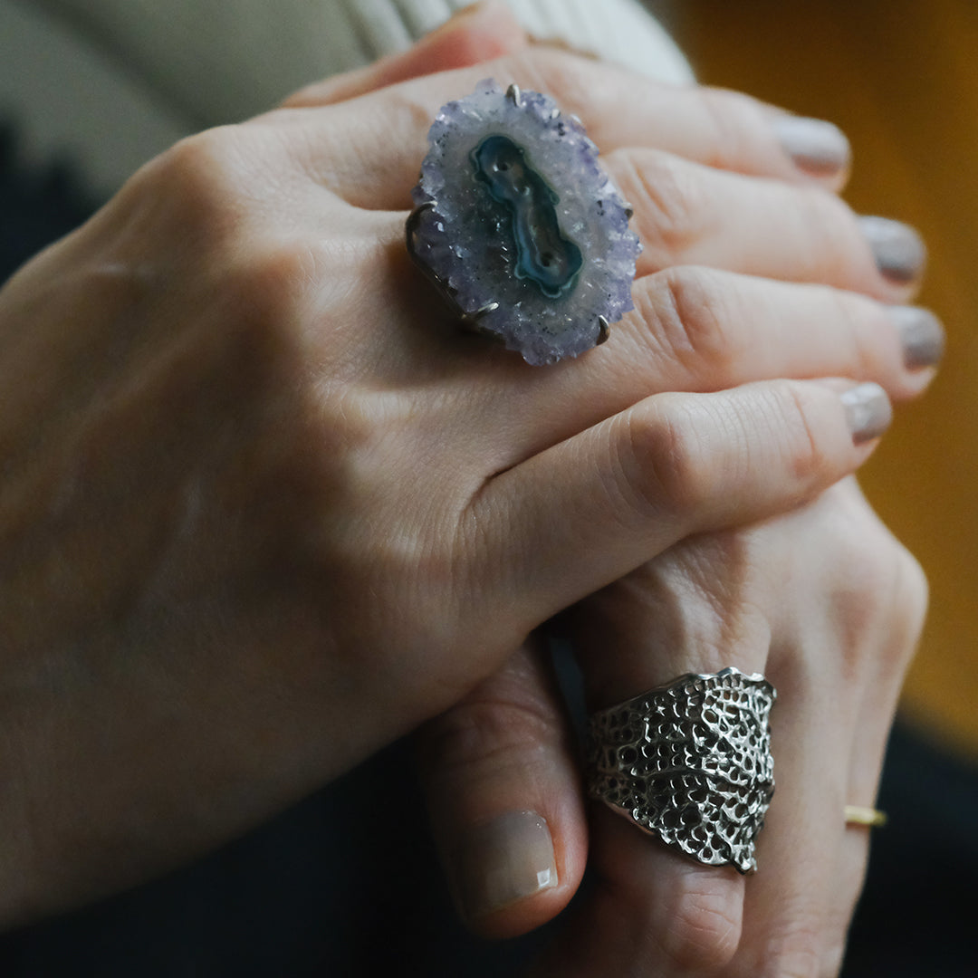 石の個性に合わせてシルバーのフレームが装飾。目に触れない裏側の仕上げも美しく、石が鑑賞できるように、デザインされています。