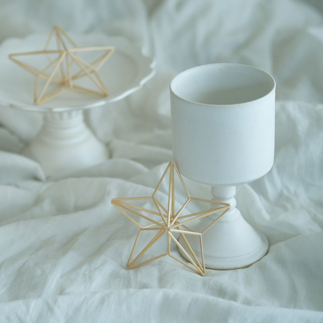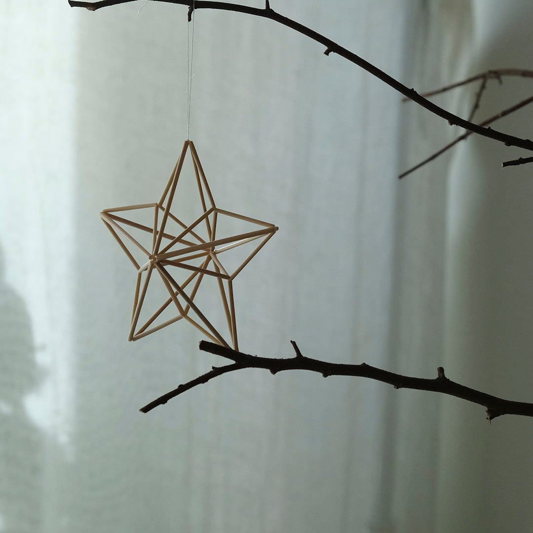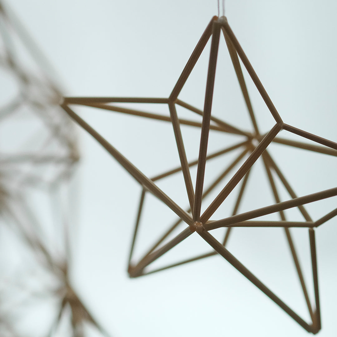 長野県の麦藁を糸でつなぎ、ひとつひとつつくられるeteläのヒンメリ。夜空に浮かぶ一番星のような、同じ大きさの三角形が折り重なってつくられる幾何学模様のShinanoは、その時々の空気と光を受けて美しく揺れます。