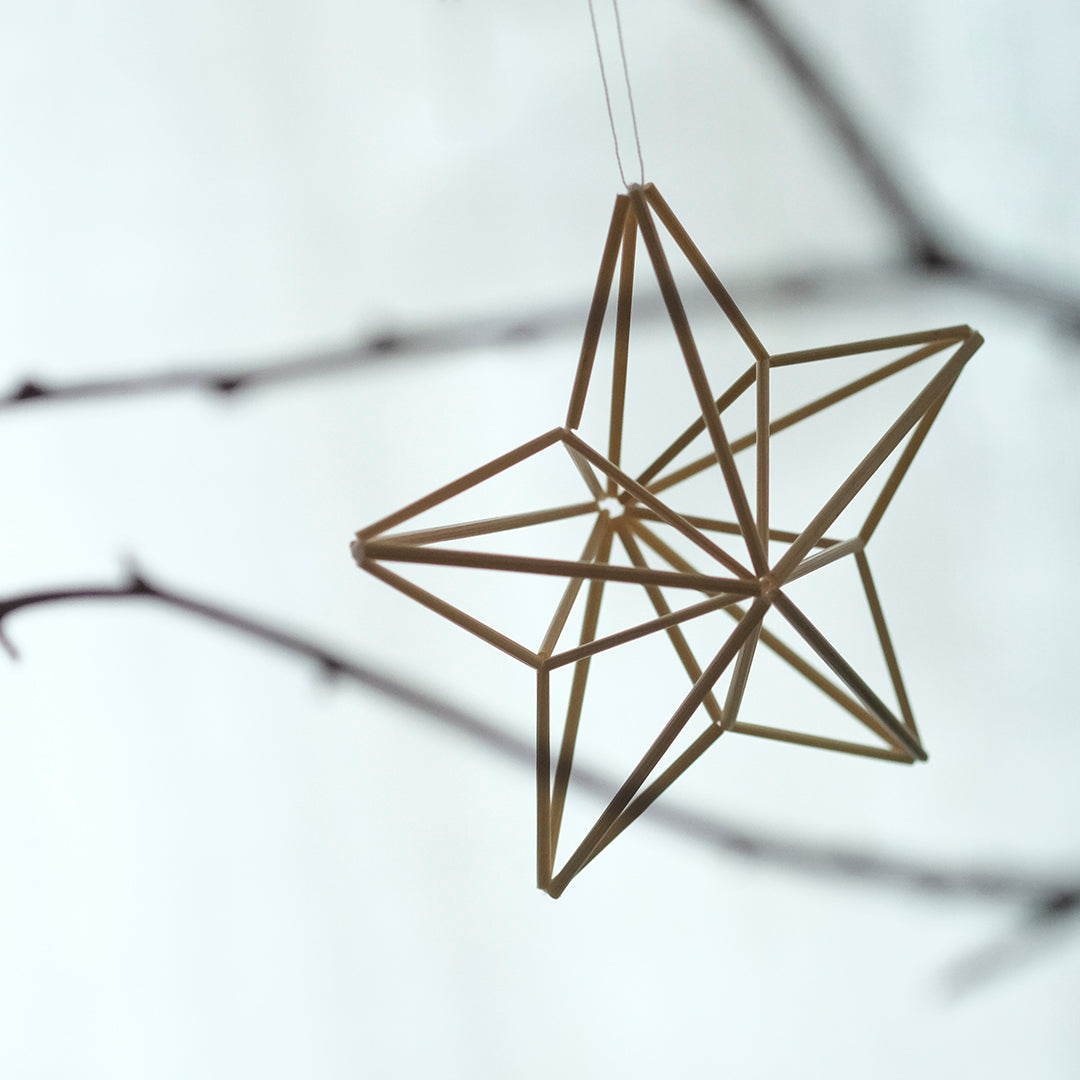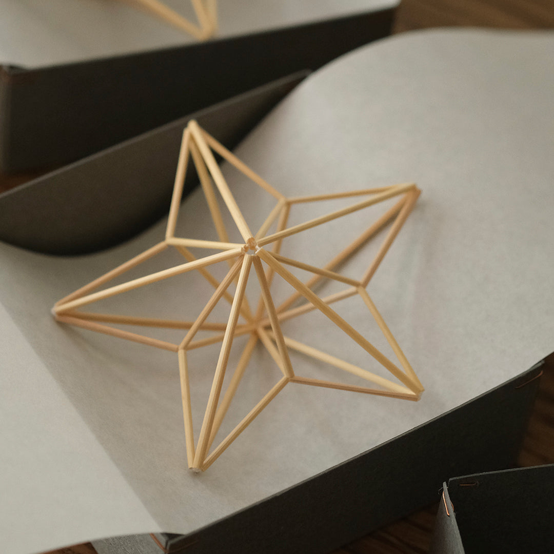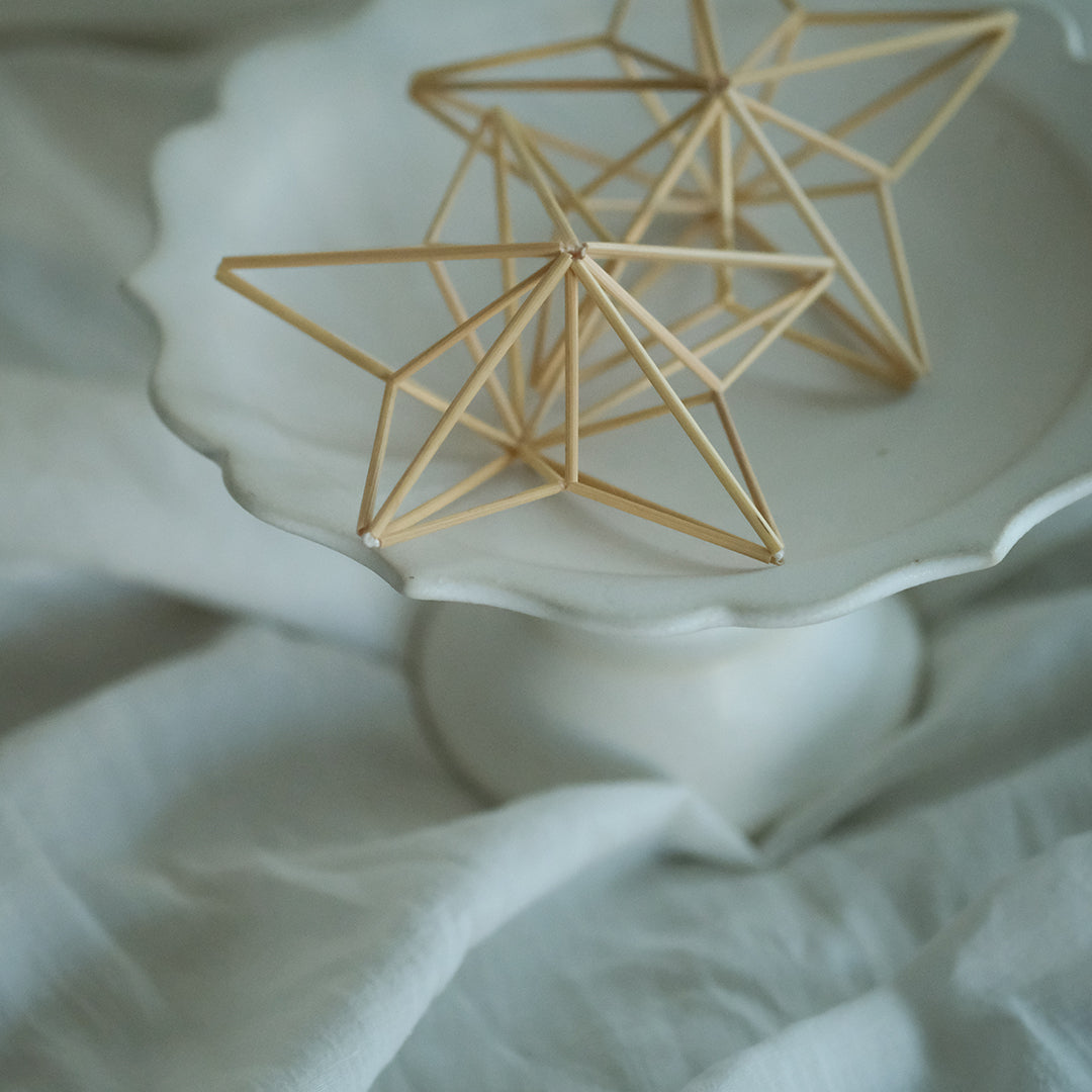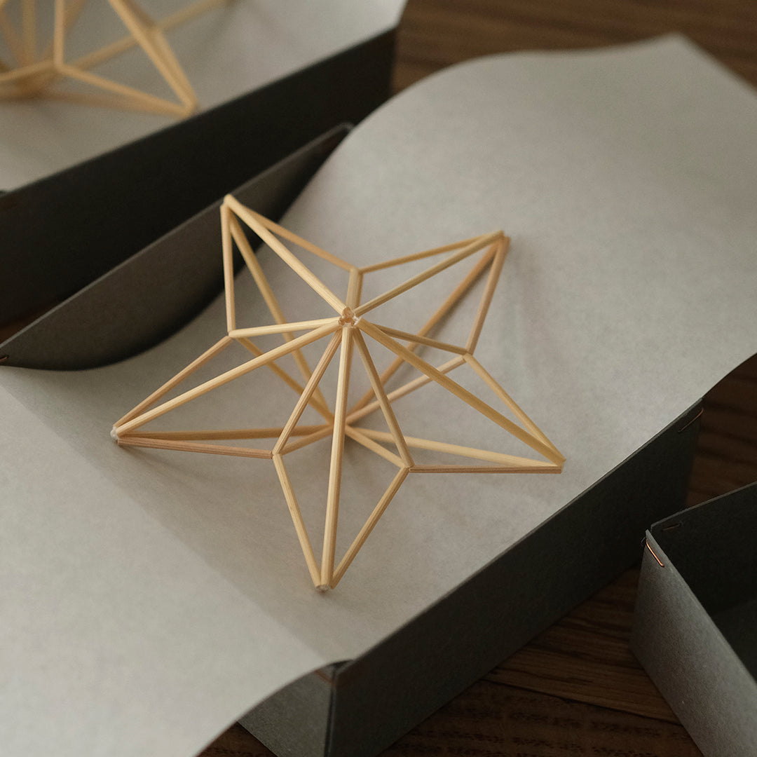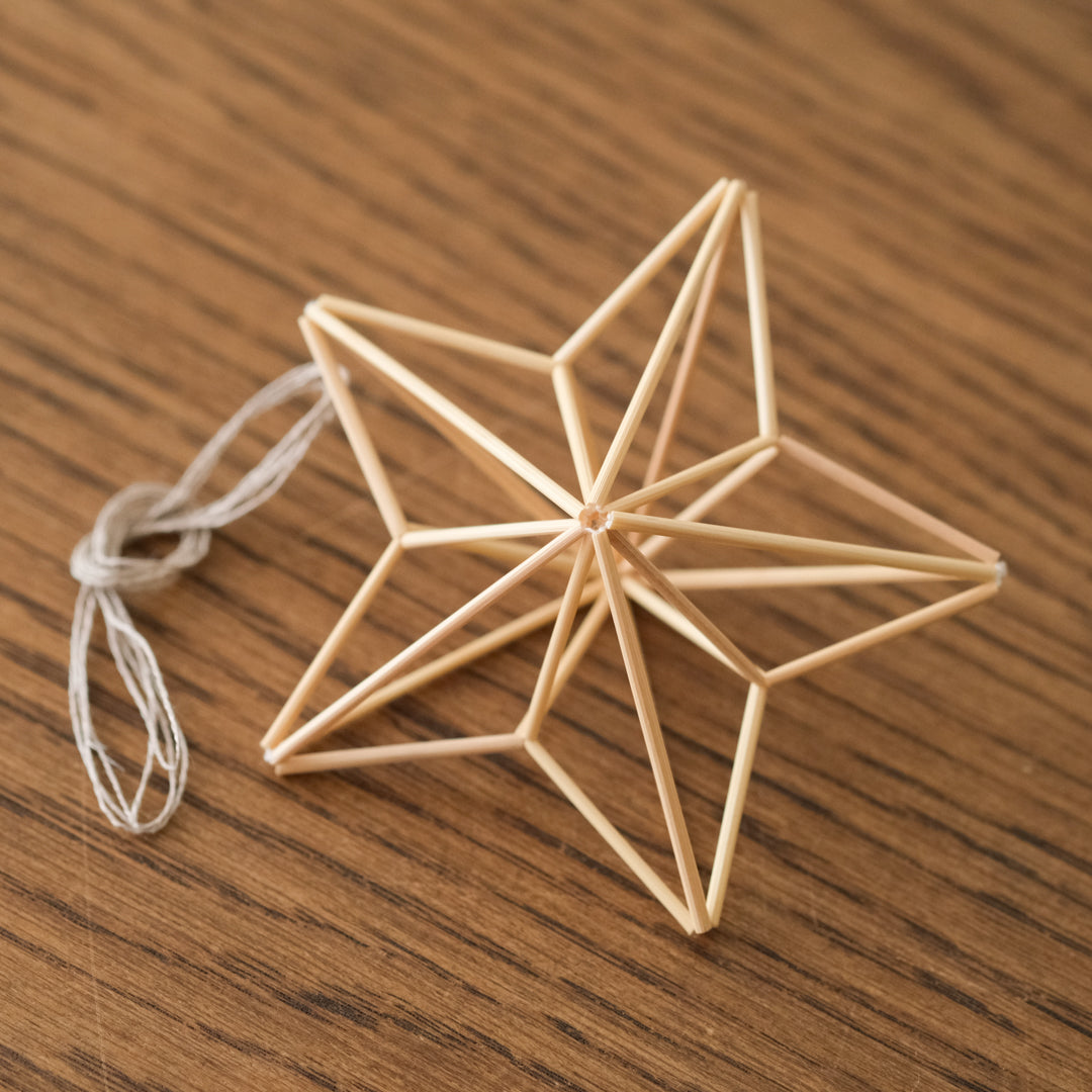 eteläの峯村みなみさんがオリジナルの図案でつくる「Shinano」は、同じ大きさの三角形が折り重なった幾何学模様のヒンメリ。素朴な麦藁で、夜空に浮かぶ一番星のような象徴的な形がつくられています。