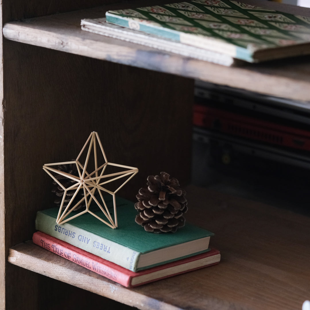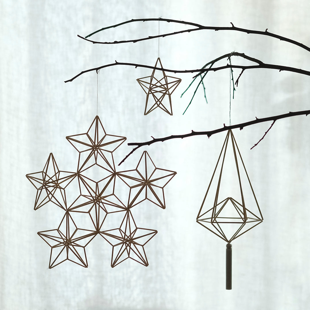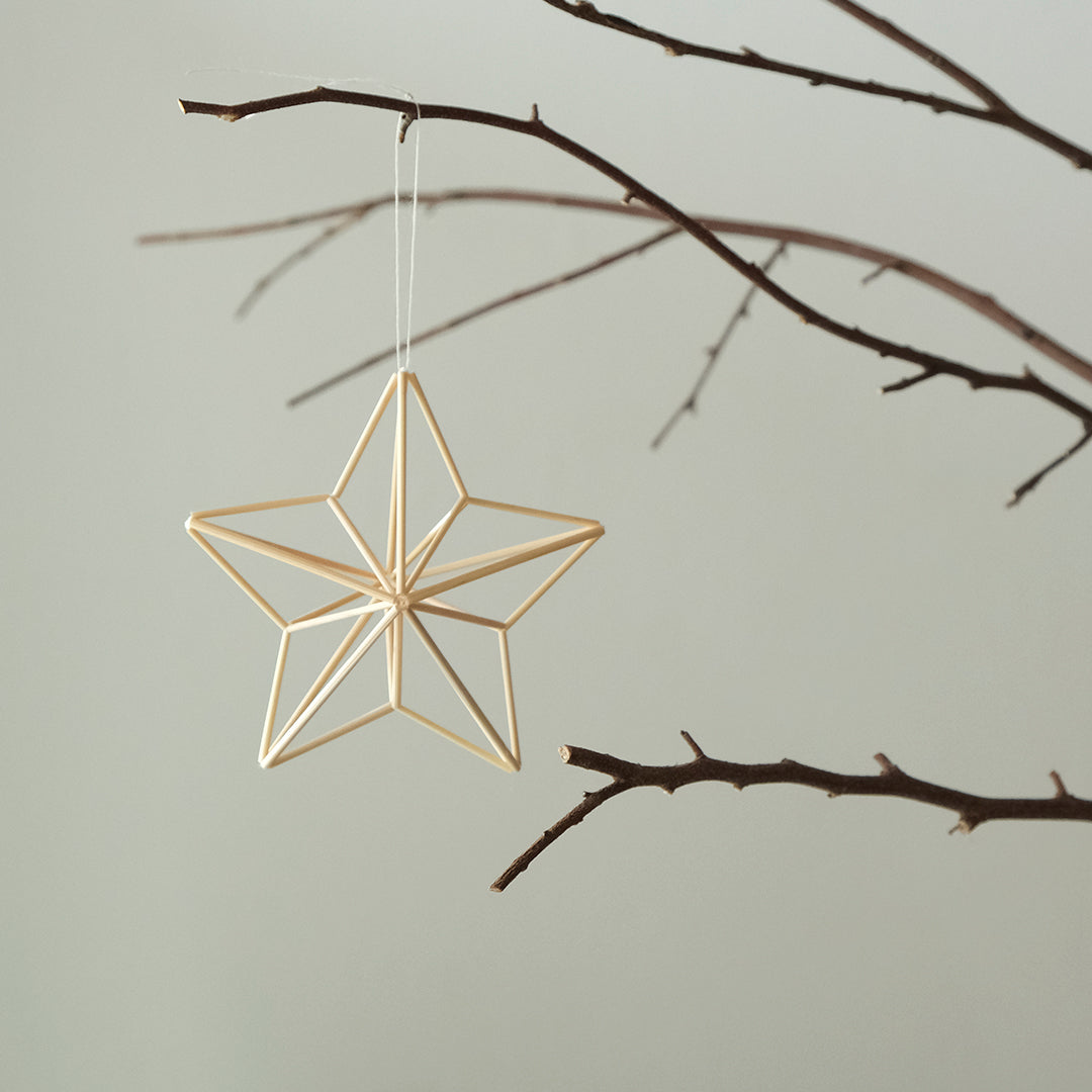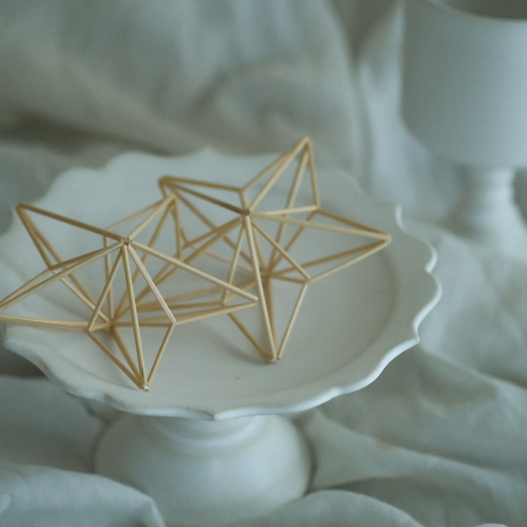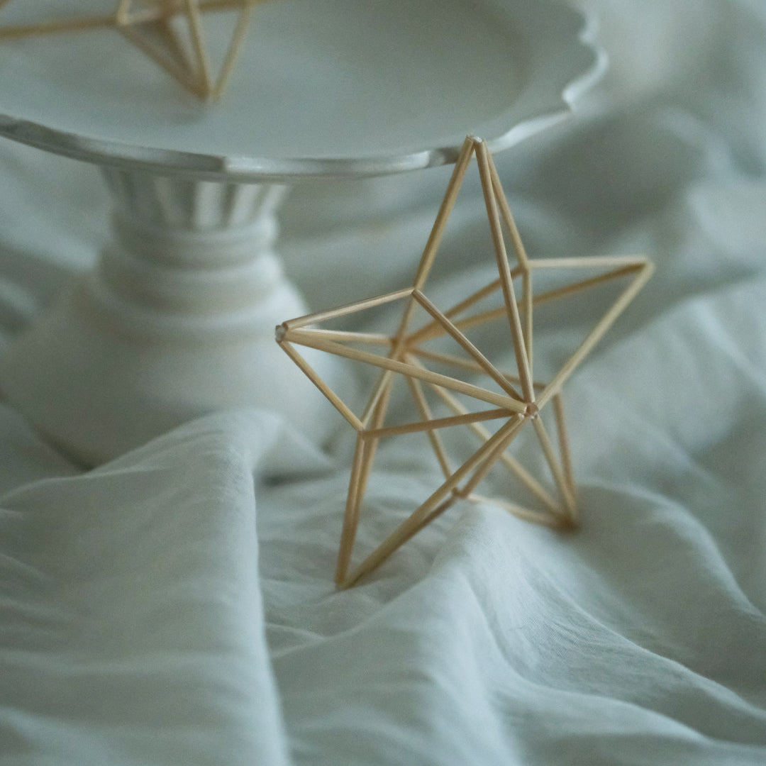 eteläの峯村みなみさんがオリジナルの図案でつくる「Shinano」は、同じ大きさの三角形が折り重なった幾何学模様のヒンメリ。素朴な麦藁で、夜空に浮かぶ一番星のような象徴的な形がつくられています。