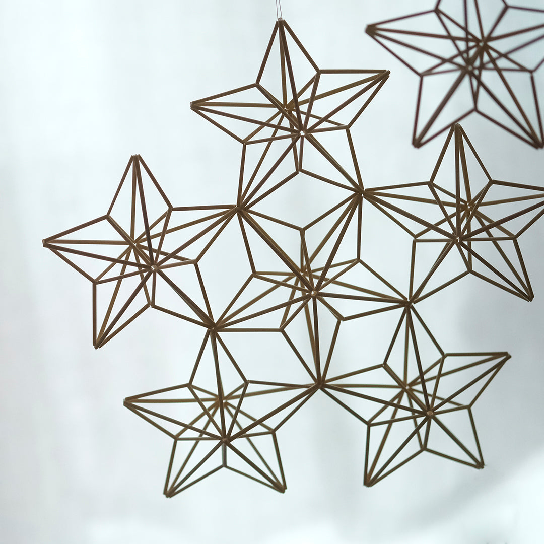 長野県の麦藁を糸でつなぎ、ひとつひとつつくられるeteläのヒンメリ。冬の澄んだ空気に浮かんでいるような、三角形が折り重なってできた幾何学模様の「星影の夜」は、その時々の空気と光を受けて美しく揺れます。